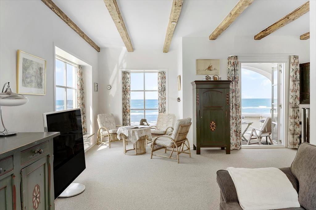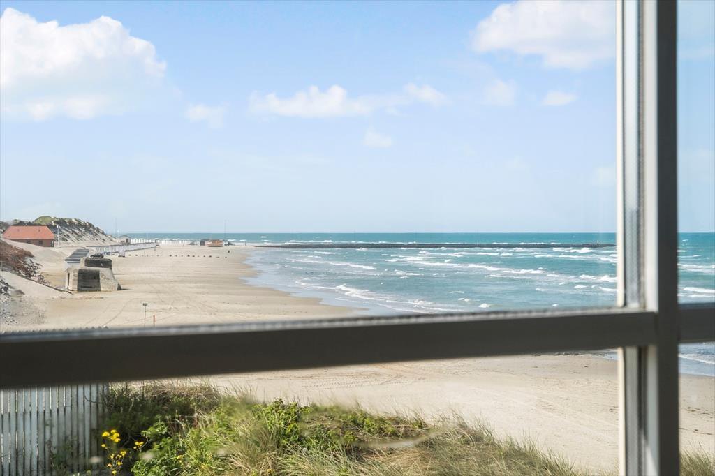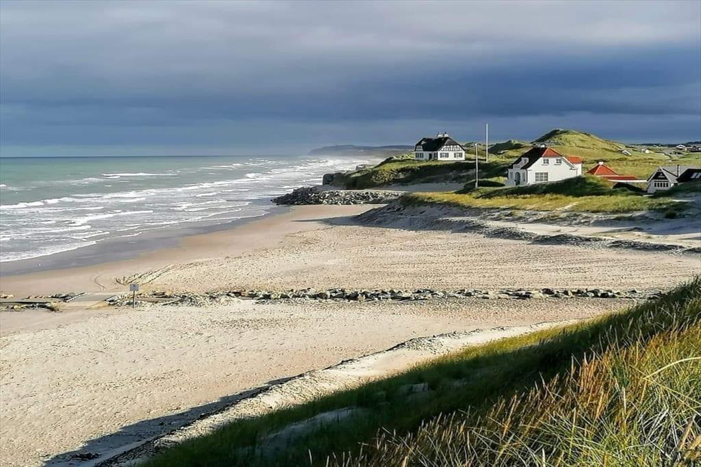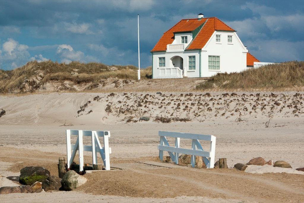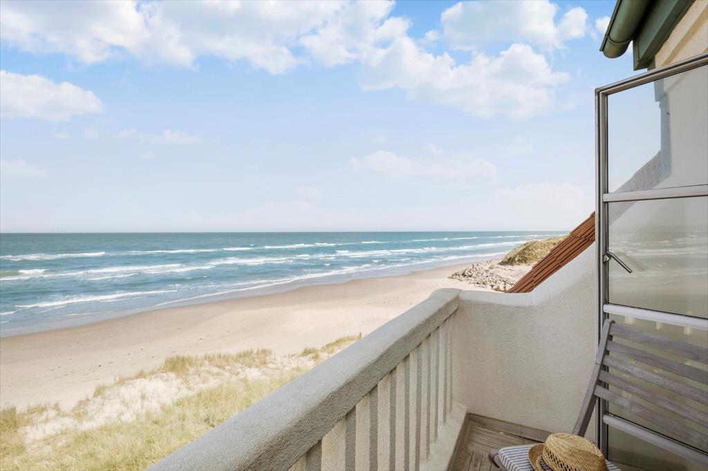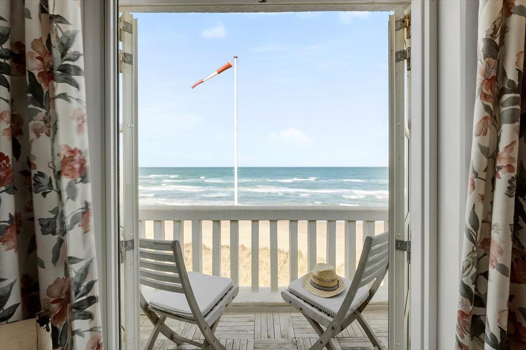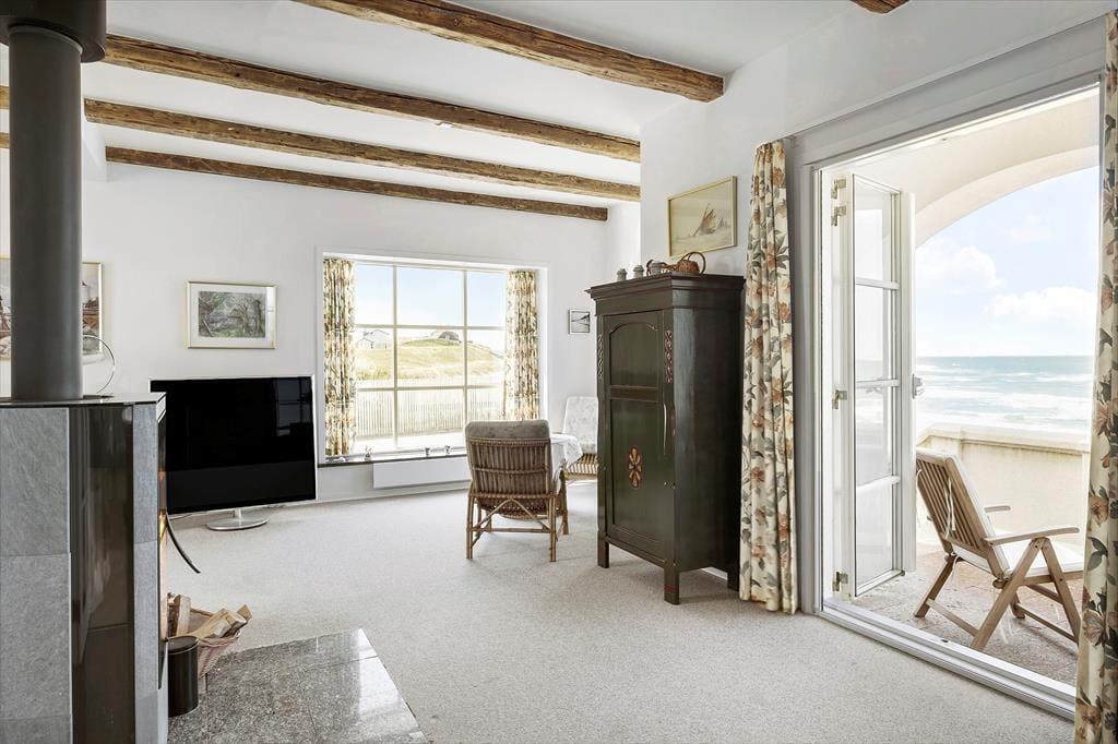 Sommerhuset ligger godt hævet over stranden på den kystsikrede grund, så I har et flot panoramavue over Vesterhavet og kyststrækningen fra den syd- og vestvendte del af terrassen. I kan også sætte jer på østsiden af huset, hvis I vil drikke kaffe i morgensolen eller søge læ for havbrisen.