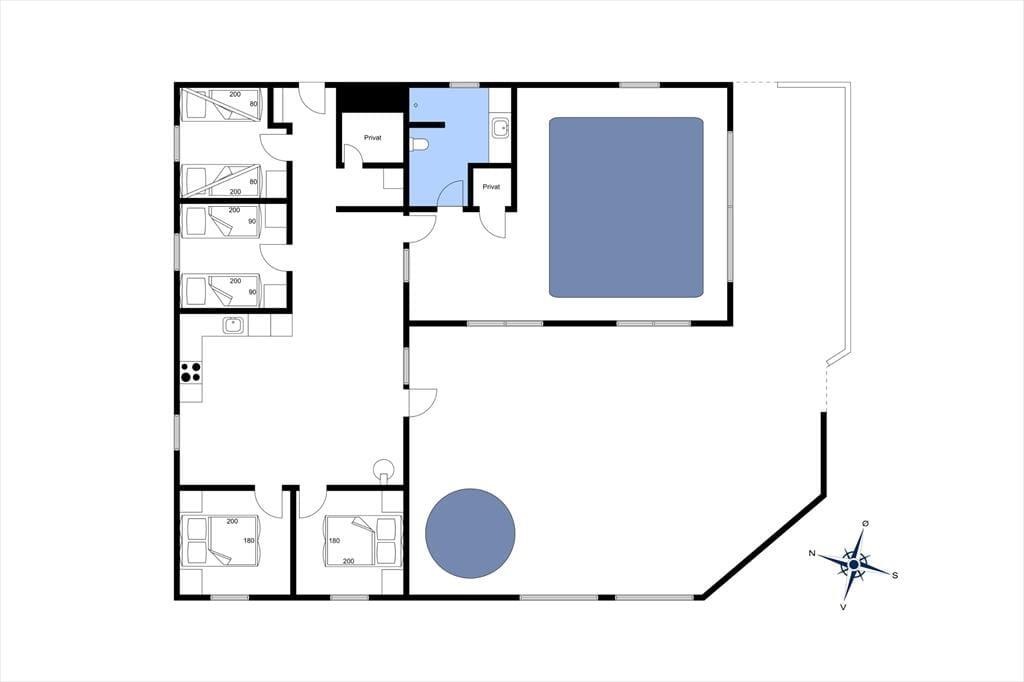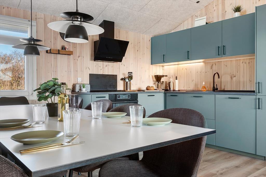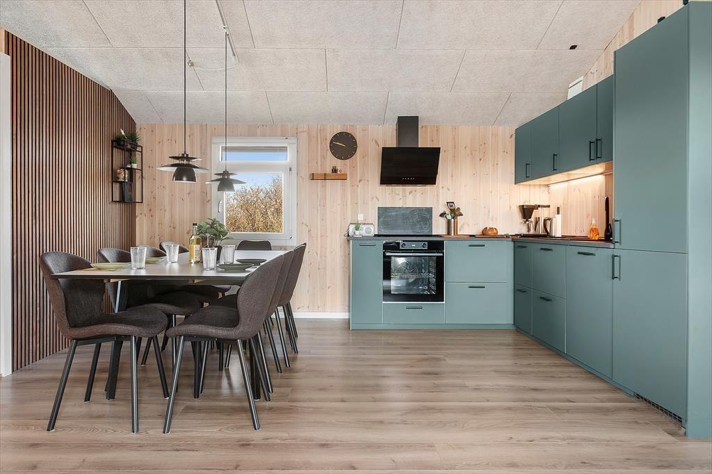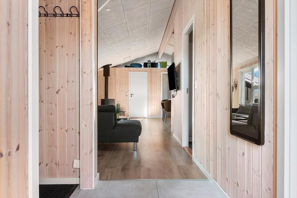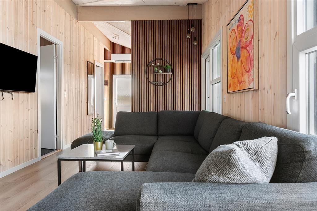Det moderne sommerhus er indrettet med fokus på lys og rummelighed. Den åbne planløsning, hvor køkken og stue er forbundet, skaber et naturligt samlingspunkt for familien. I det veludstyrede køkken kan du trylle lækre måltider, mens du samtidig er en del af samtalerne omkring spisebordet. Stuen er et hyggeligt rum med komfortable møbler, hvor du kan slappe af og nyde varmen fra brændeovnen efter en lang dag. Sommerhuset har fire lyse soveværelser, som gør det muligt for op til 10 personer at overnatte, og det rummelige badeværelse tilbyder komfort og ro. For ekstra velvære kan du hoppe direkte i den private pool eller tage et afslappende bad i vildmarksbadet på terrassen.