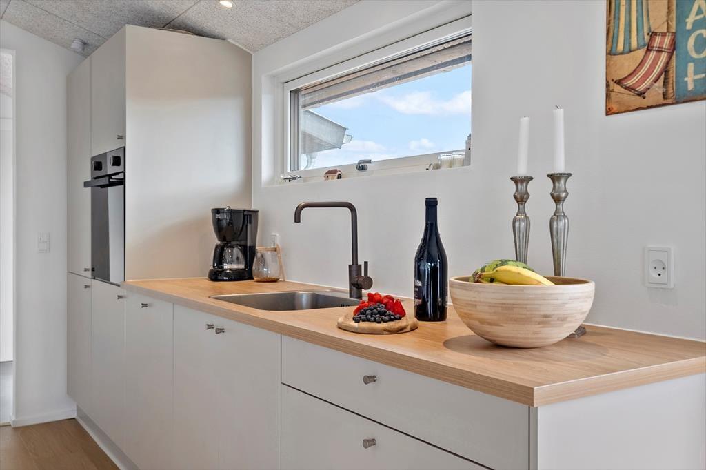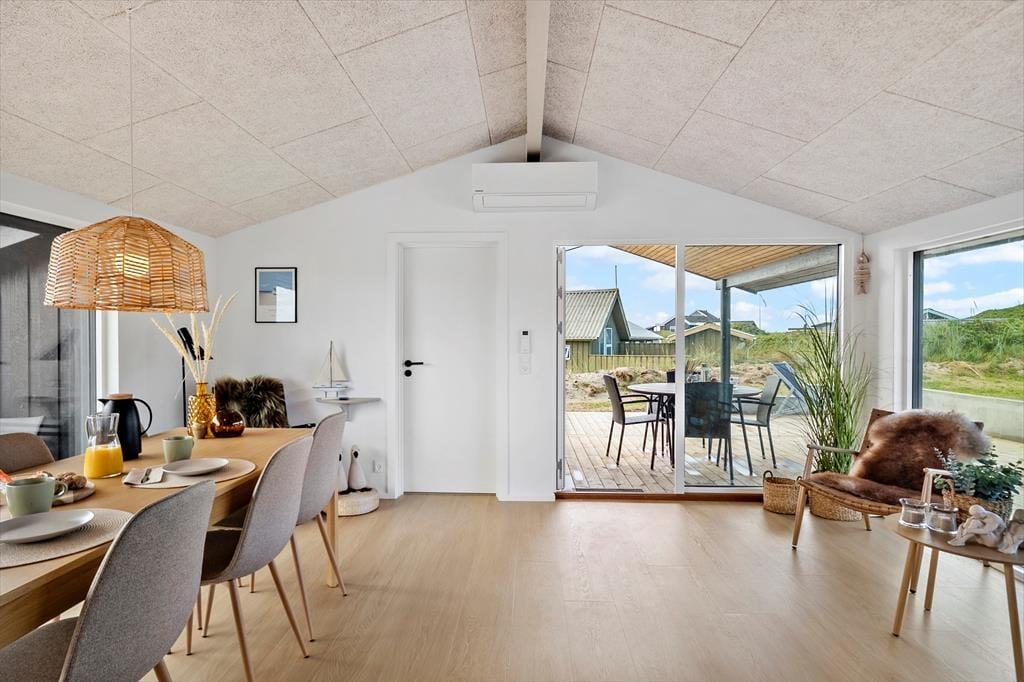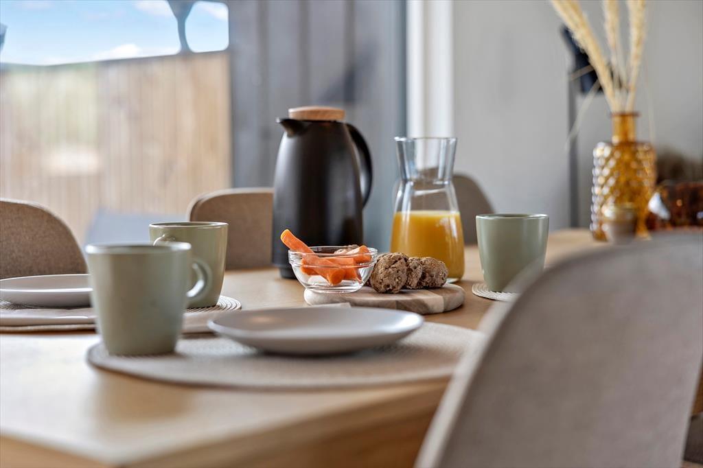 Indendørs bliver du mødt af en lys og behagelig atmosfære med en indretning, der lægger op til afslappet ferie i godt selskab. Opholdsrummet danner et naturligt samlingspunkt med køkken, spiseplads og stue i ét, så I kan lave mad, hygge og slappe af sammen uden at være adskilt. Her er højt til loftet – både i overført og bogstavelig forstand – og store vinduespartier lukker lyset ind og giver udsigt til de grønne omgivelser. Køkkenet er funktionelt og veludstyret, og stuen indbyder til både fællesskab og fordybelse, hvad enten det er med en god bog, brætspil eller en film på skærmen. Når dagens eventyr er forbi, er det rart med praktiske faciliteter som vaskemaskine og tørretumbler – og ikke mindst at kunne trække sig tilbage til rolige sovepladser og lade op til en ny feriedag.
