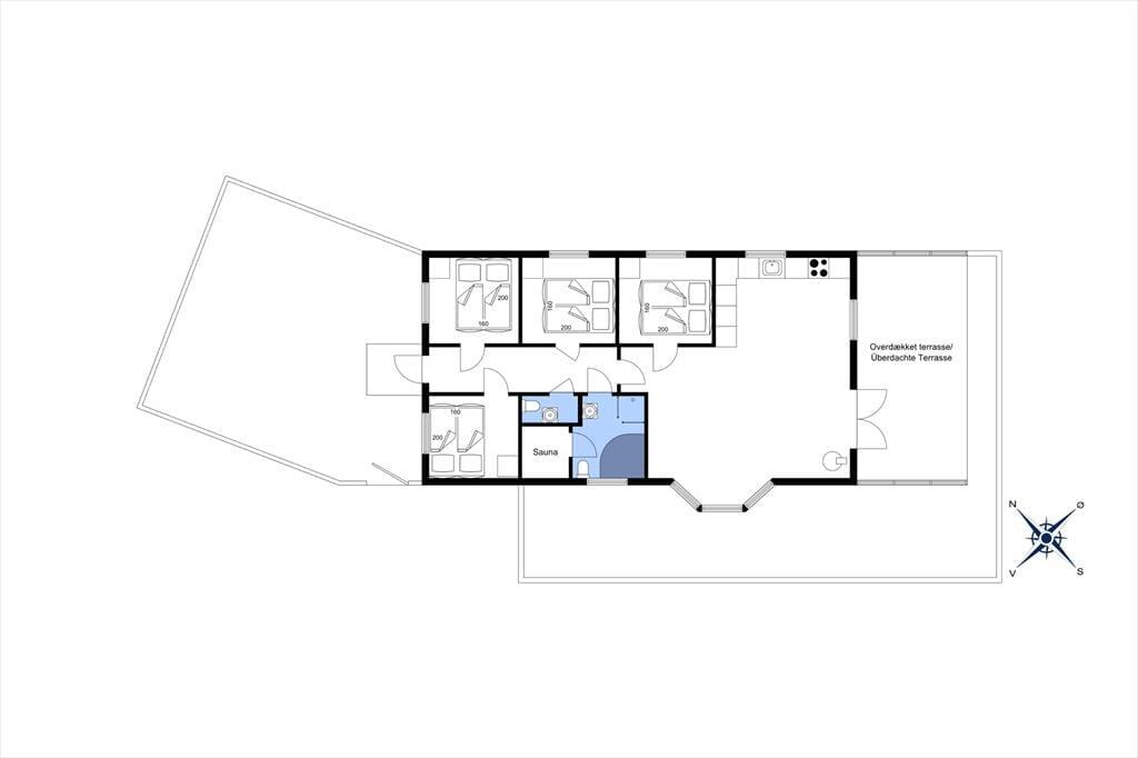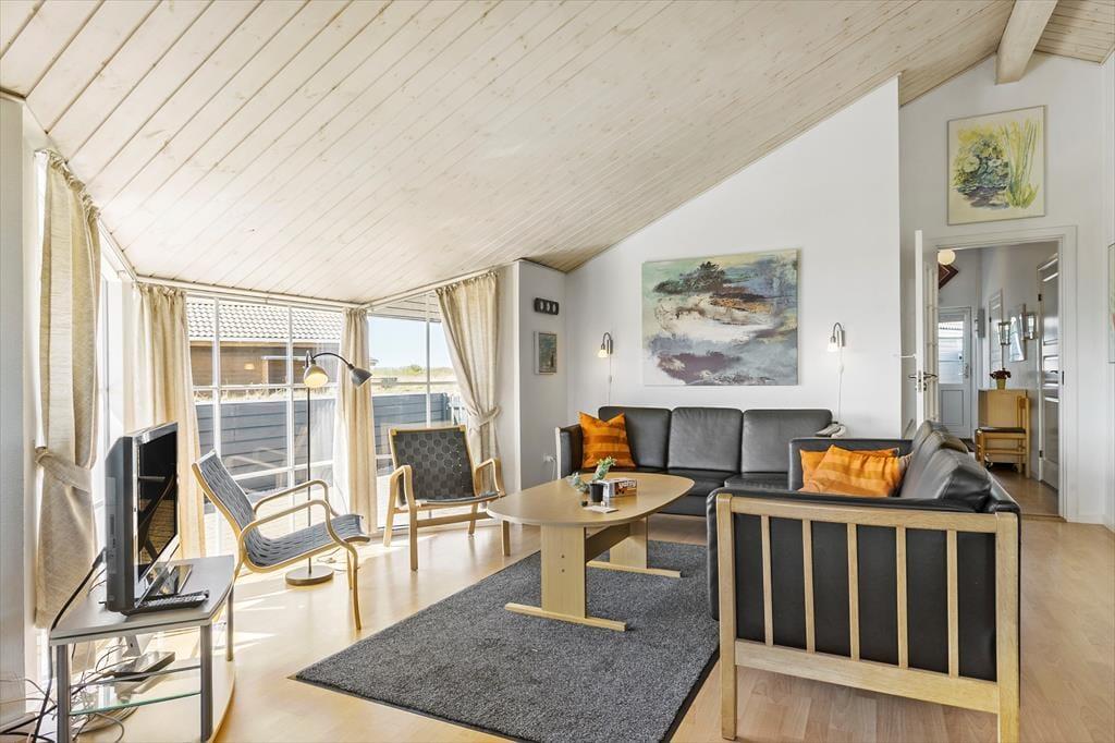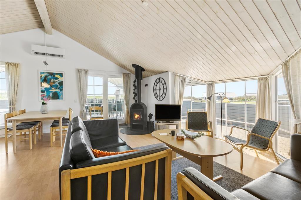 Omkring entreen ligger tre soveværelser, et gæstetoilet og badeværelset med brusekabine og et spabad, hvor man kan slappe af og lade kroppen få ny energi efter en lang dag på tur rundt i det nordjyske. Efter entreen kommer det sidste soveværelse og det åbne køkken- og opholdsrum. Køkkenet er godt udstyret med skabsplads og hårde hvidevarer, også vaskemaskine og tørretumbler, og man kan lukke op til terrassen og tage maden med udenfor på de varme dage. Stuen er domineret af et sofaarrangement foran tv’et og brændeovnen og lægger op til mange afslappende og hyggelige stunder i familiens tegn. Der er en varmepumpe, som sikrer en behagelig temperatur i opholdsrummet, og endelig har man adgang til husets trådløse internetforbindelse, så det er en god ide at medbringe pc eller tablet hjemmefra.