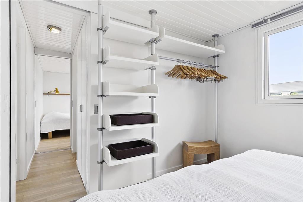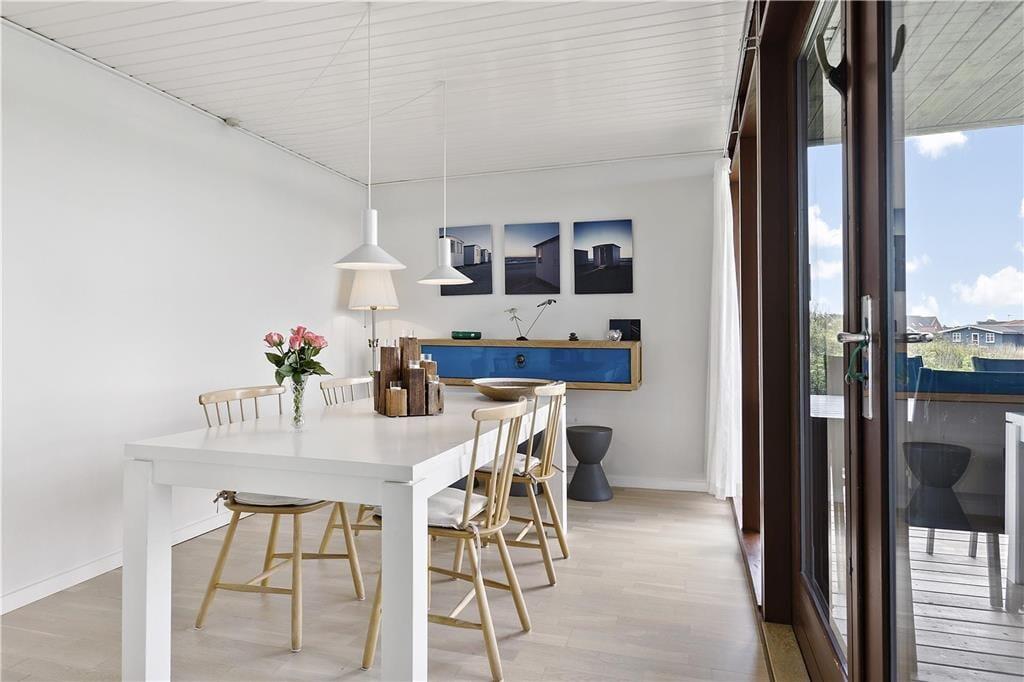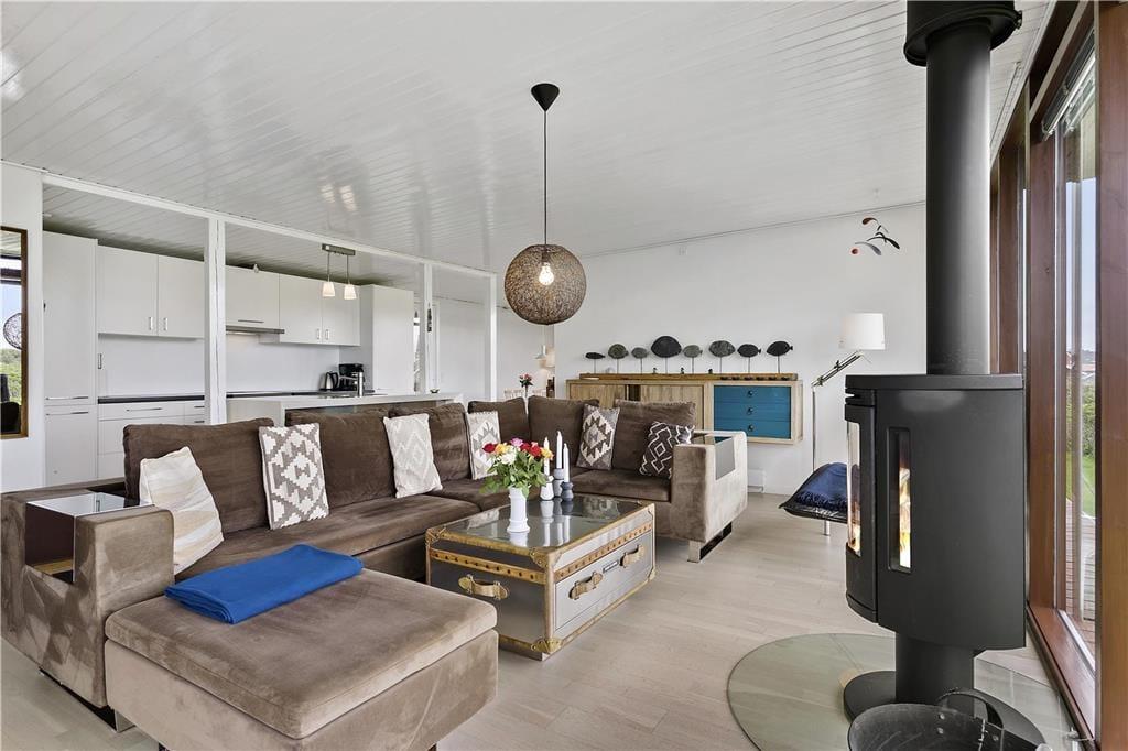 Huset er meget lyst og moderne indrettet. Hjertet af huset er det hyggelige alrum, der ligger i åben forbindelse med køkkenet og spiseafdelingen. Her får du lys fra stort set alle sider på grund af husets store panoramavinduer. Nyd den hyggelige stemning i stuen, som den knitrende ild i brændeovnen giver og den store sofa giver plads til at alle kan hygge sig indendørs, hvis der skulle komme en byge. Fra opholdsrummet er der adgang til de to soveværelser, hvert udstyret med en dobbeltseng og det flotte badeværelse med separat brusekabine. For at gøre opholdet ekstra komfortabelt råder huset over opvaskemaskine, vaskemaskine, parabol tv og trådløst internet. Desuden skal der siges at husets indretning er allergivenligt. Der er adgang til et skur, hvor der findes grill og hynder.