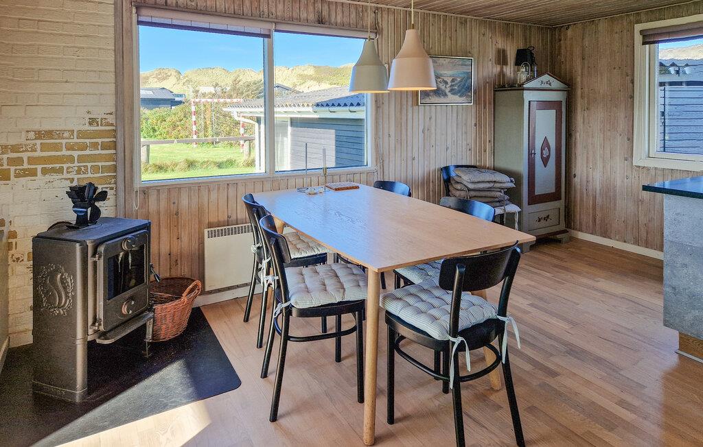 Med udsigt over klitterne tilbyder dette feriehus alt, hvad I behøver for en ubekymret ferie. En komfortabel sofa lægger op til at tilbringe afslappende timer med læsning, det praktiske køkken giver jer mulighed for at tilberede lækre måltider sammen, og når det bliver køligere udenfor, kan I tænde brændeovnen for hyggelig varme.