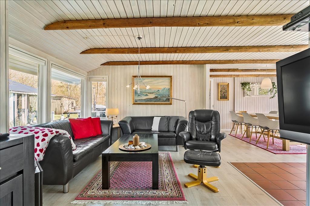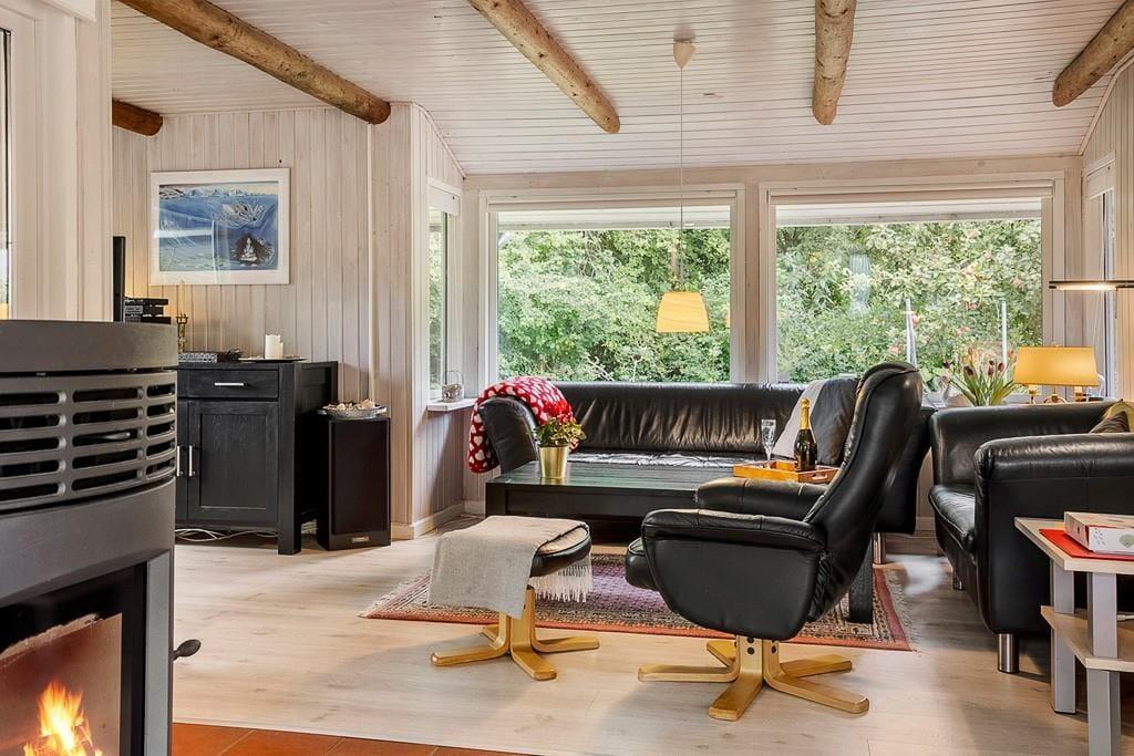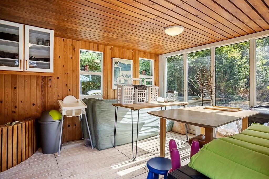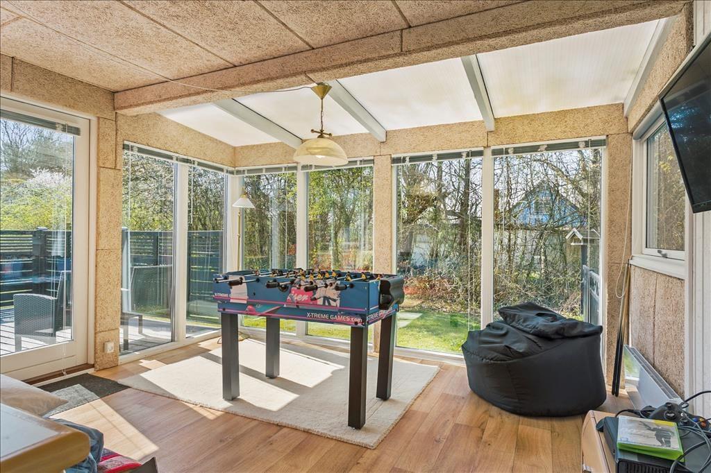 Det 113 m2 store aktivitetshus er renoveret i 2019, så I kan nyde driverlivet i lyse og moderne rammer. På klassisk manér er der lyse trævægge, synlige loftsbjælker og moderne pilleovn i stuen, mens det pæne møblement, fladskærms-tv’et med Chromecast og den energivenlige varmepumpe sørger for at højne komforten. Et veludstyret køkken er integreret med stuen, som også har direkte adgang til et skønt aktivitetsrum med bl.a. mini-bordtennis, mini-billard, mini-airhockey, elektrisk dart, bordfodbold og en X-Box 360. Der står også en sovesofa i aktivitetsrummet, hvilket er et godt supplement til dobbeltsengene på de tre soveværelser. Centralt i huset ligger et pænt badeværelse.