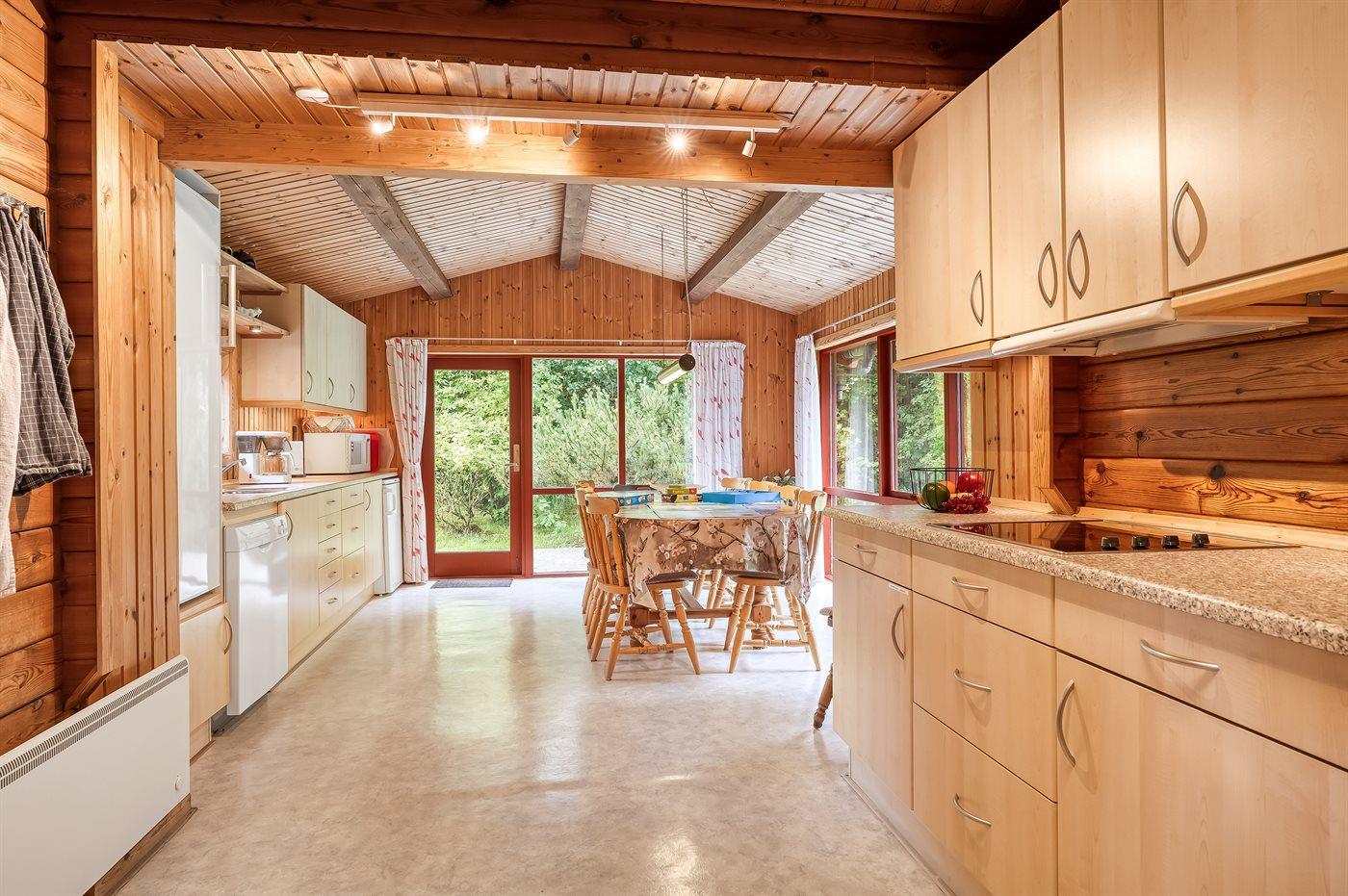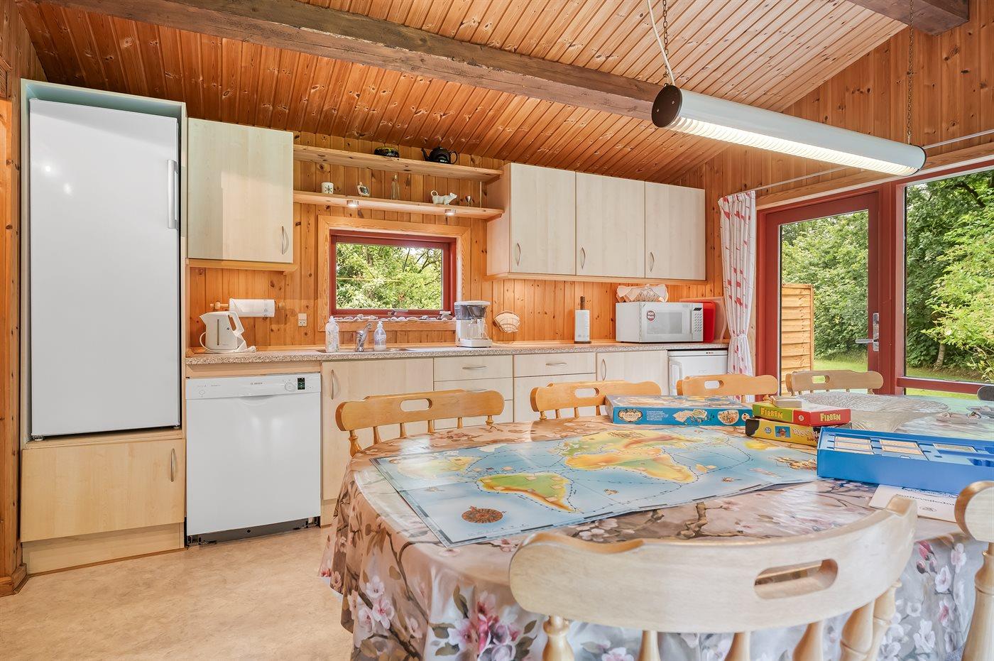 Køkkenet er udstyret med 1 køleskab. Der er 4 keramiske kogeplader, varmluftovn, mikrobølgeovn samt opvaskemaskine.