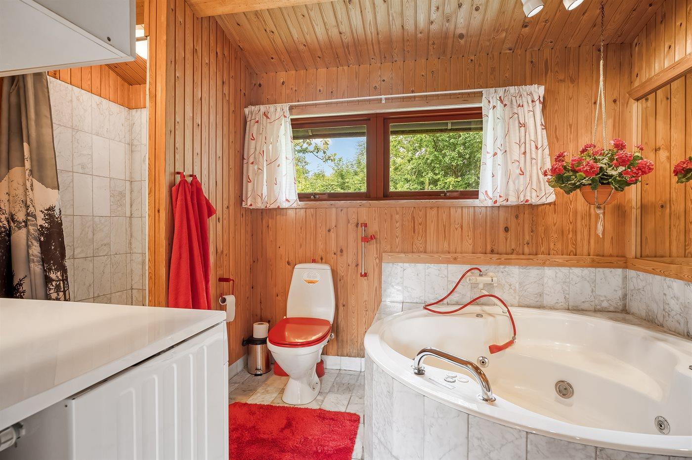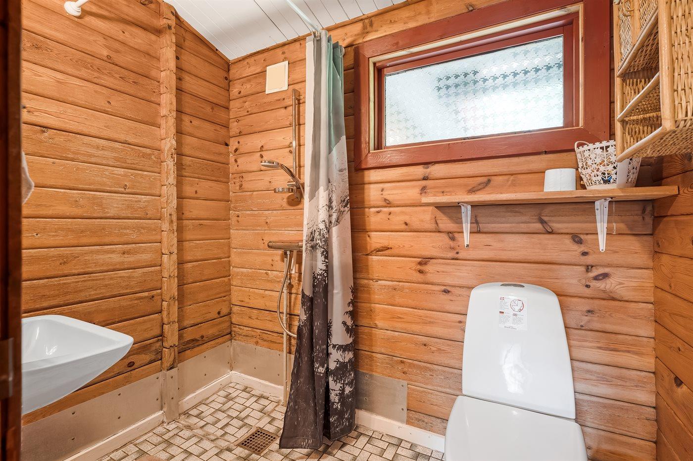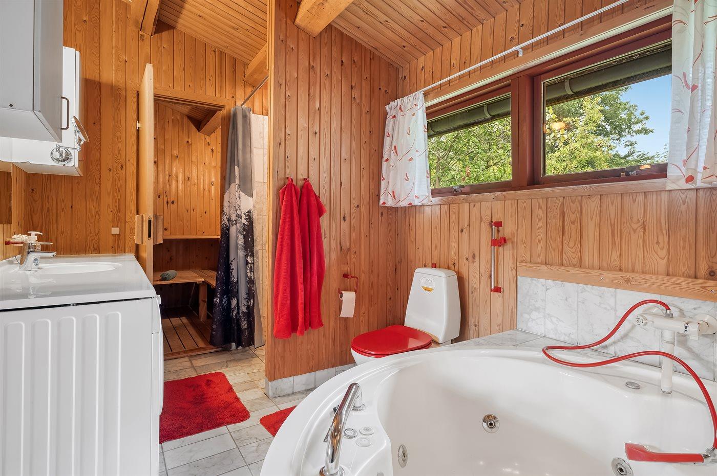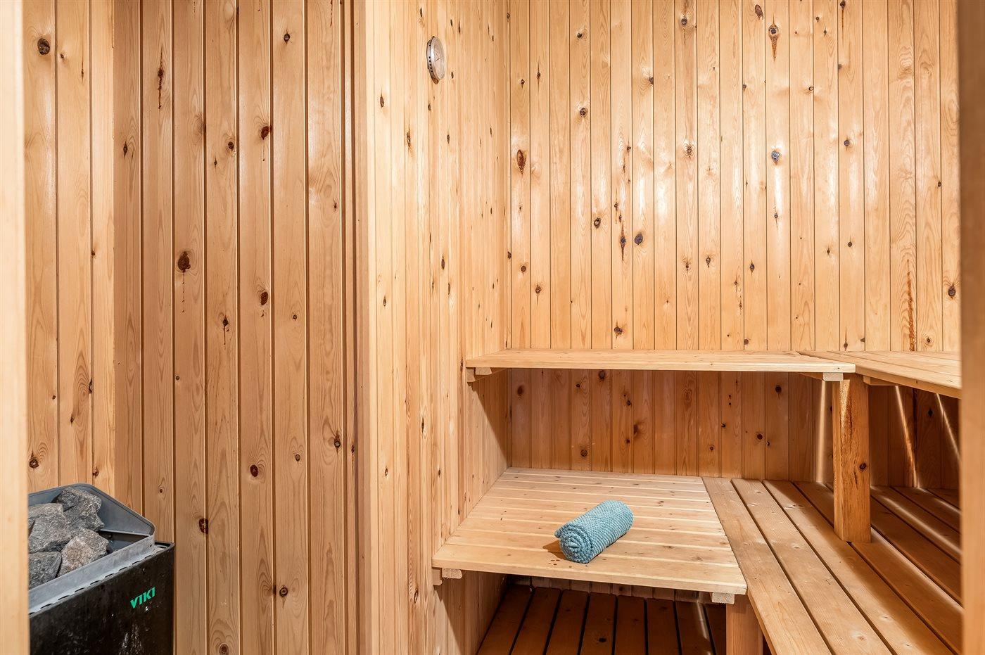 Der er 2 badeværelser med bruseniche og 2 toiletter. Der er gulvvarme på 1 badeværelse. I saunaen er der mulighed for afslapning.