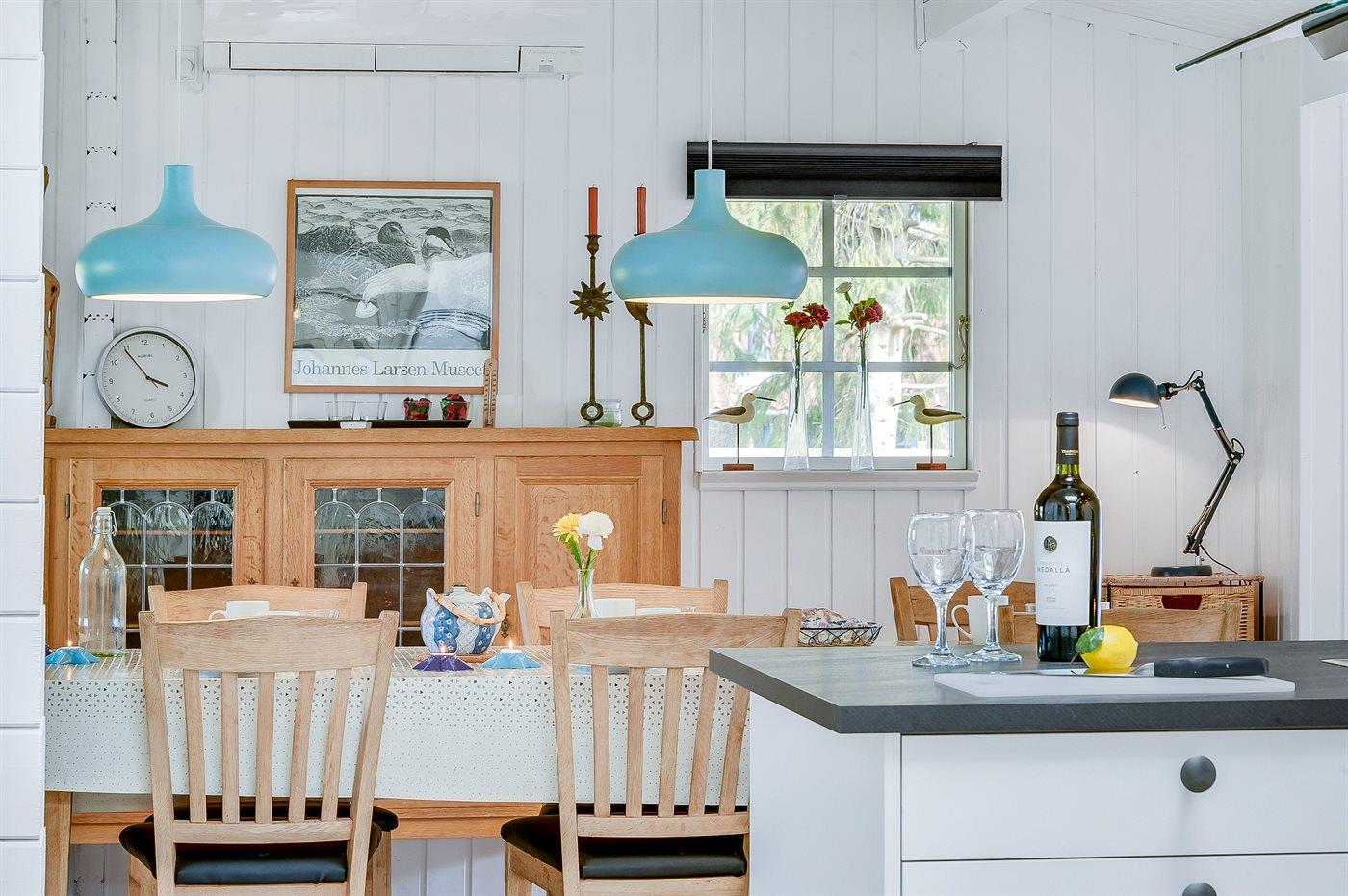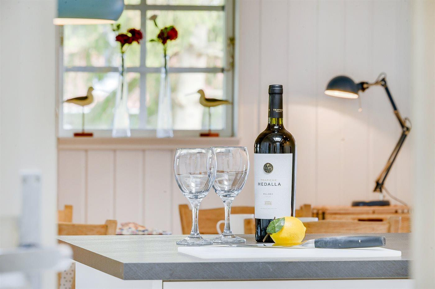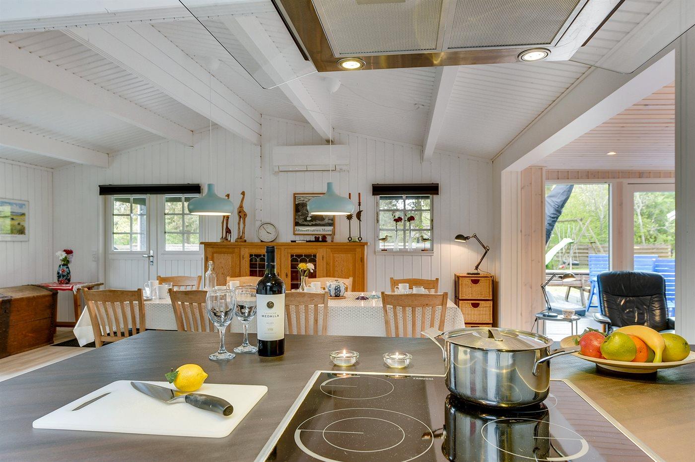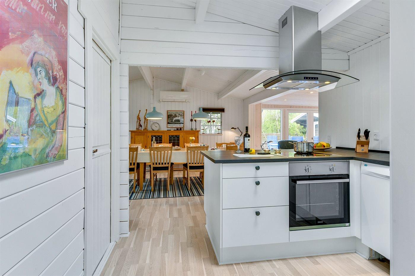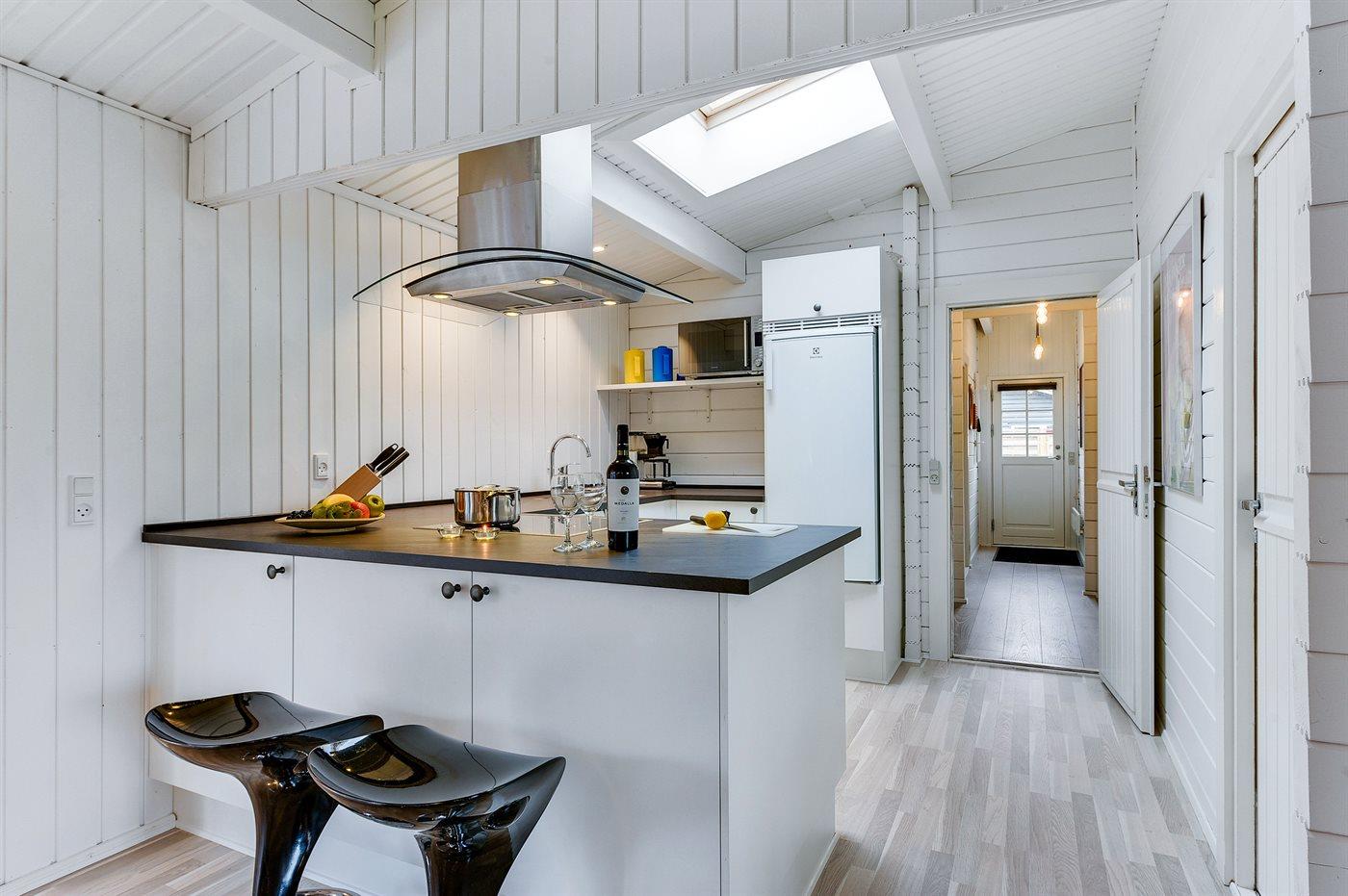 Køkkenet er udstyret med 1 køleskab. Der er 4 keramiske kogeplader, varmluftovn, mikrobølgeovn samt opvaskemaskine.