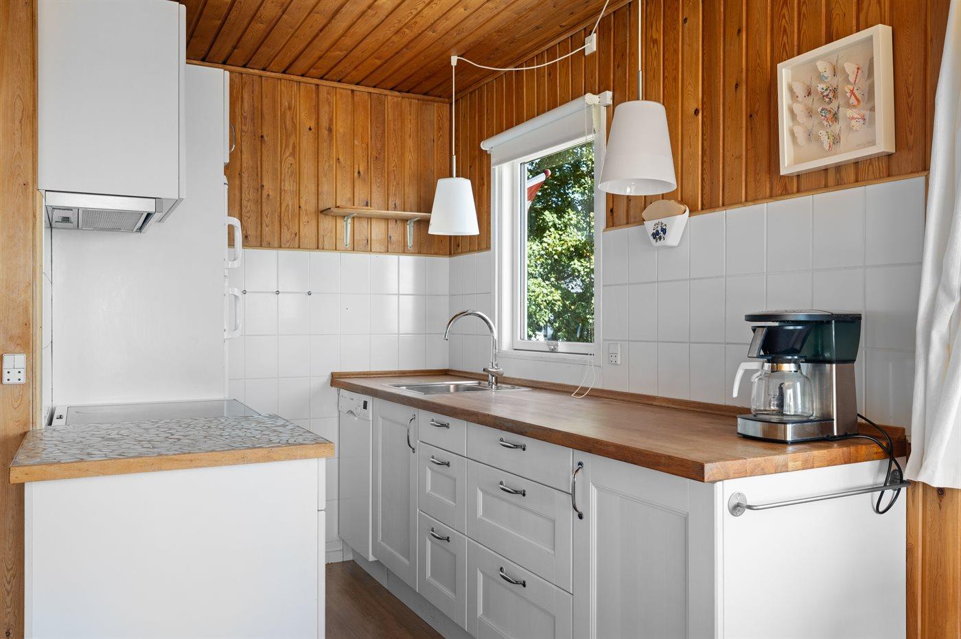 Køkkenet er udstyret med 1 køleskab. Der er 4 keramiske kogeplader, varmluftovn, mikrobølgeovn samt opvaskemaskine.