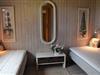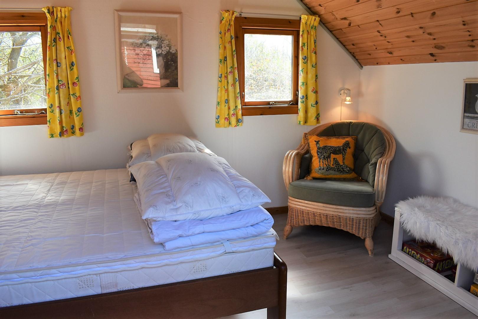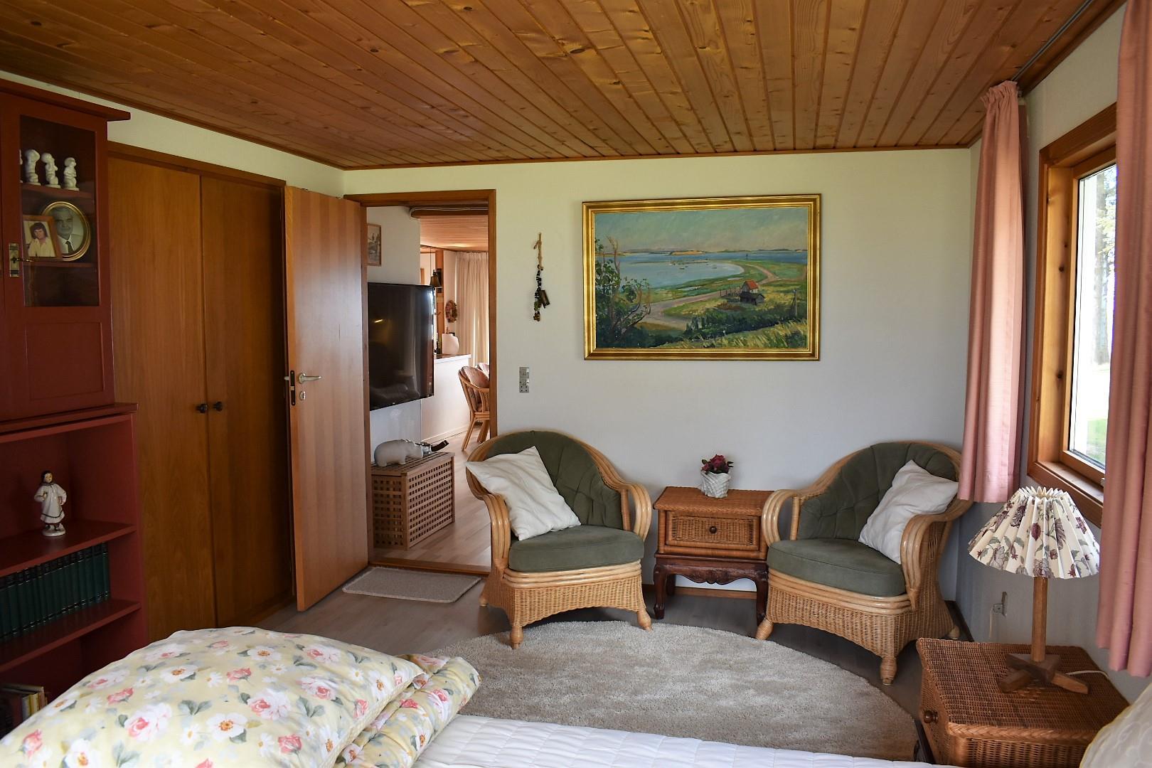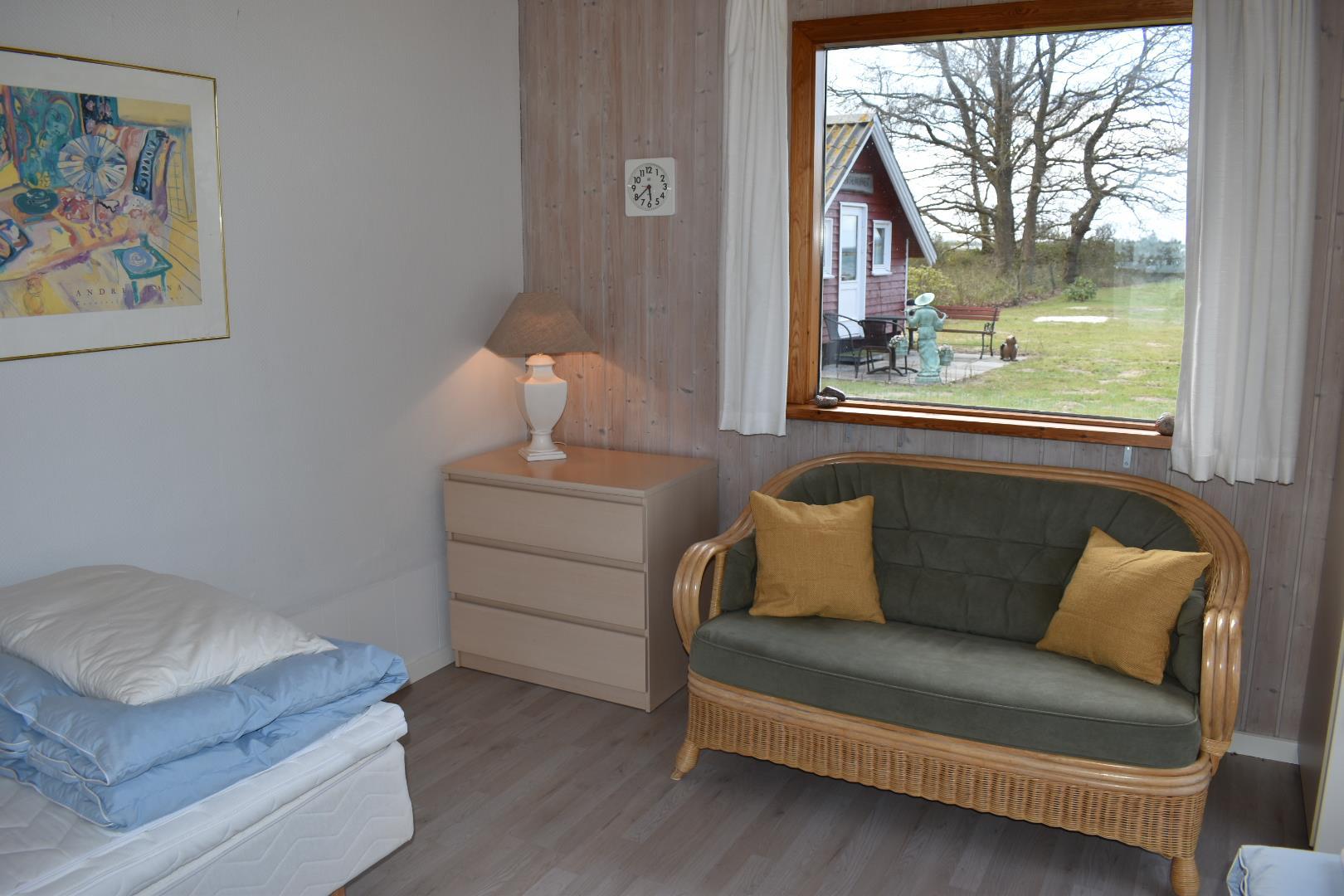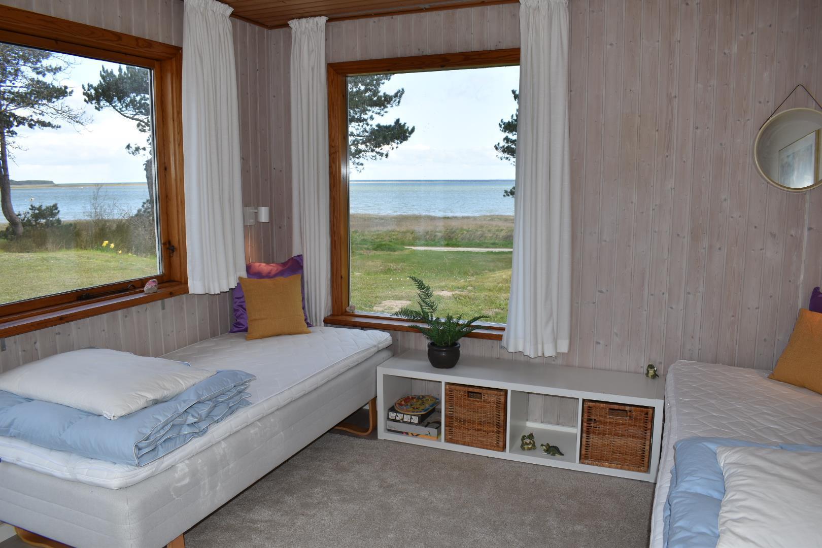 Sommerhuset rummer i alt fire soverum. Hovedhuset har 2 soverum, et stort værelse med dobbeltseng og panoramaudsigt til vandet samt et værelse med to enkeltsenge. Herudover er der to separate annekser, det ene på 16 m² med to enkeltsenge og det andet på 9 m² med dobbeltseng, begge med udsigt til vandet. Huset har desuden et rummeligt badeværelse med brusekabine og vaskemaskine samt et praktisk gæstetoilet.