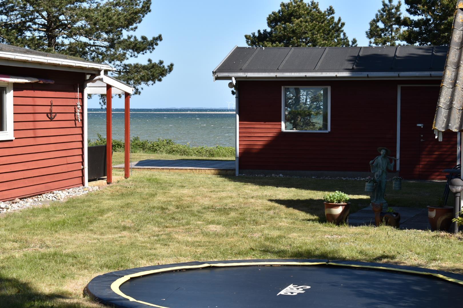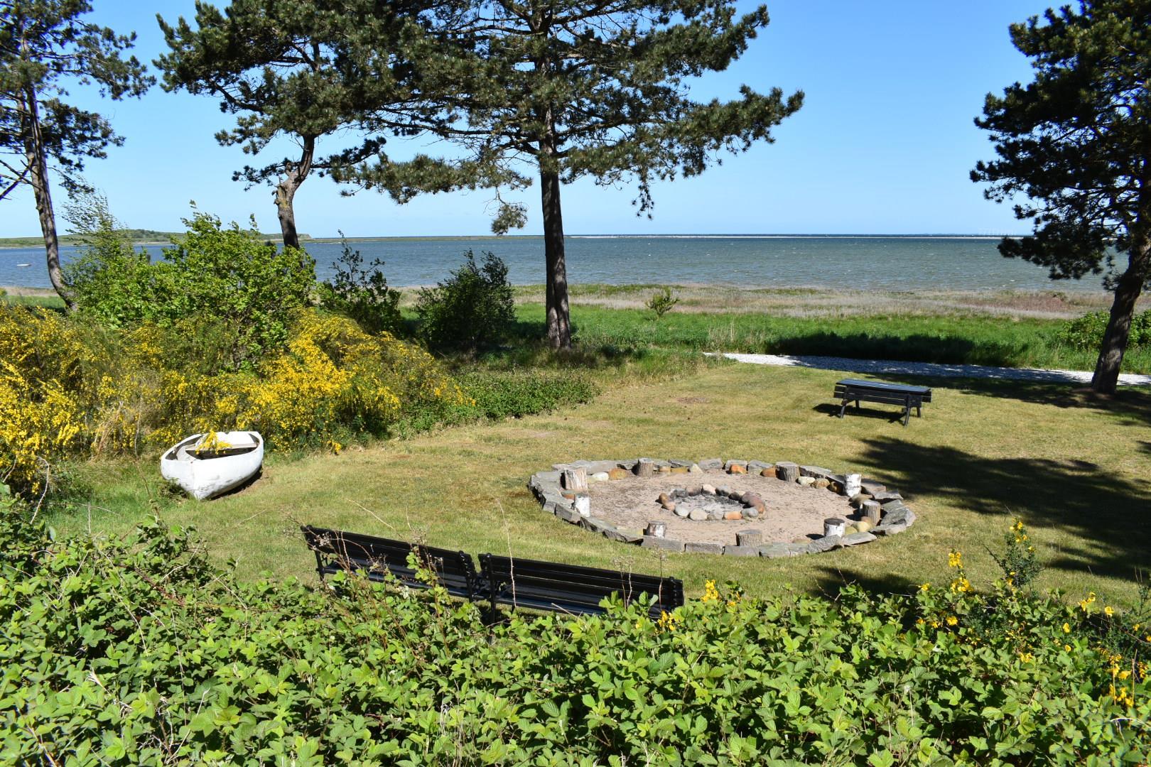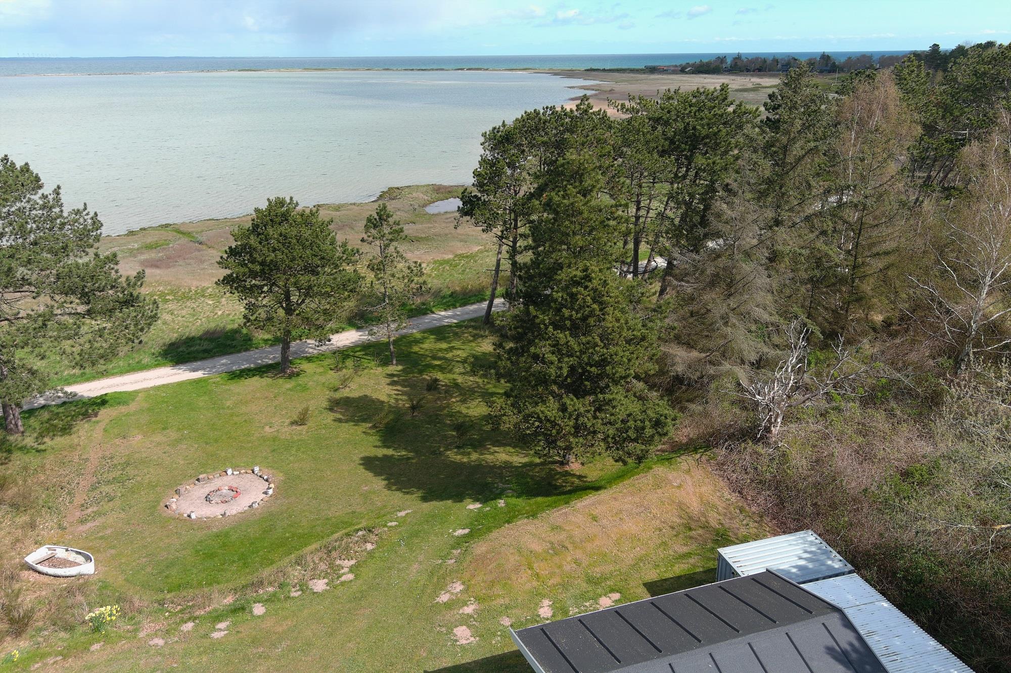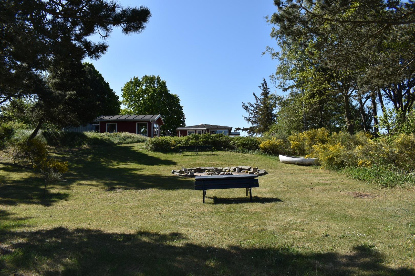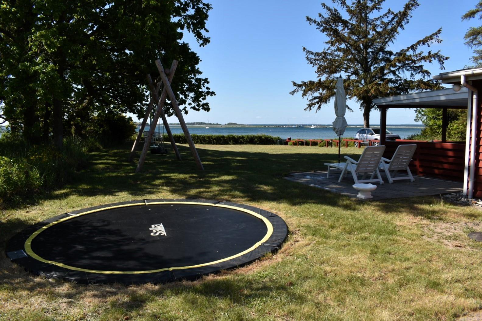 Udendørs er naturgrunden på 2000 m² et kapitel for sig selv. Den kuperede grund giver både privatliv og flere unikke opholdssteder, blandt andet en bålplads med udsigt over vandet – perfekt til hyggelige aftener med solnedgangen som kulisse. For børnene er der rig mulighed for leg og bevægelse med både en stor trampolin og en solid gynge.
