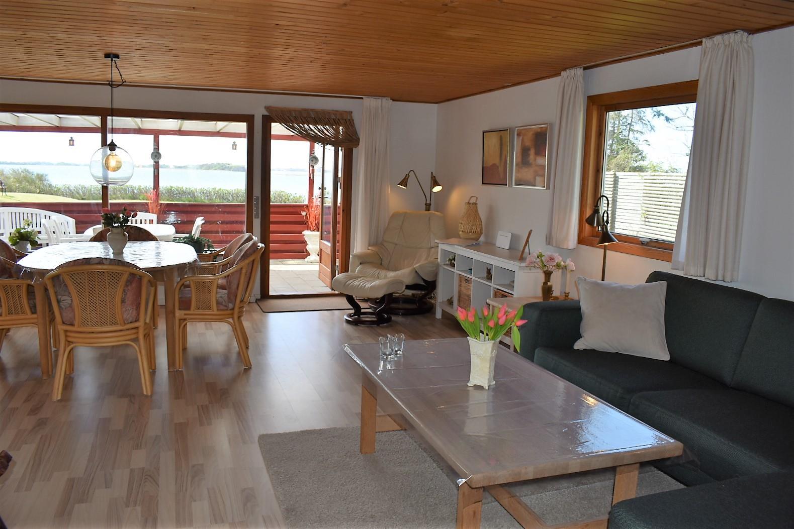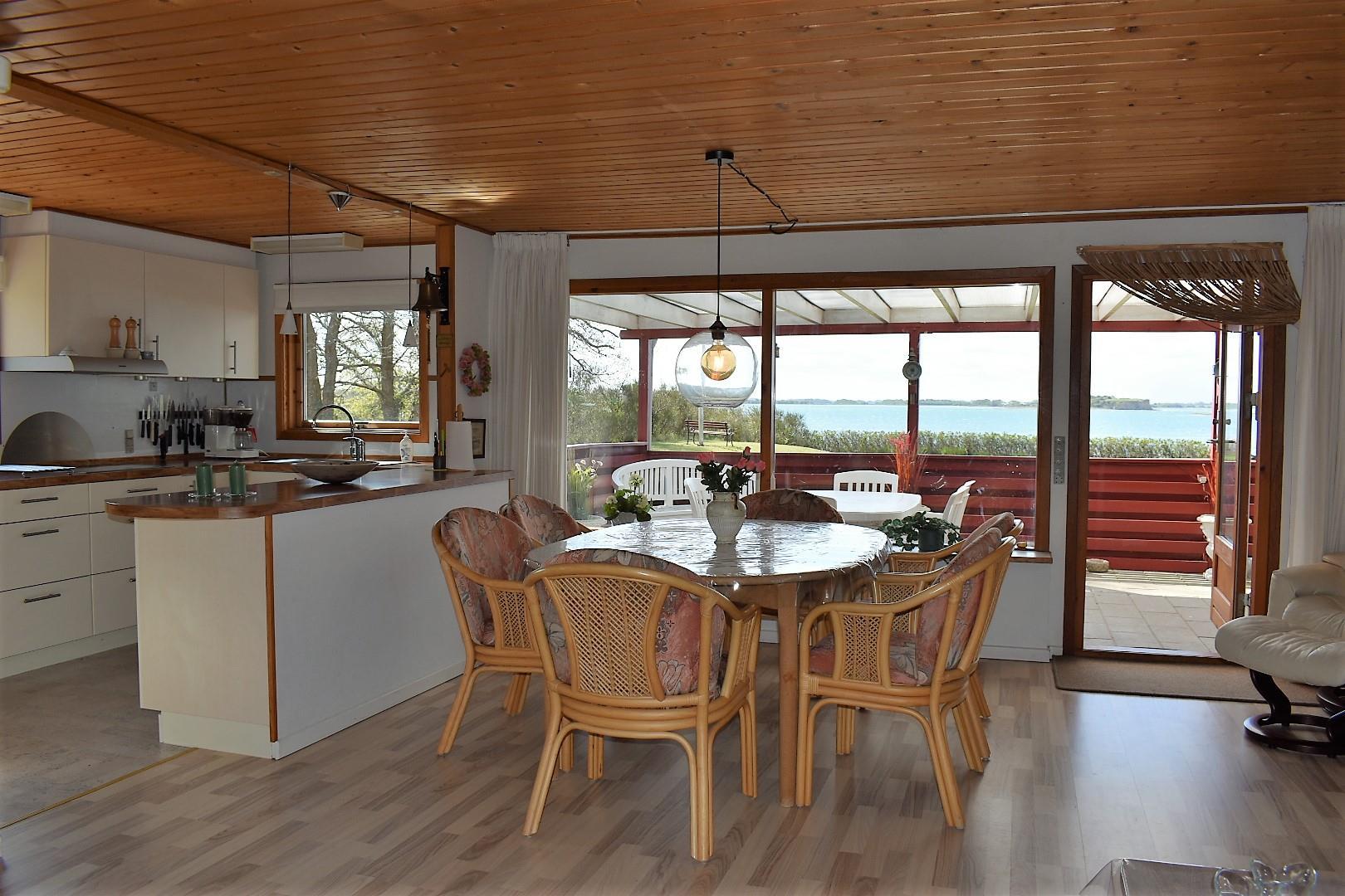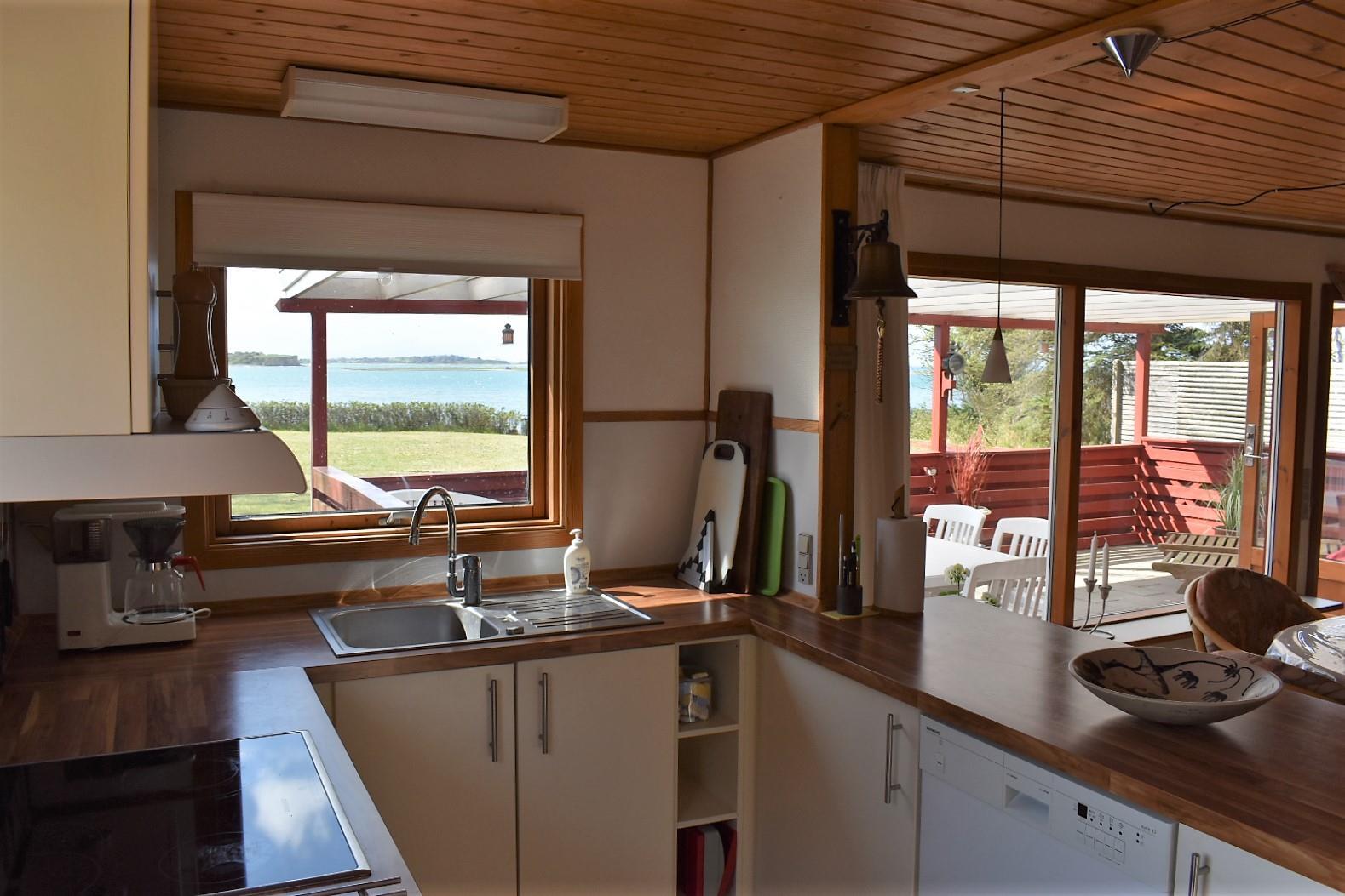 Indendørs er huset lyst og venligt med en stue i åben forbindelse med et nyere køkken. Stuen er udstyret med et stort Smart-TV, hvor du via Chromecast kan streame fra din egen mobil eller tablet. Herfra er der direkte adgang til en stor, overdækket terrasse, hvor du kan nyde solopgangen over stranden eller udsigten til bådene i Korshavn.