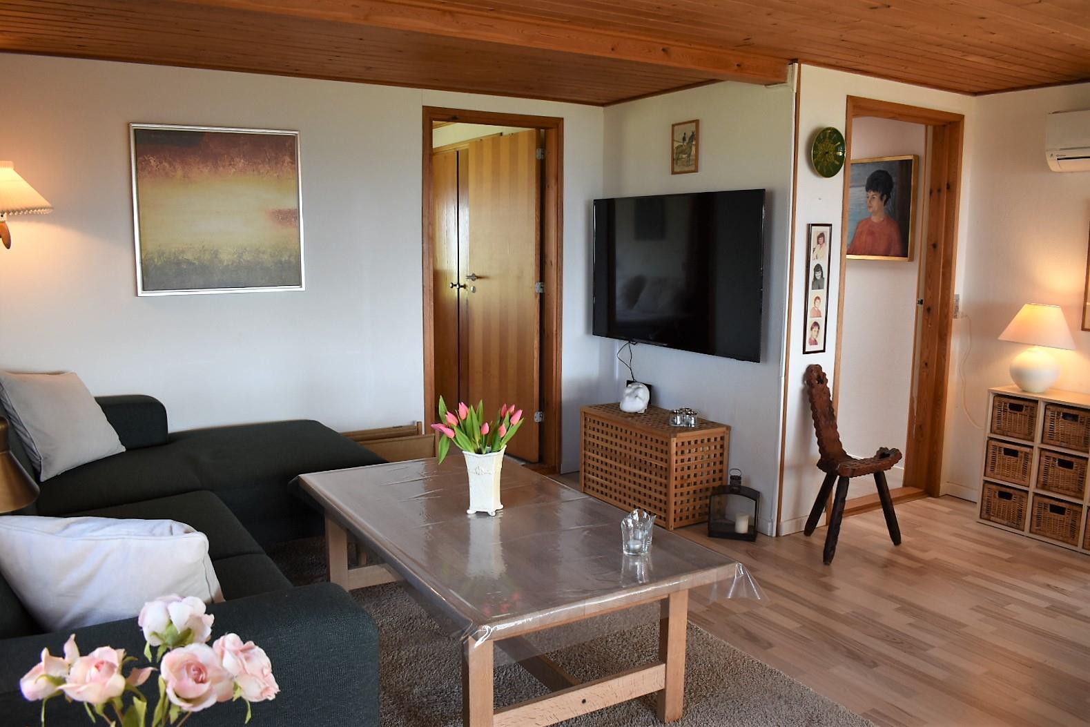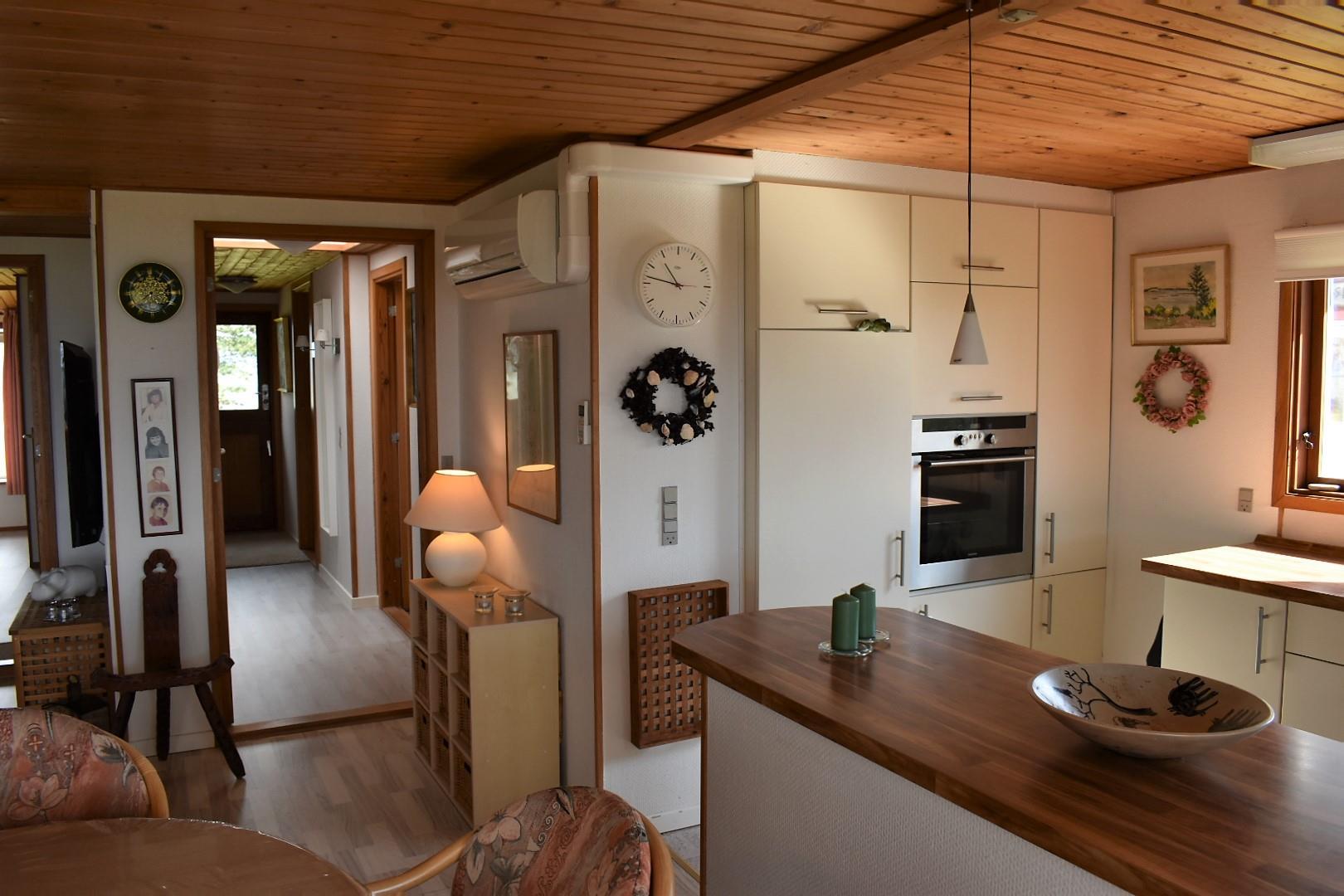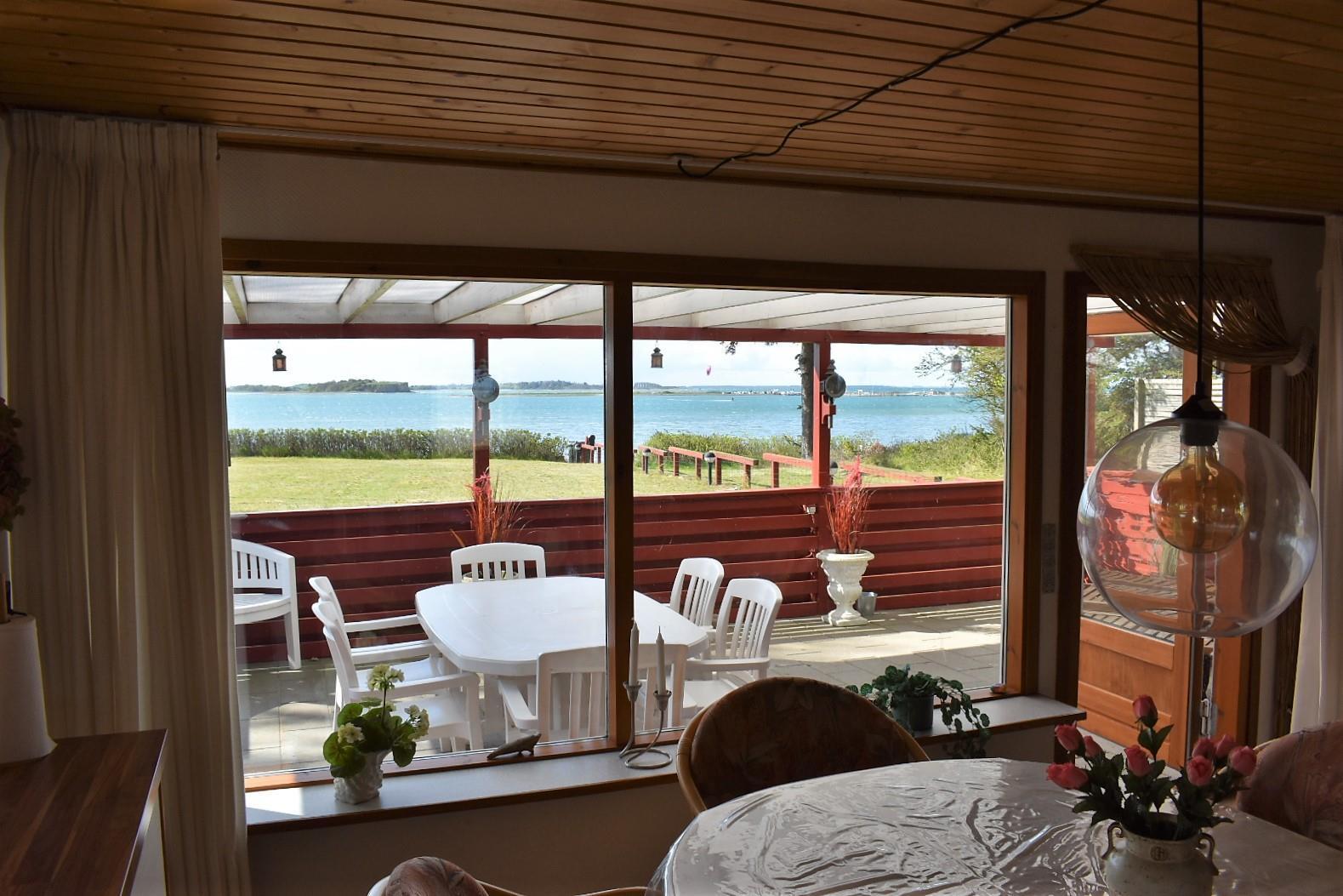 Indendørs er huset lyst og venligt med en stue i åben forbindelse med et nyere køkken. Stuen er udstyret med et stort Smart-TV, hvor du via Chromecast kan streame fra din egen mobil eller tablet. Herfra er der direkte adgang til en stor, overdækket terrasse, hvor du kan nyde solopgangen over stranden eller udsigten til bådene i Korshavn.