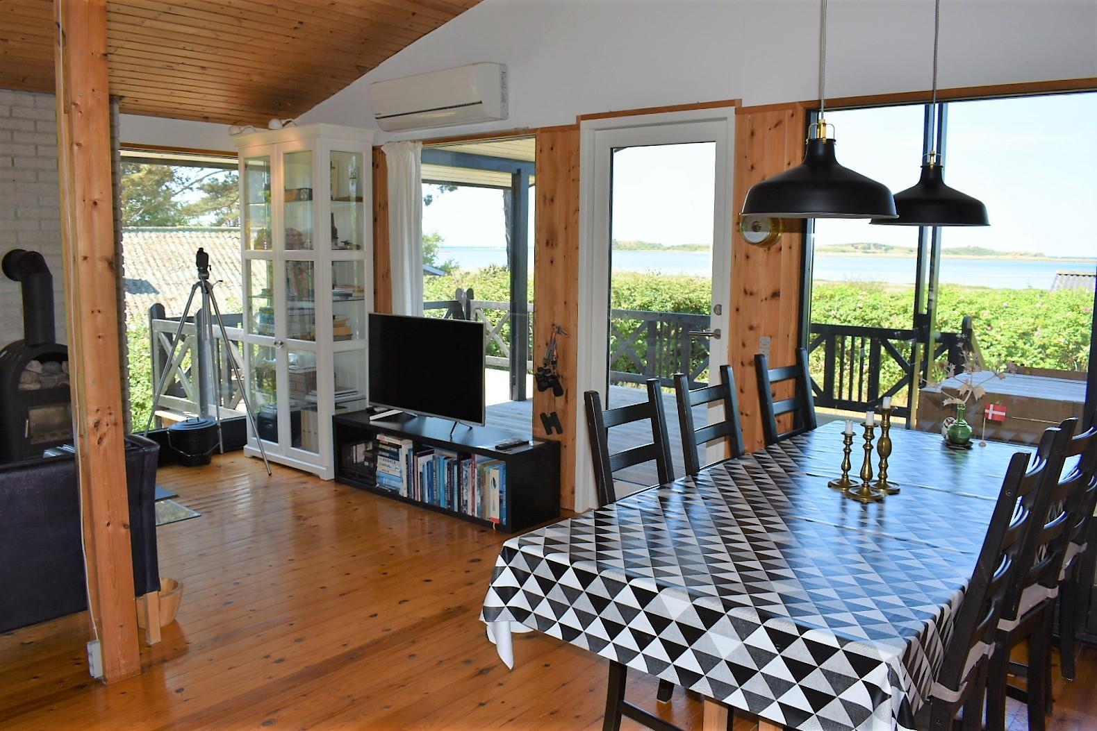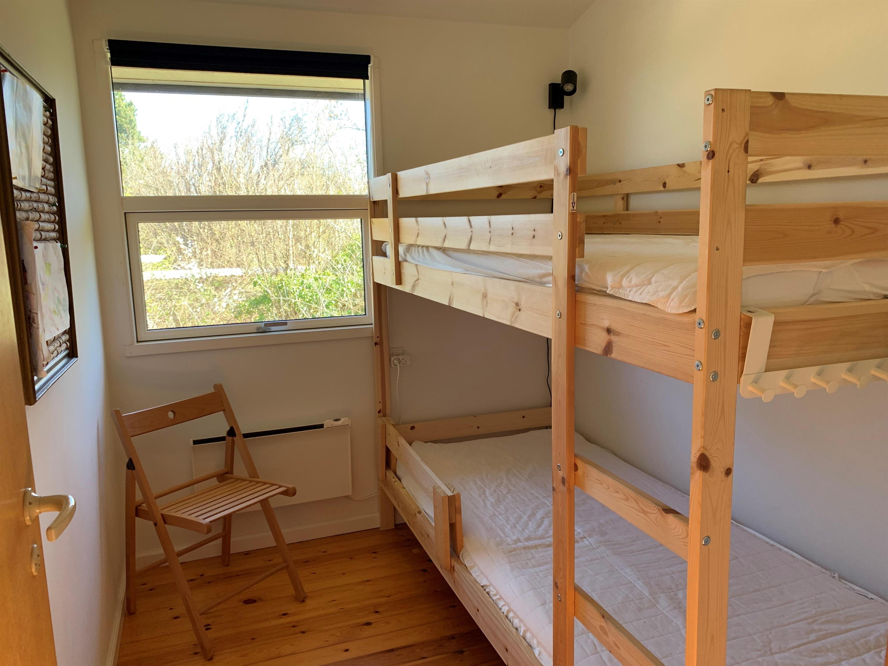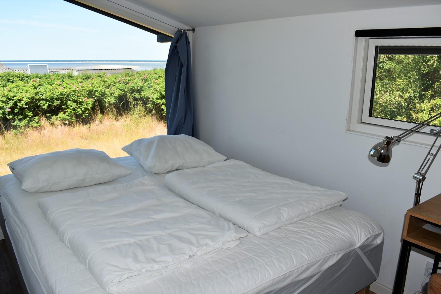 Sommerhuset rummer tre soverum – to med dobbeltsenge og ét med køjesenge. Det ene værelse har et smukt glasparti fra gulv til loft, der giver dig mulighed for at vågne op til panoramaudsigt over vandet. Det nye badeværelse er udstyret med gulvvarme for ekstra komfort.