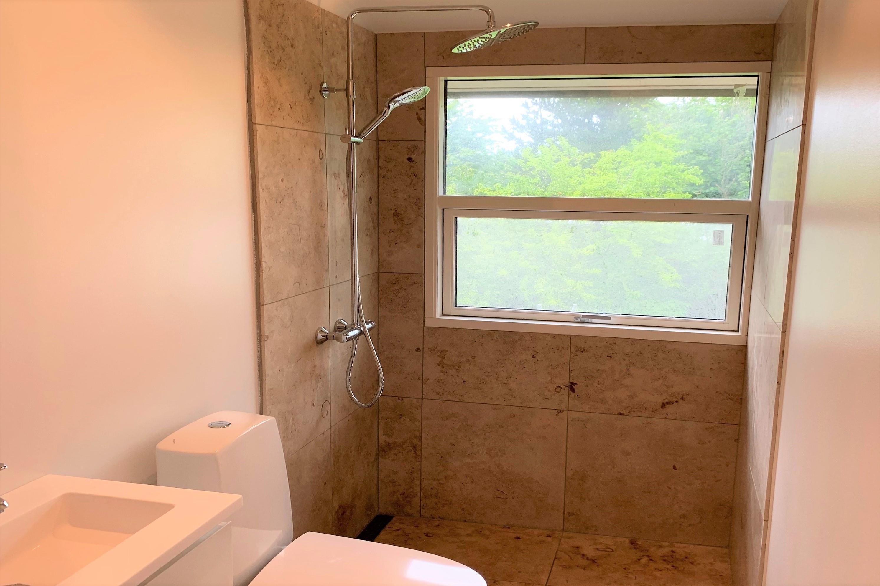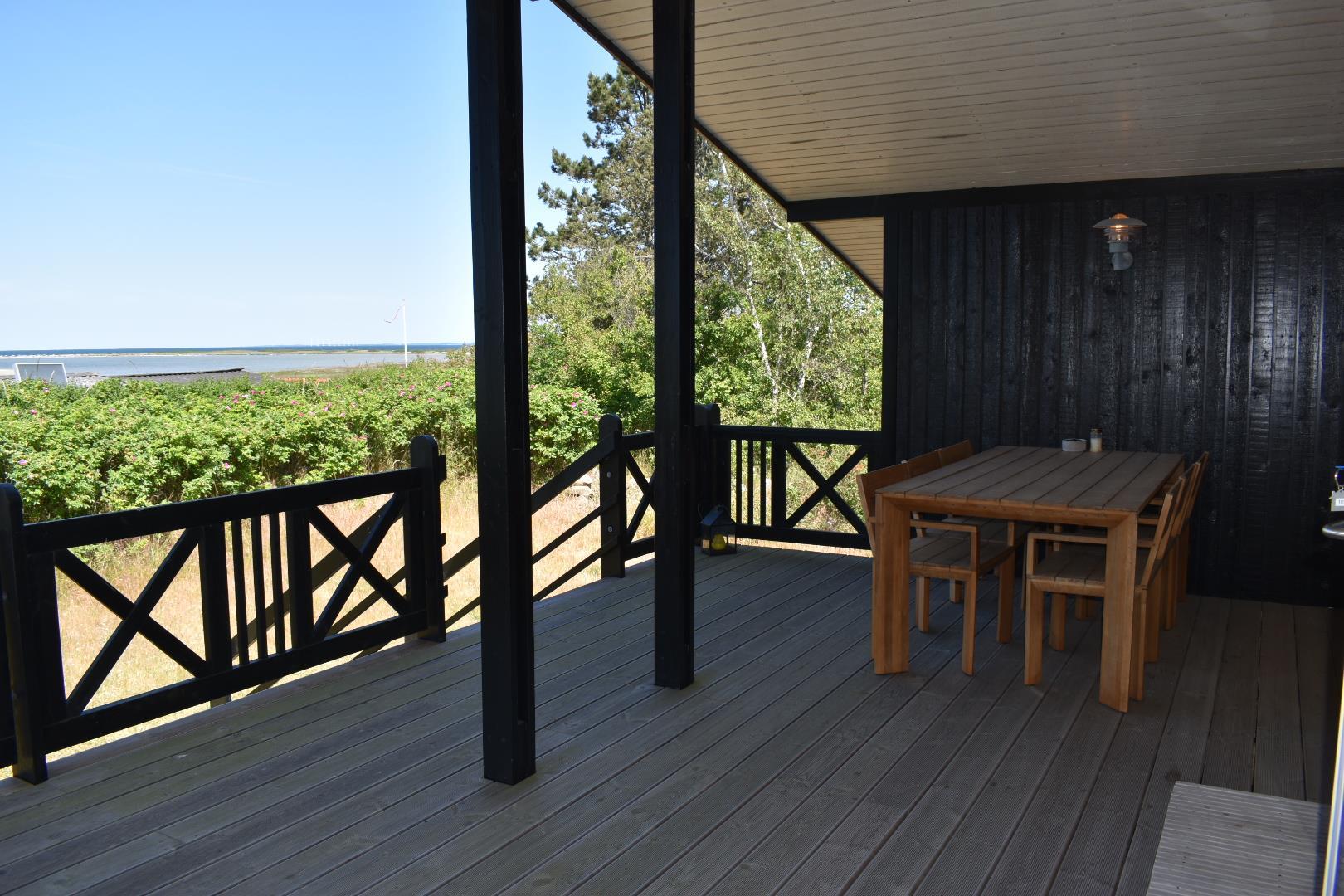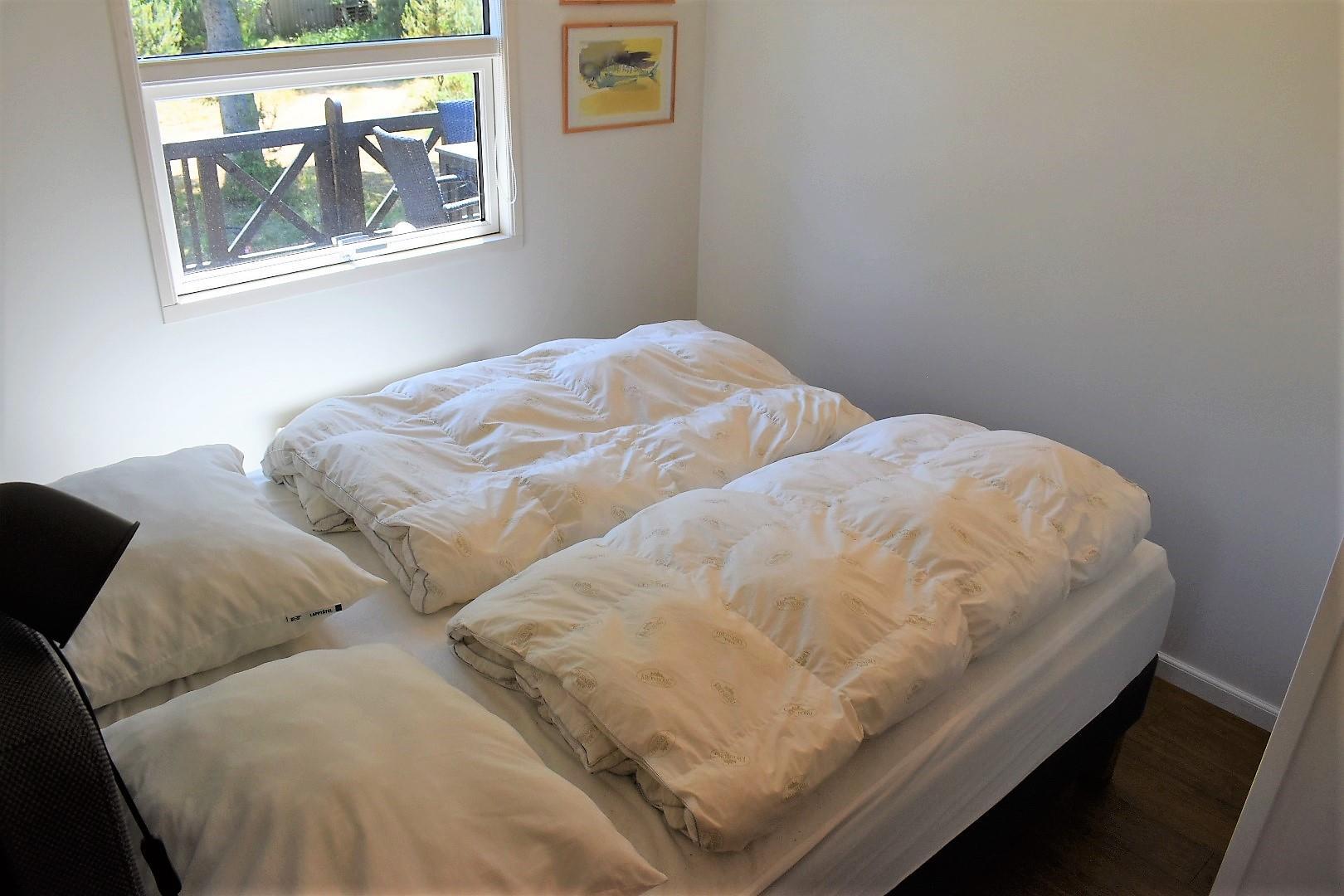 Sommerhuset rummer tre soverum – to med dobbeltsenge og ét med køjesenge. Det ene værelse har et smukt glasparti fra gulv til loft, der giver dig mulighed for at vågne op til panoramaudsigt over vandet. Det nye badeværelse er udstyret med gulvvarme for ekstra komfort.