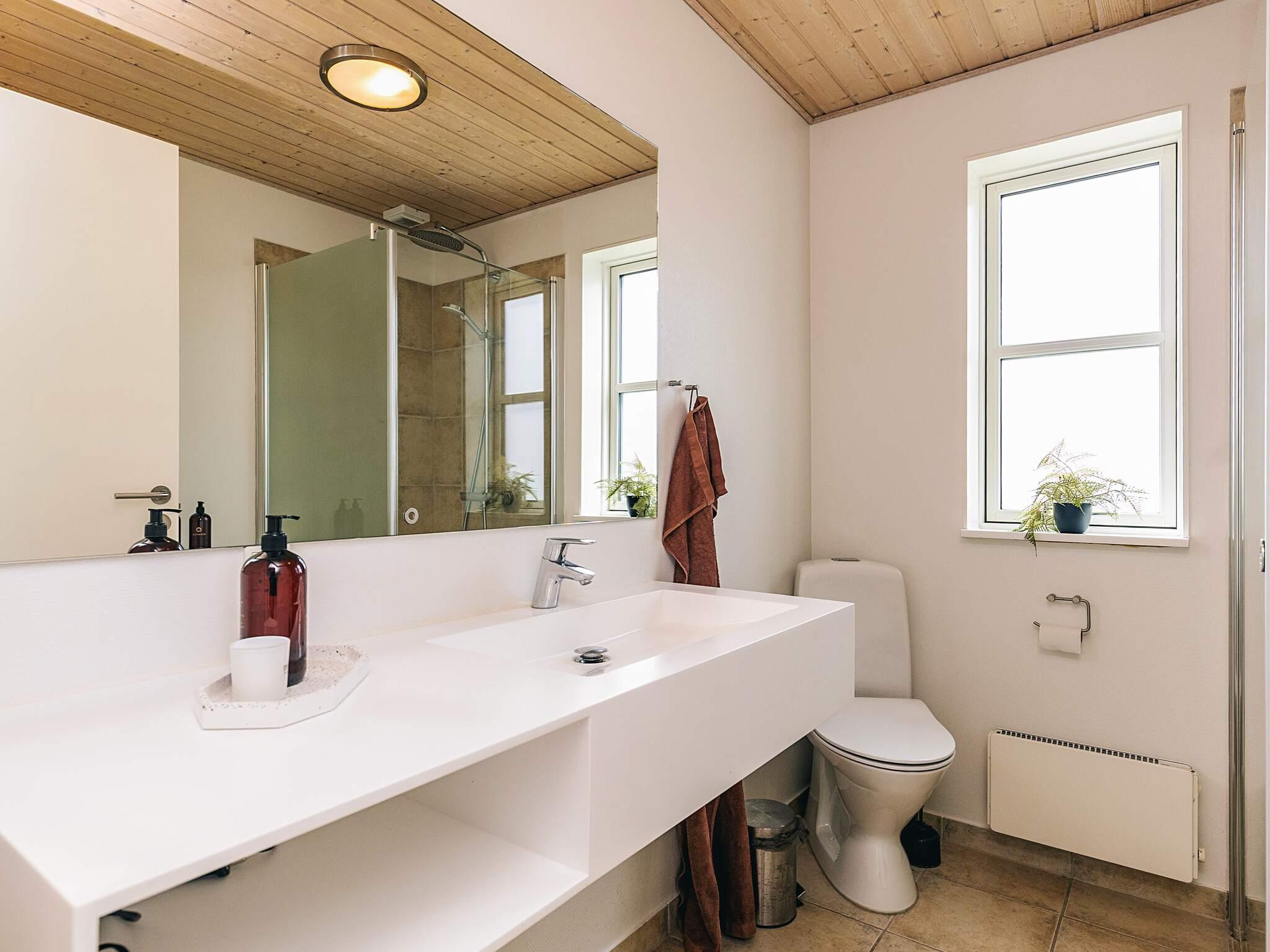 Badeværelse med bruseniche, bademiljø samt wc. Der er også vaskemaskine i huset.