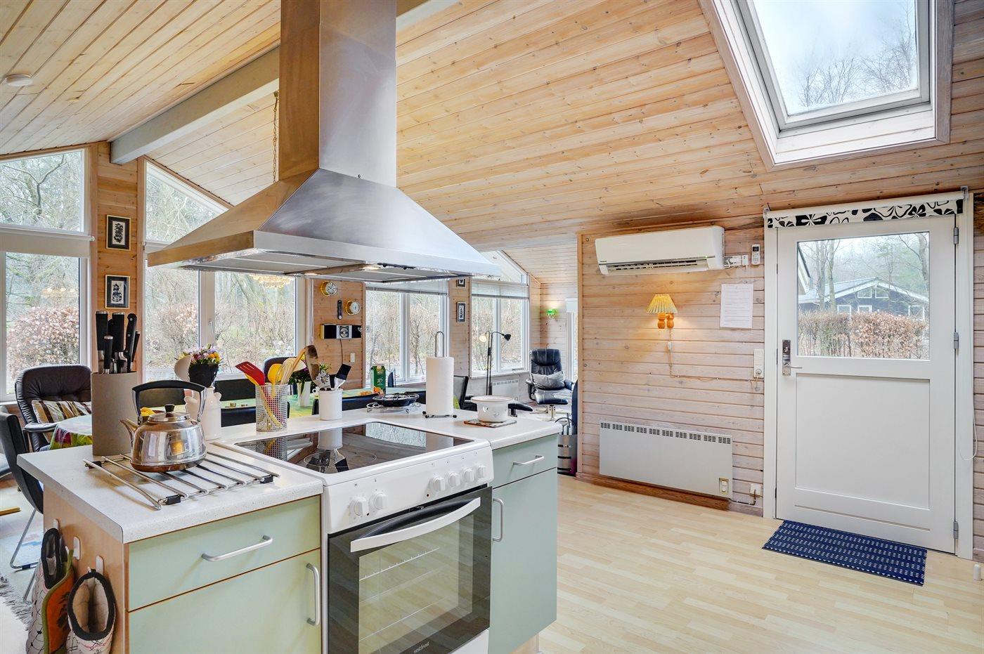 Køkkenet er udstyret med 2 køleskabe. Der er 1 elkogeplader, varmluftovn, mikrobølgeovn samt opvaskemaskine.
