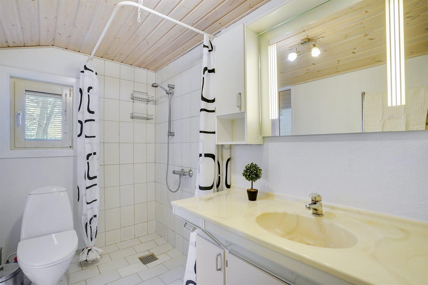 Der er 2 badeværelser med bruseniche og 2 toiletter. Der er gulvvarme på 2 badeværelser. I saunaen er der mulighed for afslapning.