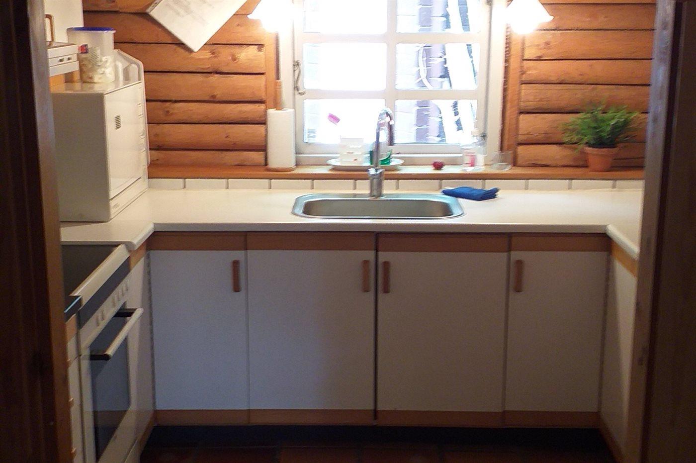 Køkkenet er udstyret med 1 køleskab. Der er 4 elkogeplader, varmluftovn, mikrobølgeovn.