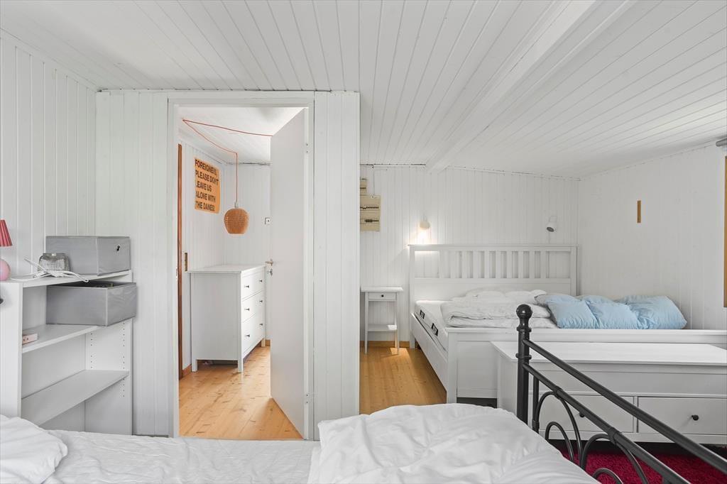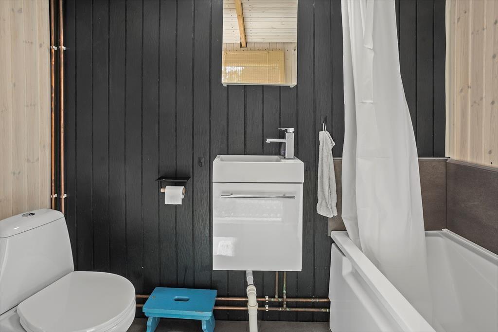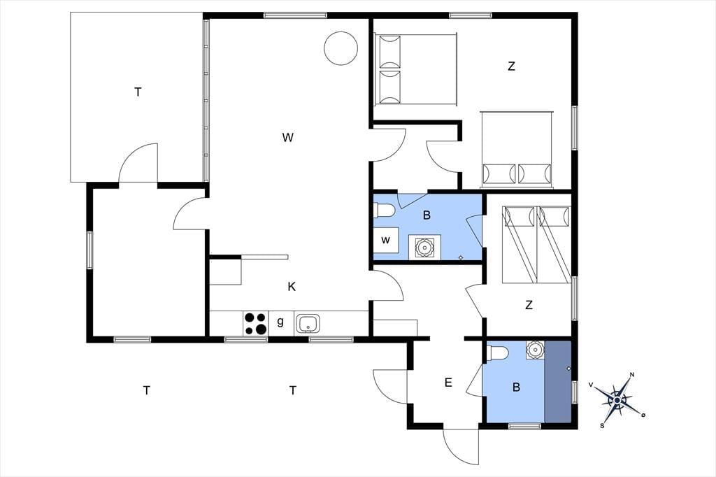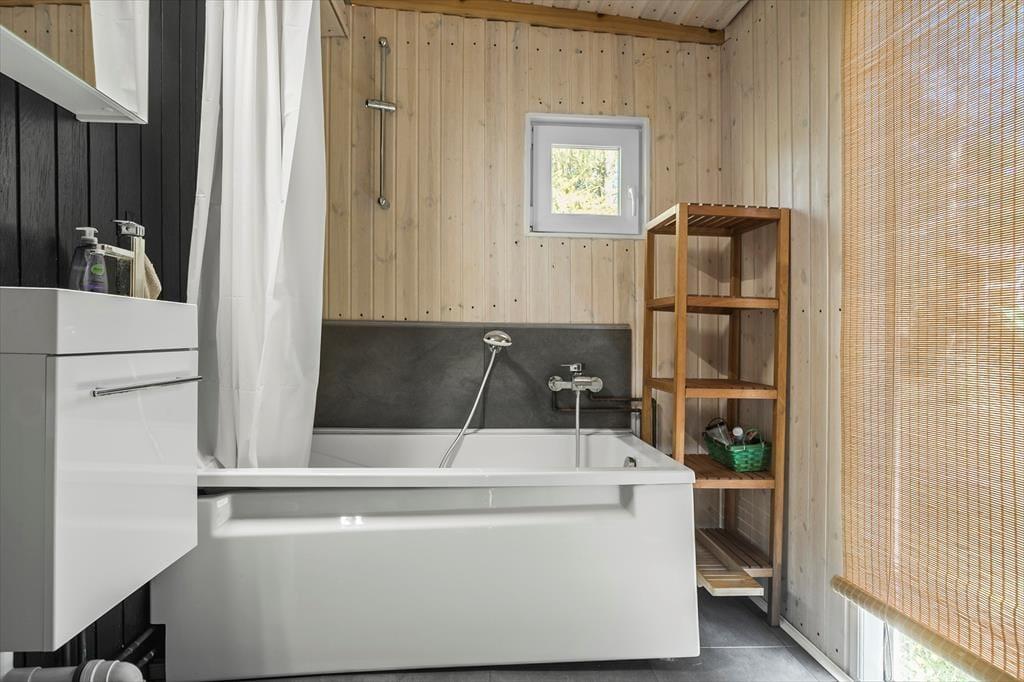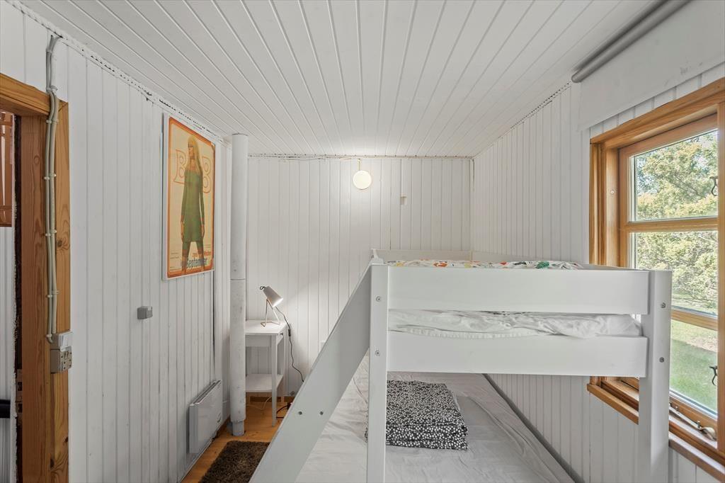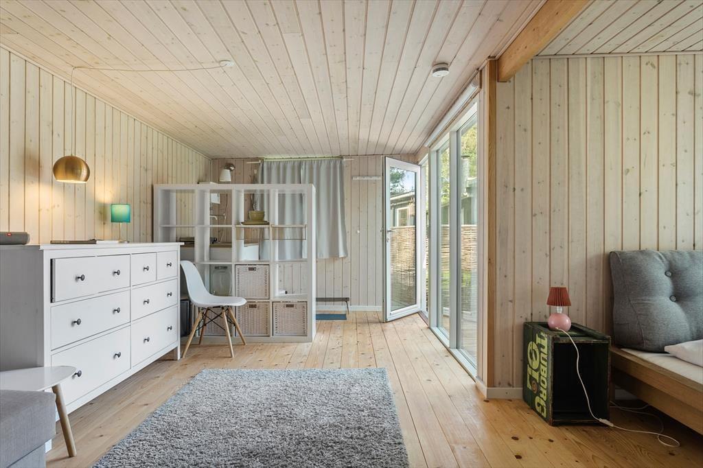 Fritidshuset byder på 2 gode soveværelser, i det ene værelse er der 2 x dobbeltseng og det andet værelse er der en køjeseng. Huset byder på 2 badeværelser, i det ene badeværelse er der WC, bruser og vaskemaskine og i det andet er der WC, bruser og badekar. Derudover har huset et hyggeligt køkken, med udgang til spisestue og stue. Fra spisestuen og stuen er der udgang til husets skønne terrasser, hvor af den ene er overdækket.