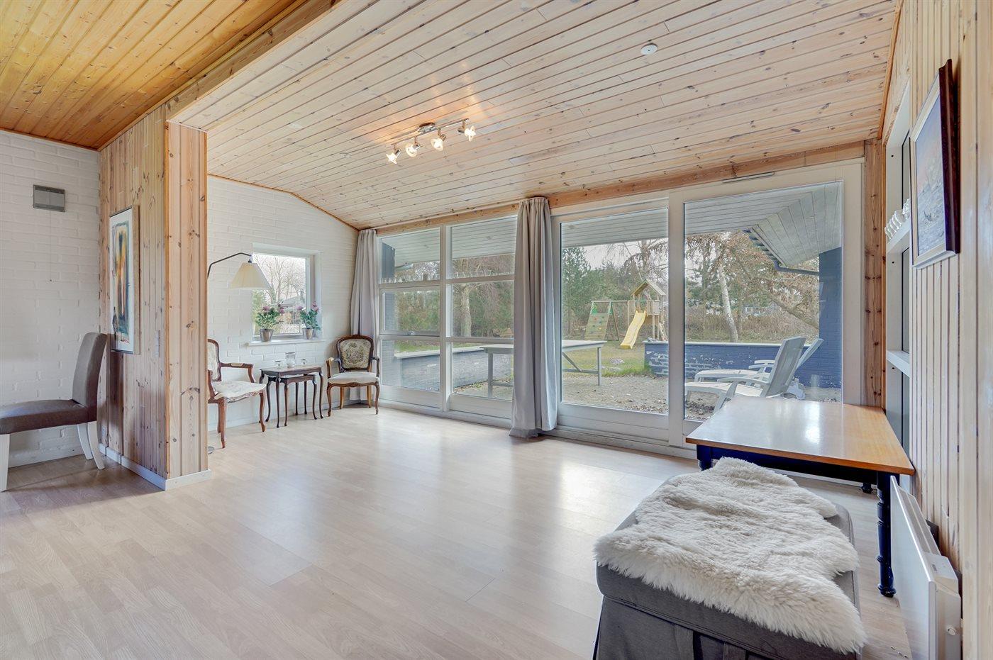 Hyggeligt sommerhus beliggende lige bag diget på en lukket og ugenert grund, hvor der bagved huset er god plads til leg og anden udendørs aktivitet. På den modsatte side af vejen, som er minimalt trafikeret, er der anlagt en sti, der fører lige ned til den børnevenlige strand.