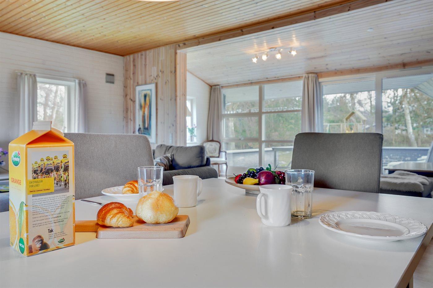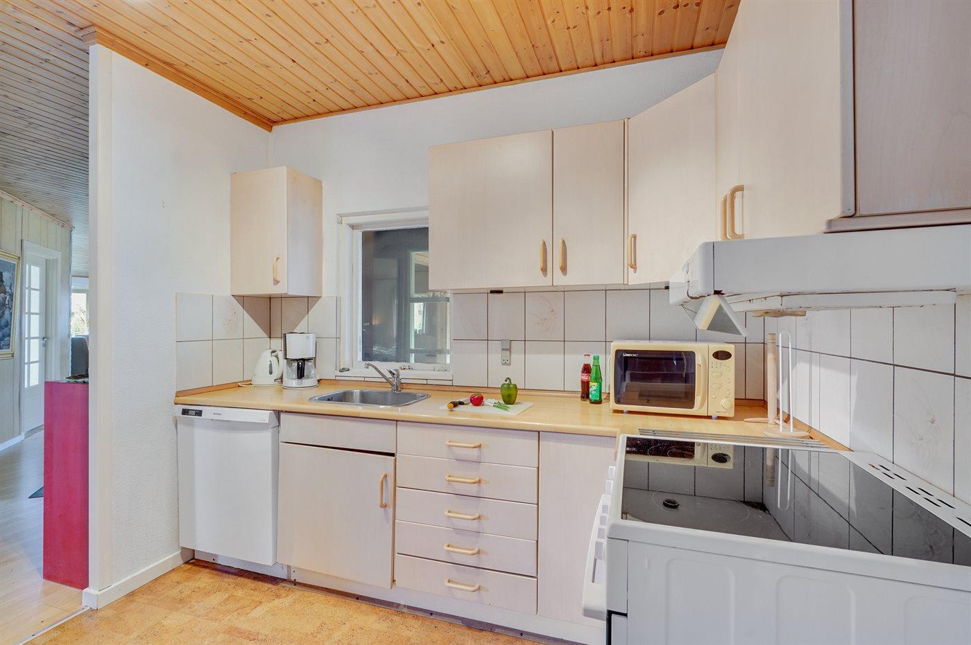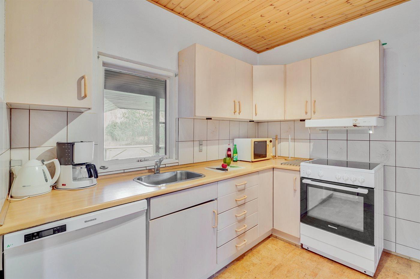 Køkkenet er udstyret med 1 køleskab. Der er 4 elkogeplader, varmluftovn samt opvaskemaskine.