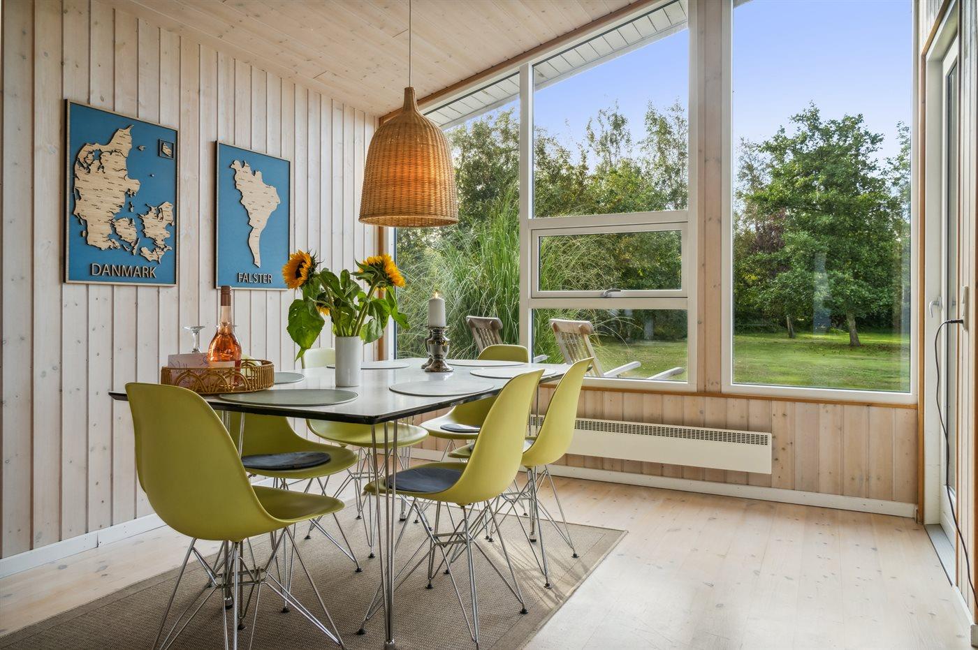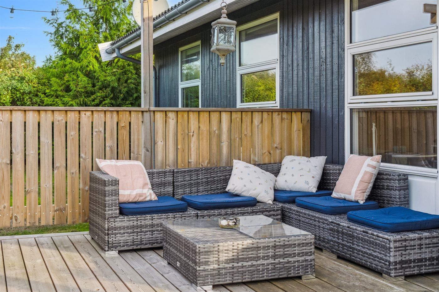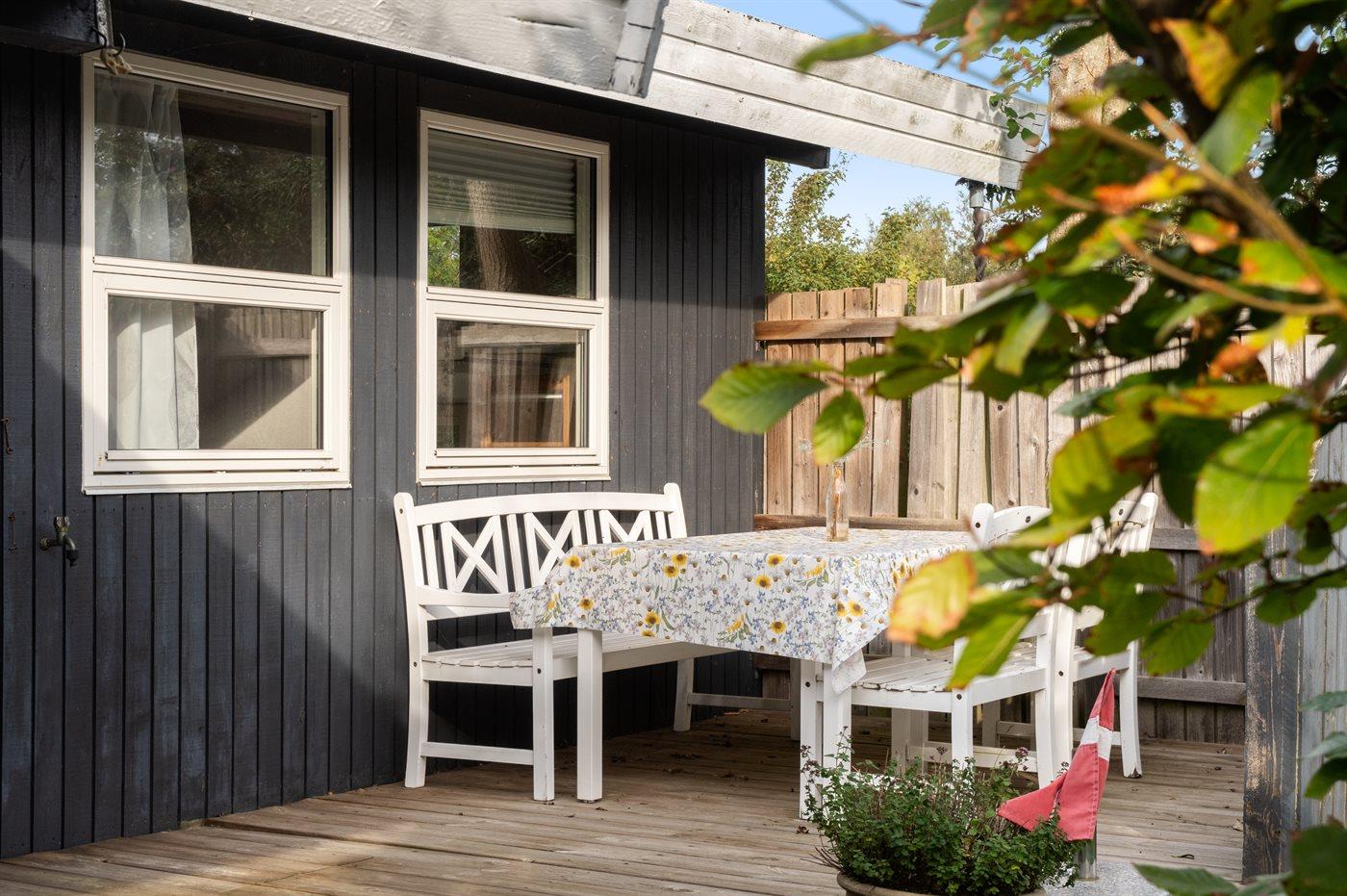 Hyggeligt og lyst indrettet sommerhus med skønne terrassearealer, som er delvist afskærmede og med gode læforhold.