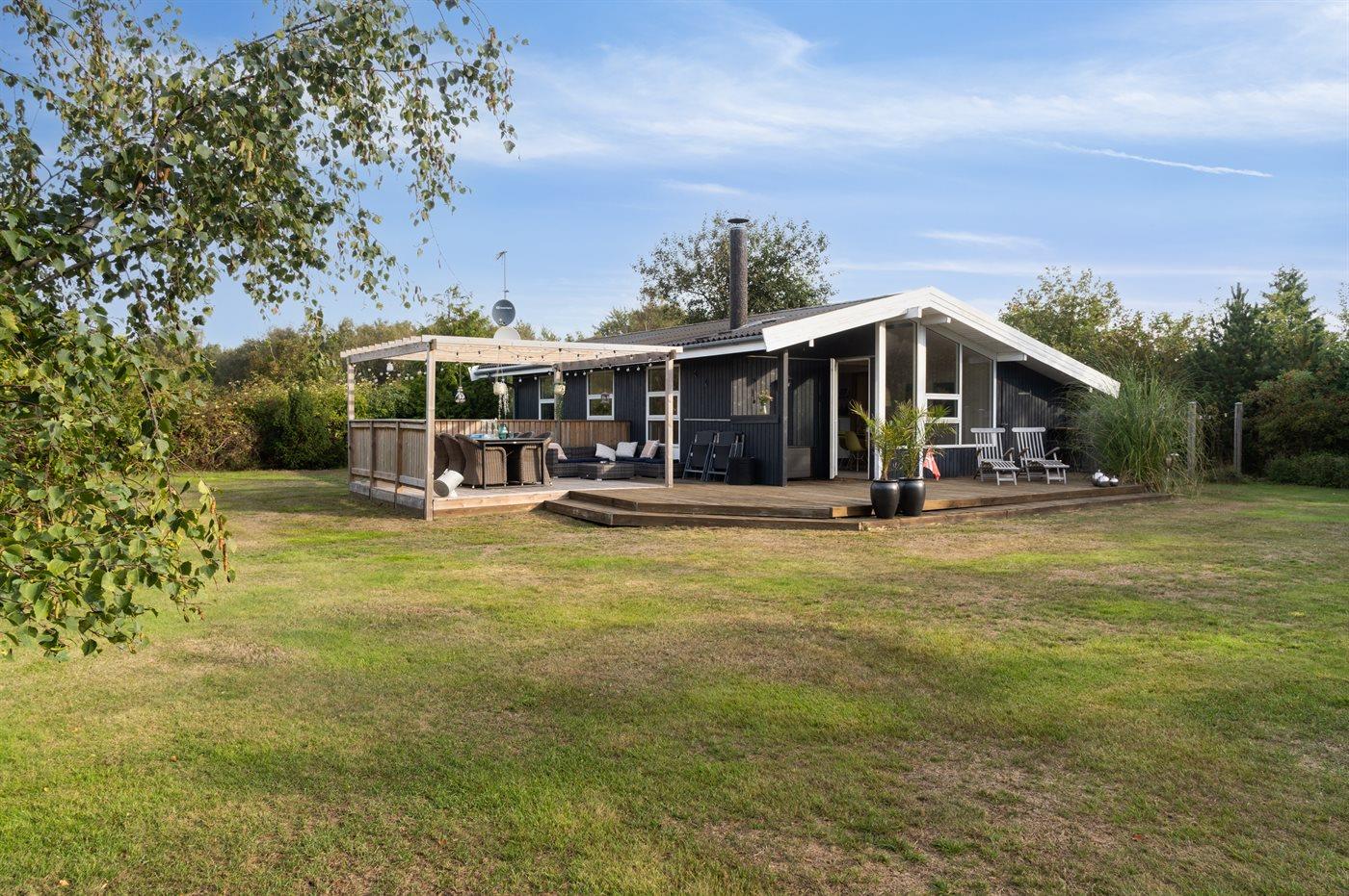 Ferieboligen er beliggende på en 1200 m² stor naturgrund. Der er 300 m til havet. Nærmeste forretning er beliggende i en afstand af 2500 m. Til ferieboligen hører 32 m² terrasseareal. Desuden er der 6 m² overdækket terrasse. Der er redskabsrum. Grill til rådighed. Der er installeret stik til opladning af elbil. Med 11 kW ladeeffekt. Parkering ved ferieboligen.
