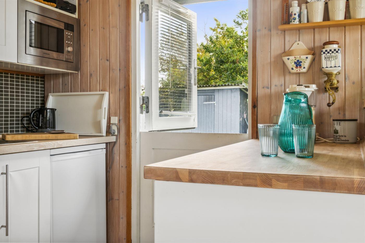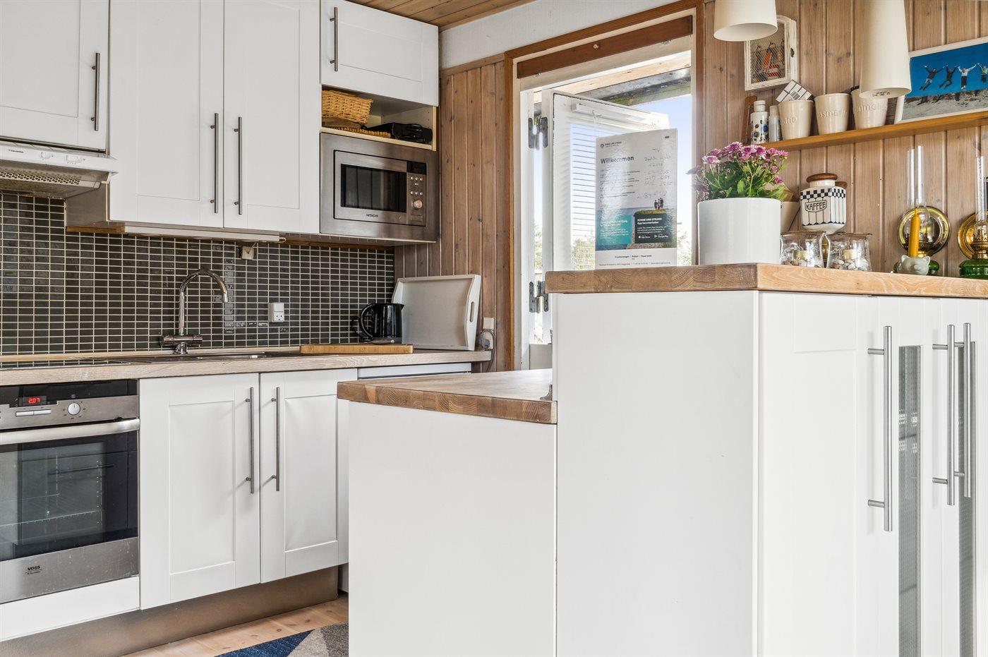 Køkkenet er udstyret med 1 køleskab. Der er 4 keramiske kogeplader, varmluftovn, mikrobølgeovn.