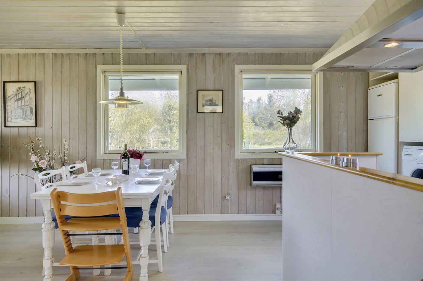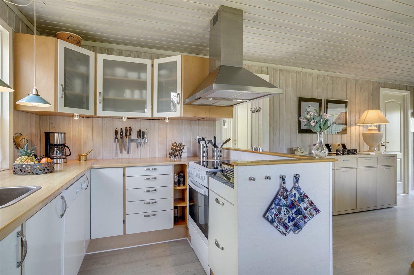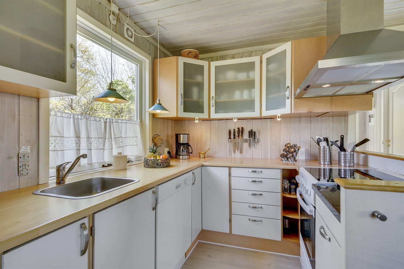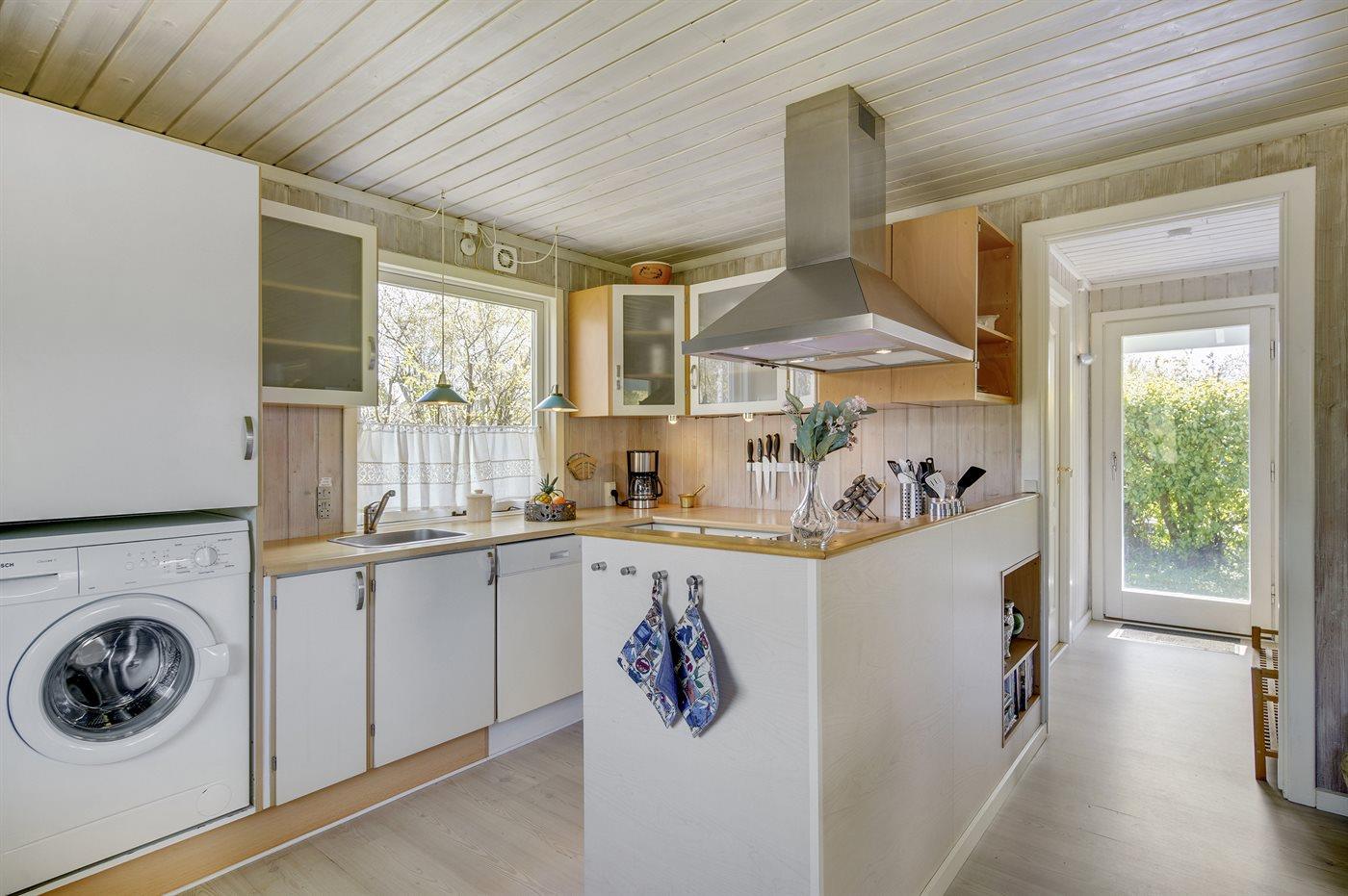 Køkkenet er udstyret med 1 køleskab. Der er 4 keramiske kogeplader, varmluftovn samt opvaskemaskine.