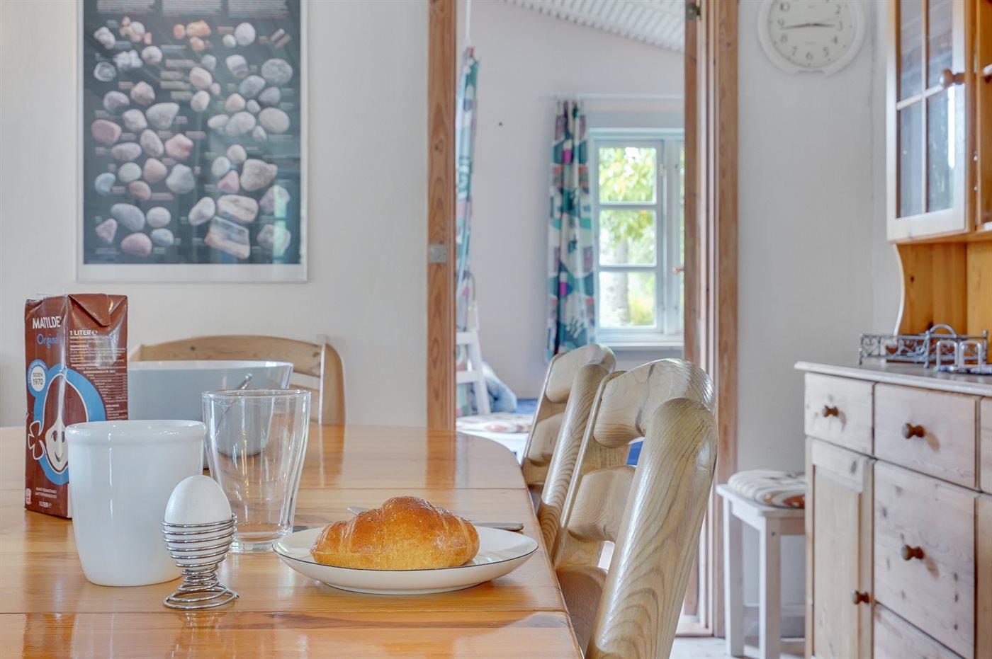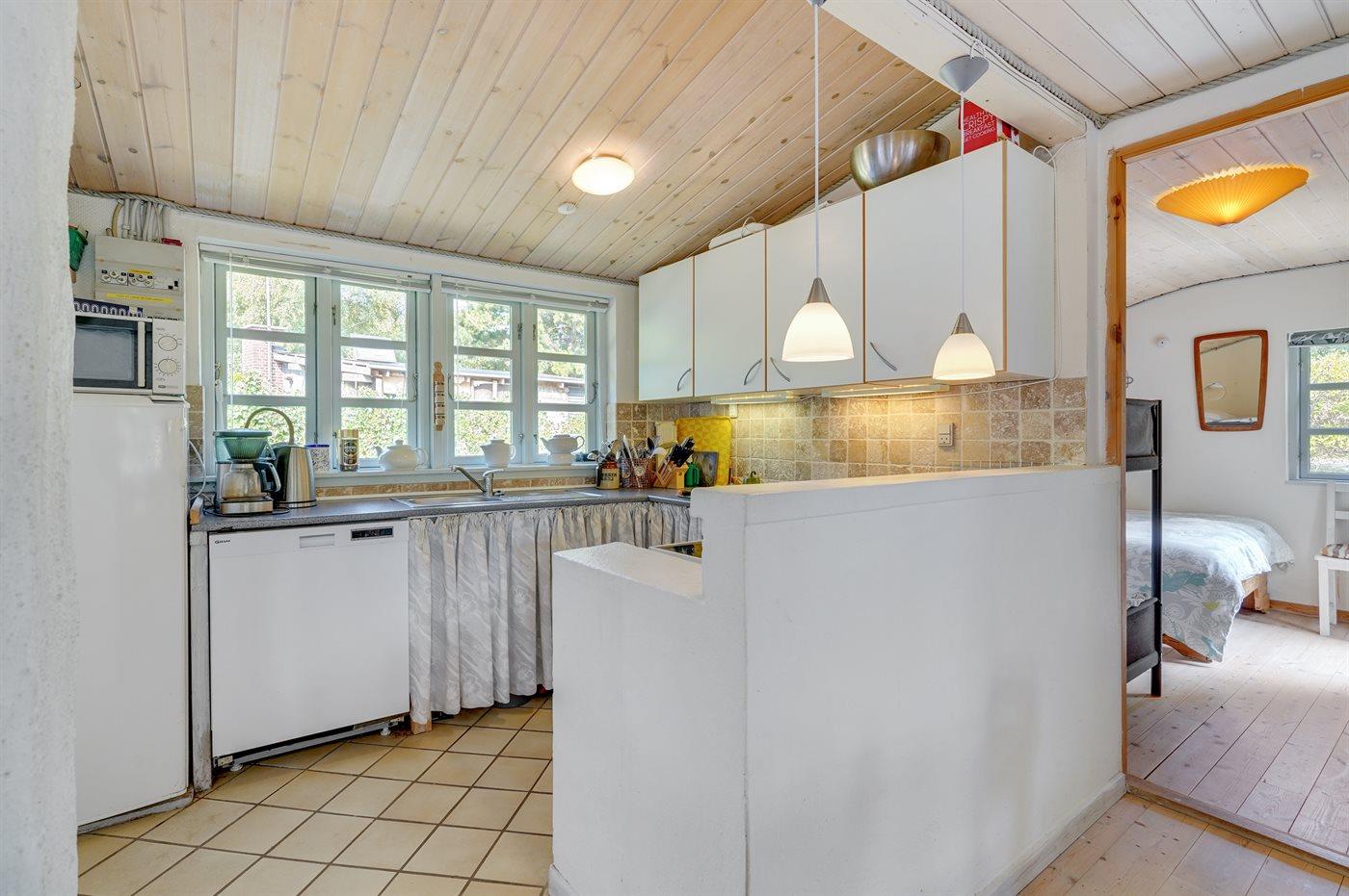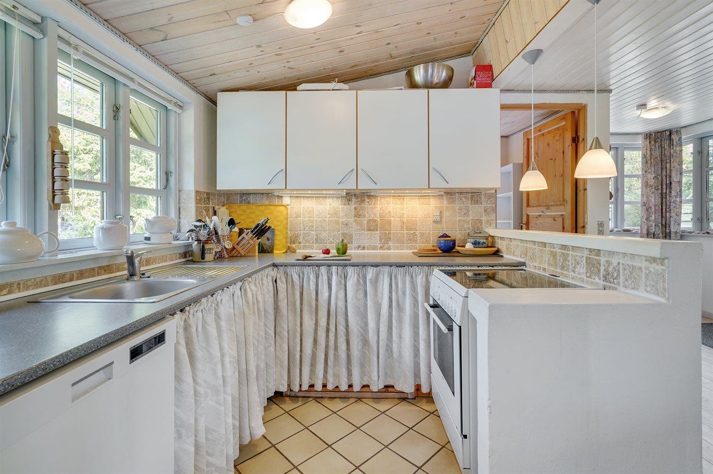 Køkkenet er udstyret med 1 køleskab. Der er 4 keramiske kogeplader, varmluftovn, mikrobølgeovn samt opvaskemaskine.