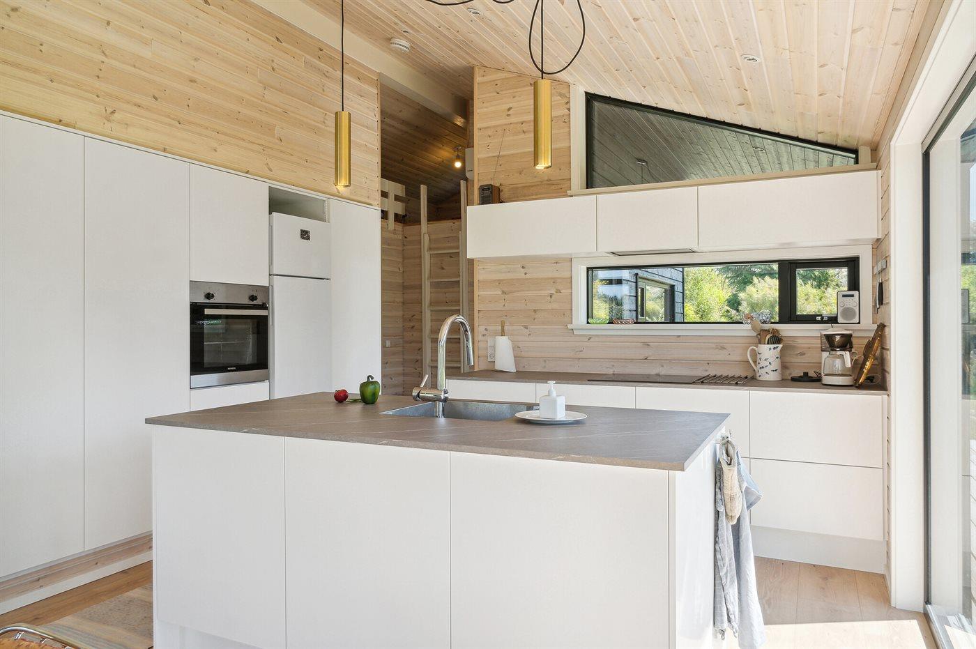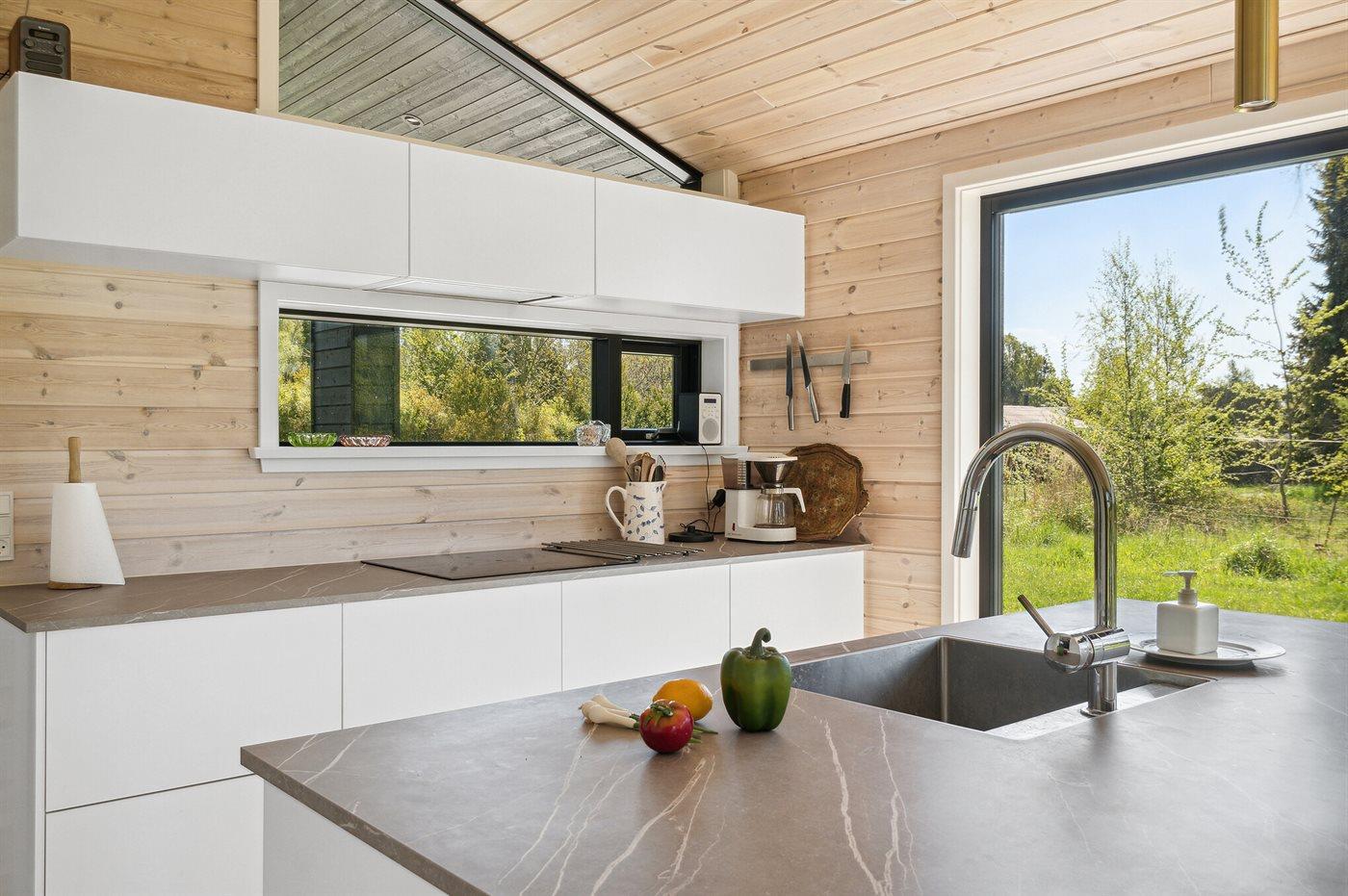 Køkkenet er udstyret med 1 køleskab. Der er 4 keramiske kogeplader, varmluftovn samt opvaskemaskine.