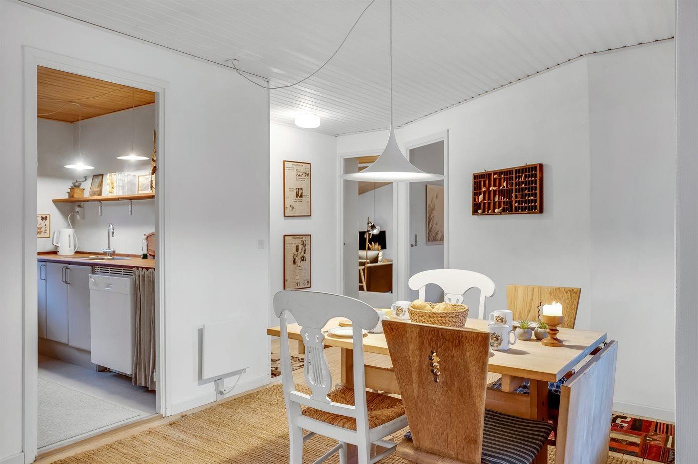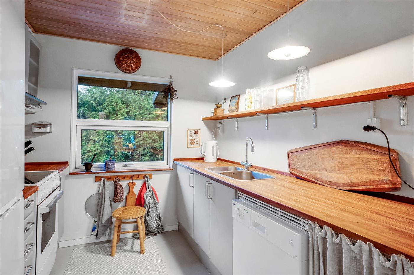 Køkkenet er udstyret med 1 køleskab. Der er 4 elkogeplader, varmluftovn, mikrobølgeovn samt opvaskemaskine.