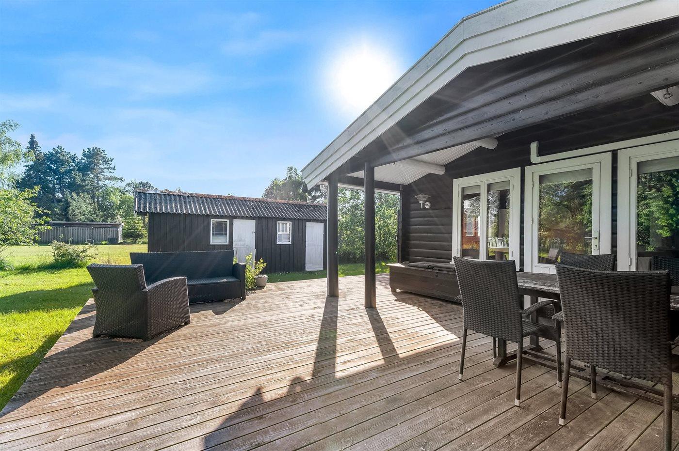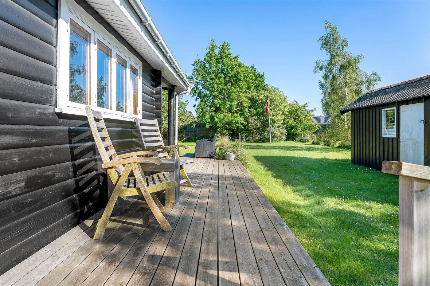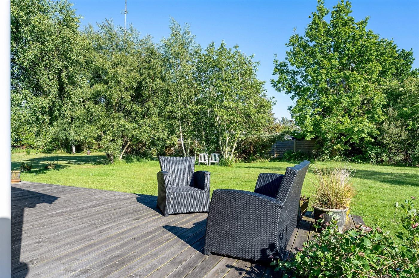 Til huset hører en dejlig stor terrasse, hvor der er god plads til masser af timer i det fri - her kan man nyde solen, læse en god bog og nyde sommerens grillaftener. Haven er velegnet til boldspil og leg.
