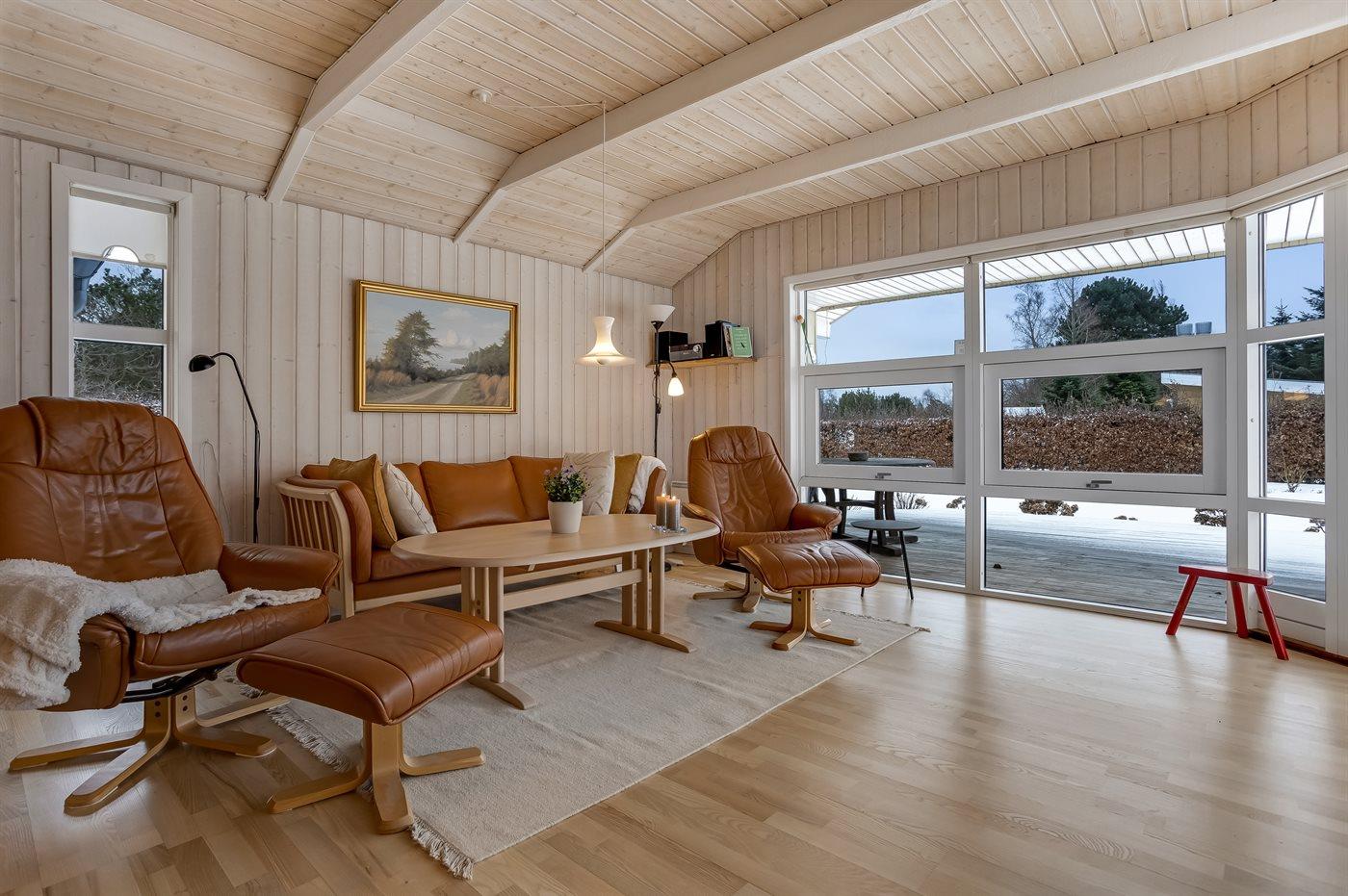 Sommerhuset er hyggeligt indrettet med åbent køkken og stue, hvorfra der er udsigt til den skønne have og en dejlig terrasse med havemøbler.