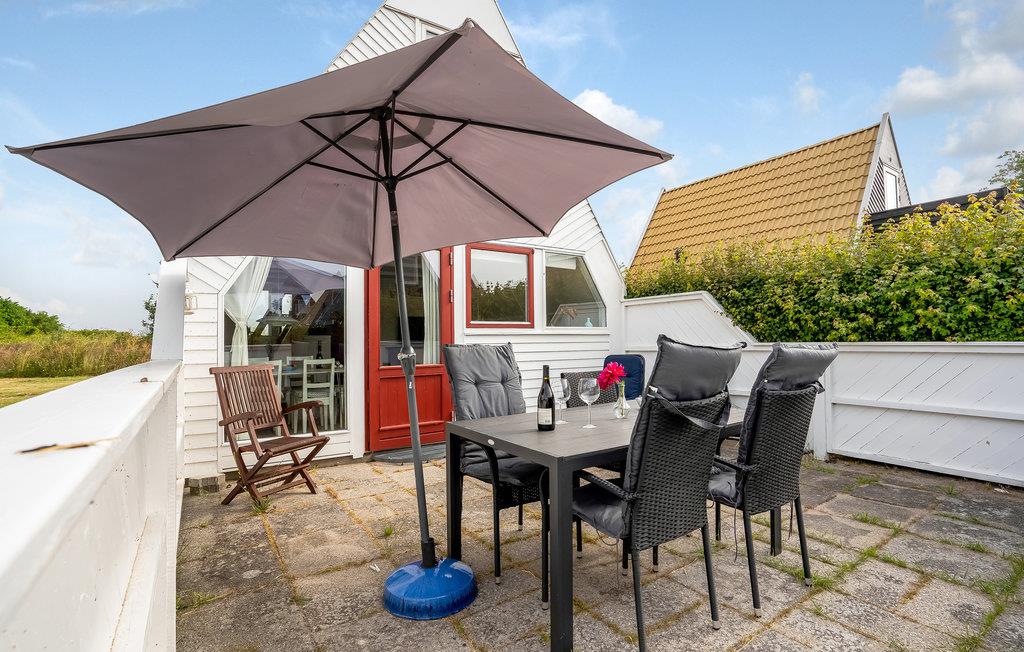 Hyggeligt feriehus ved vandet med havudsigt, terrasse og adgang til legeplads og tennisbane.