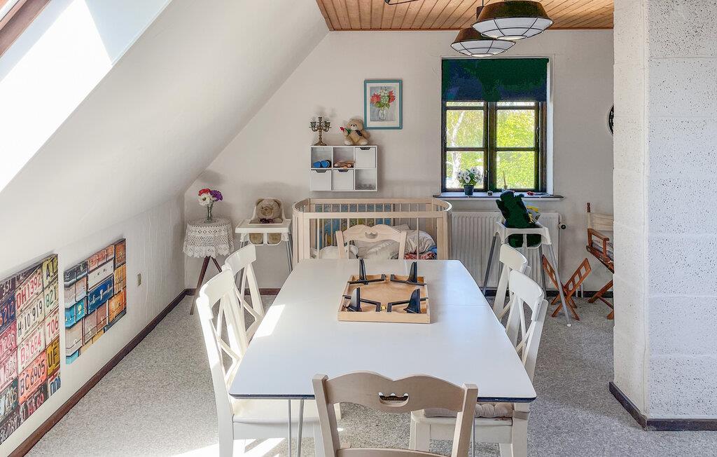 I dette feriehus bor I fredeligt og landligt, men kun en kort køretur fra kysten. Husets venlige atmosfære og velovervejede detaljer byder jer velkommen til en dejlig ferie. Indenfor venter hyggeligt indrettede rum med god plads til fælles stunder. Slap af på den store hjørnesofa, læs en bog, eller planlæg jeres næste udflugt ved det lange spisebord. Det lyse, åbne køkken har både spiseplads og en skøn udsigt til det grønne. På førstesalen findes yderligere siddepladser, et fjernsyn og et legeområde – ideelt for børn eller rolige aftener med familie og venner.