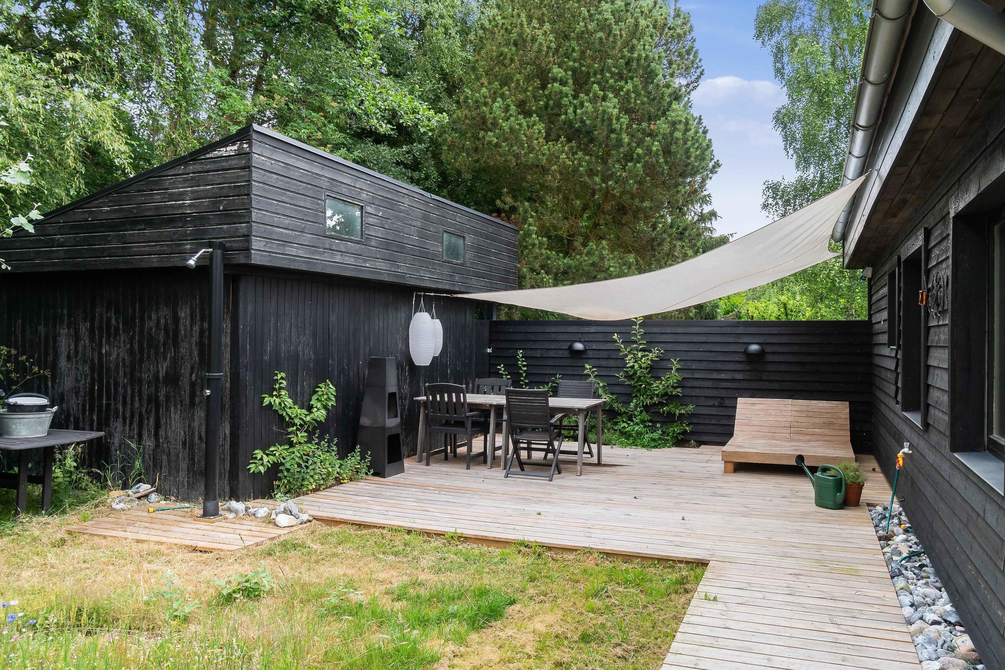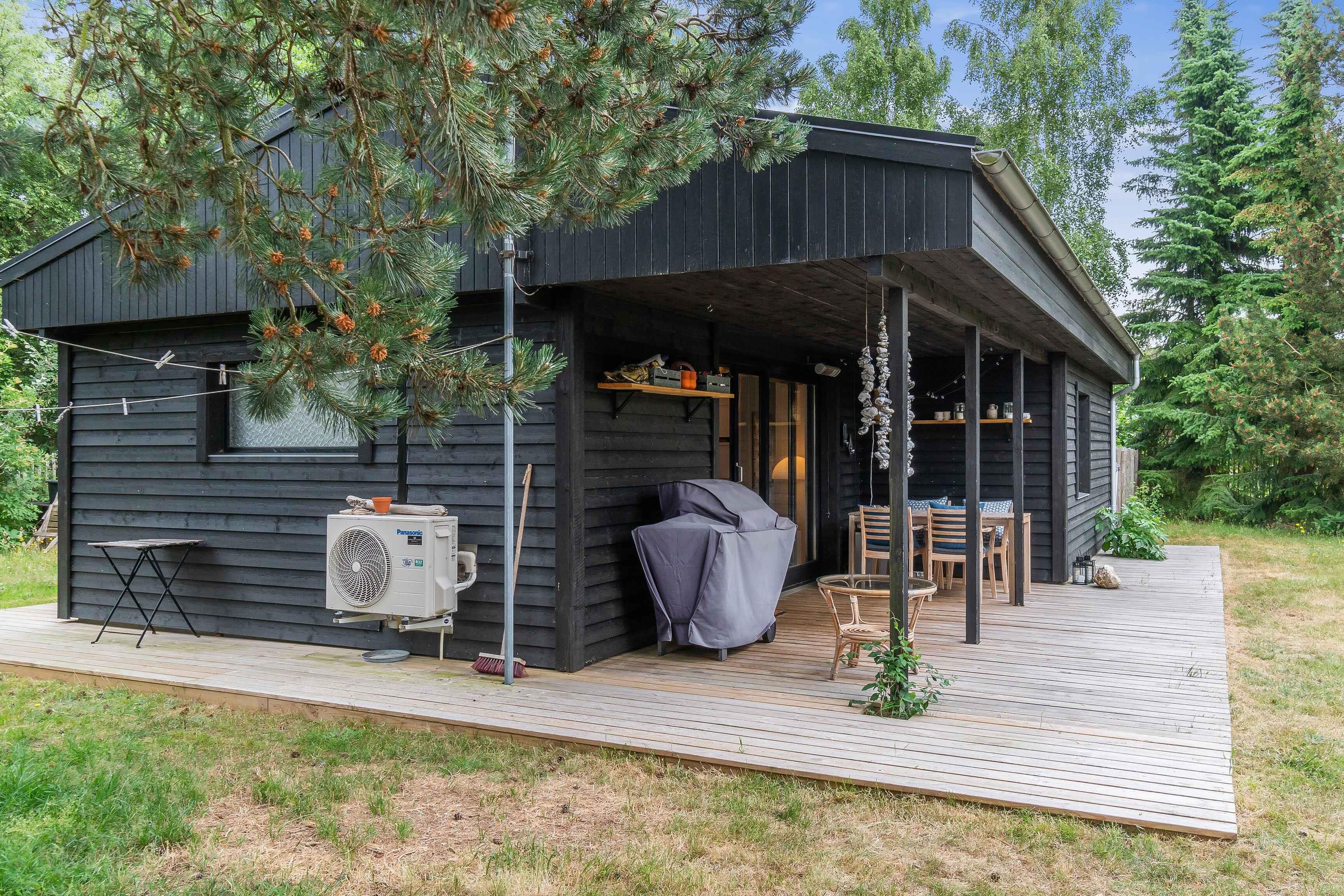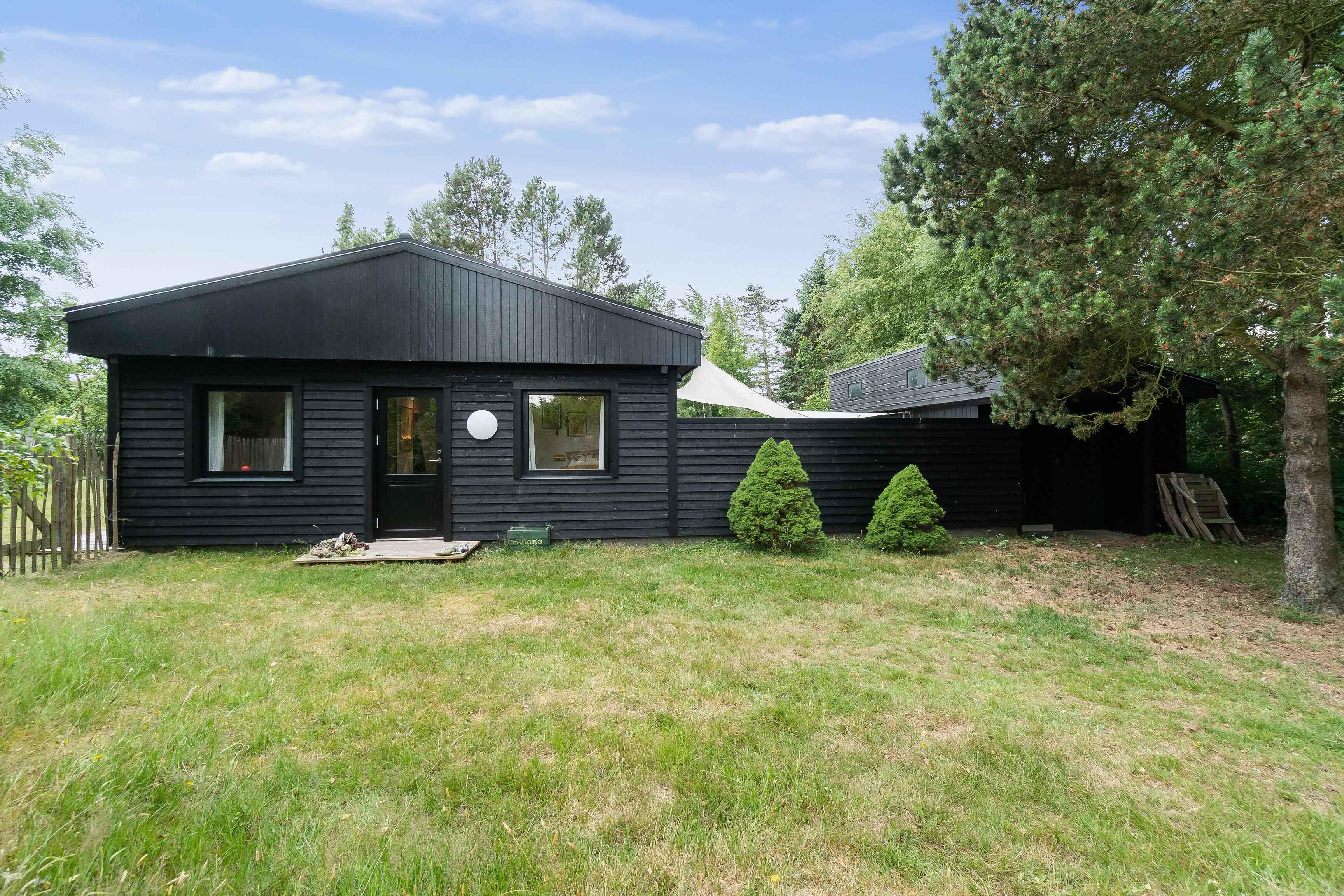 Istandsat sort træsommerhus i smagfuld 1970'er-stil. Perfekte rammer til afslapning og hygge. Ude finder I lukket vild-med-vilje have, bålplads, shelter og gode terrasser. Inde er veludstyret køkken, brændeovn, brætspil og fjernsyn til filmaftener.