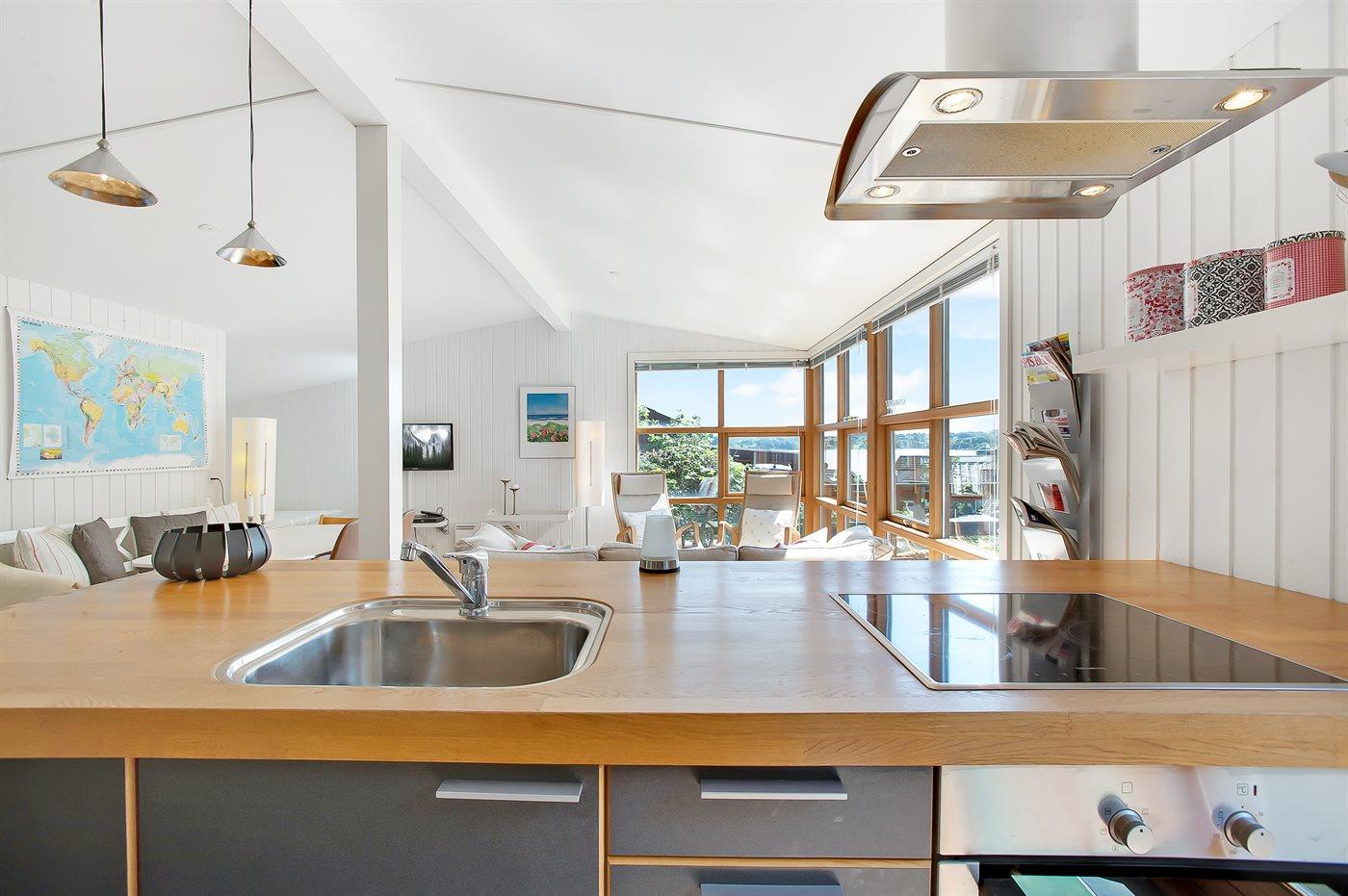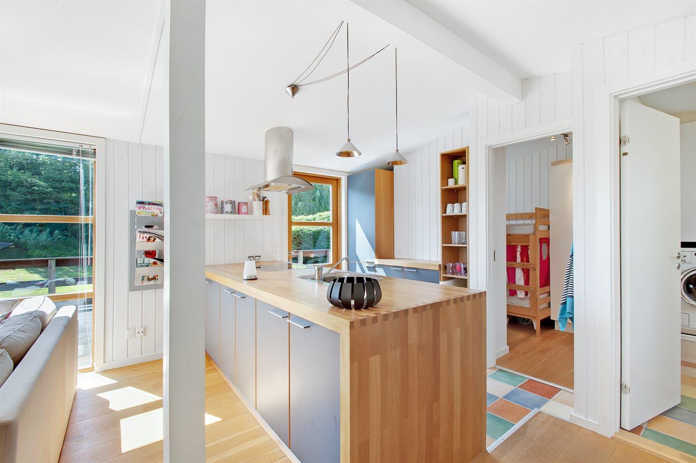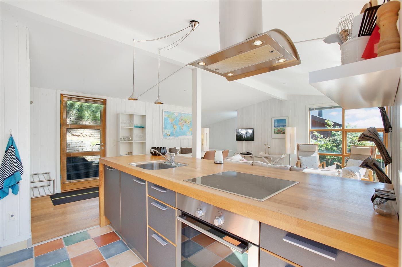 Køkkenet er udstyret med 1 køleskab. Der er 4 keramiske kogeplader, varmluftovn samt opvaskemaskine.