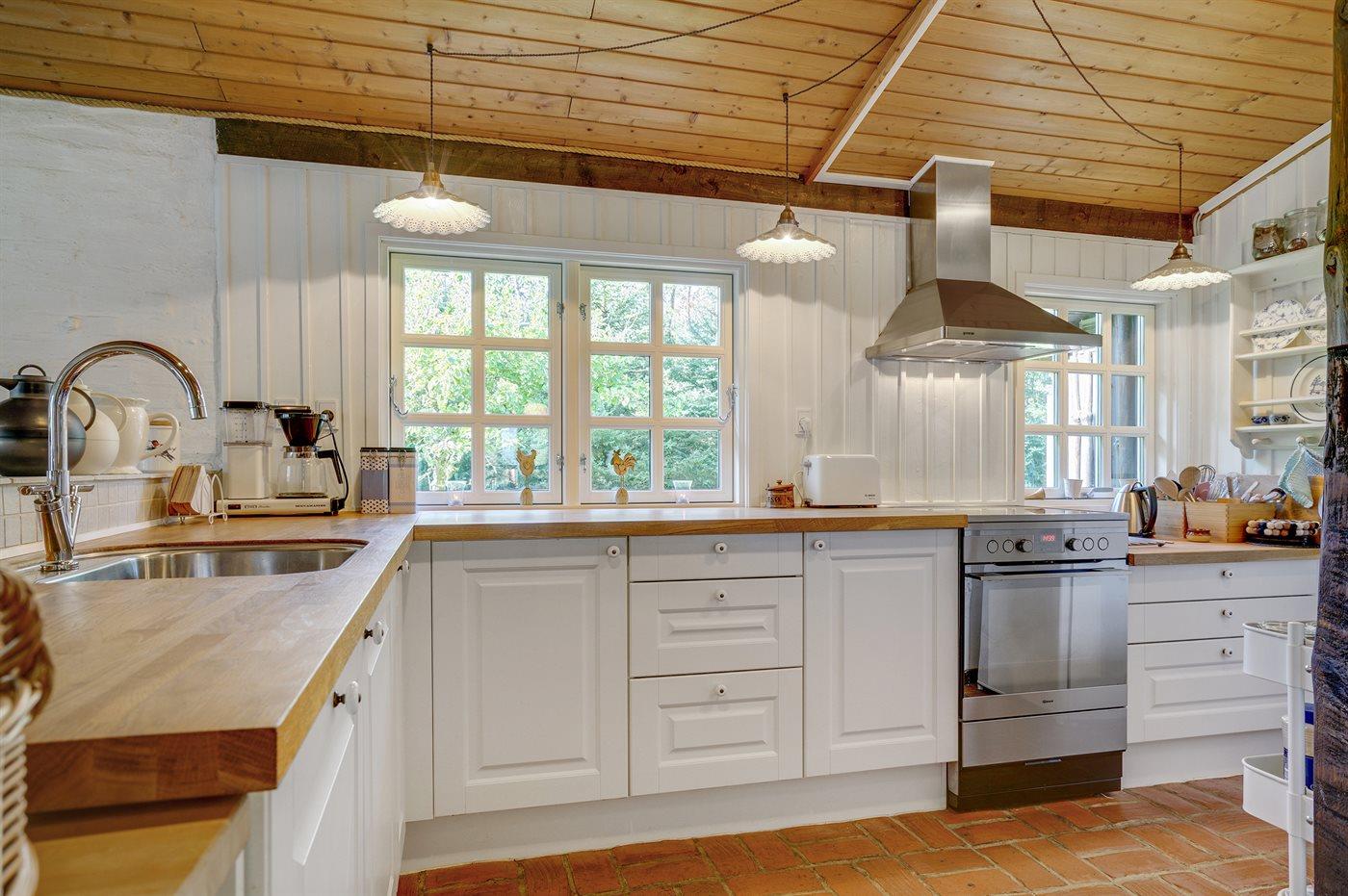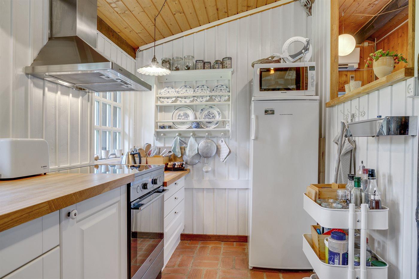 Køkkenet er udstyret med 2 køleskabe. Der er 4 induktionskogeplader, varmluftovn, mikrobølgeovn samt opvaskemaskine.