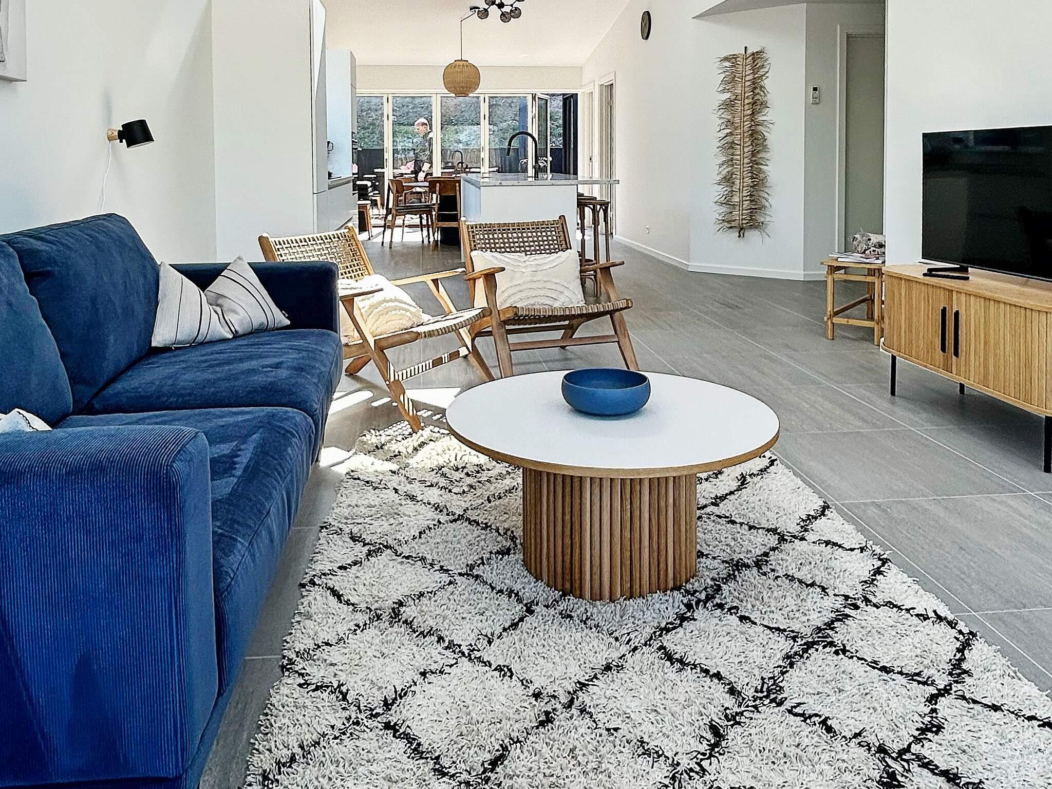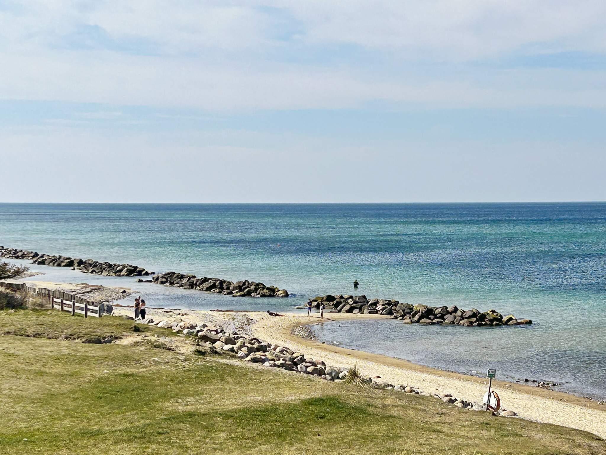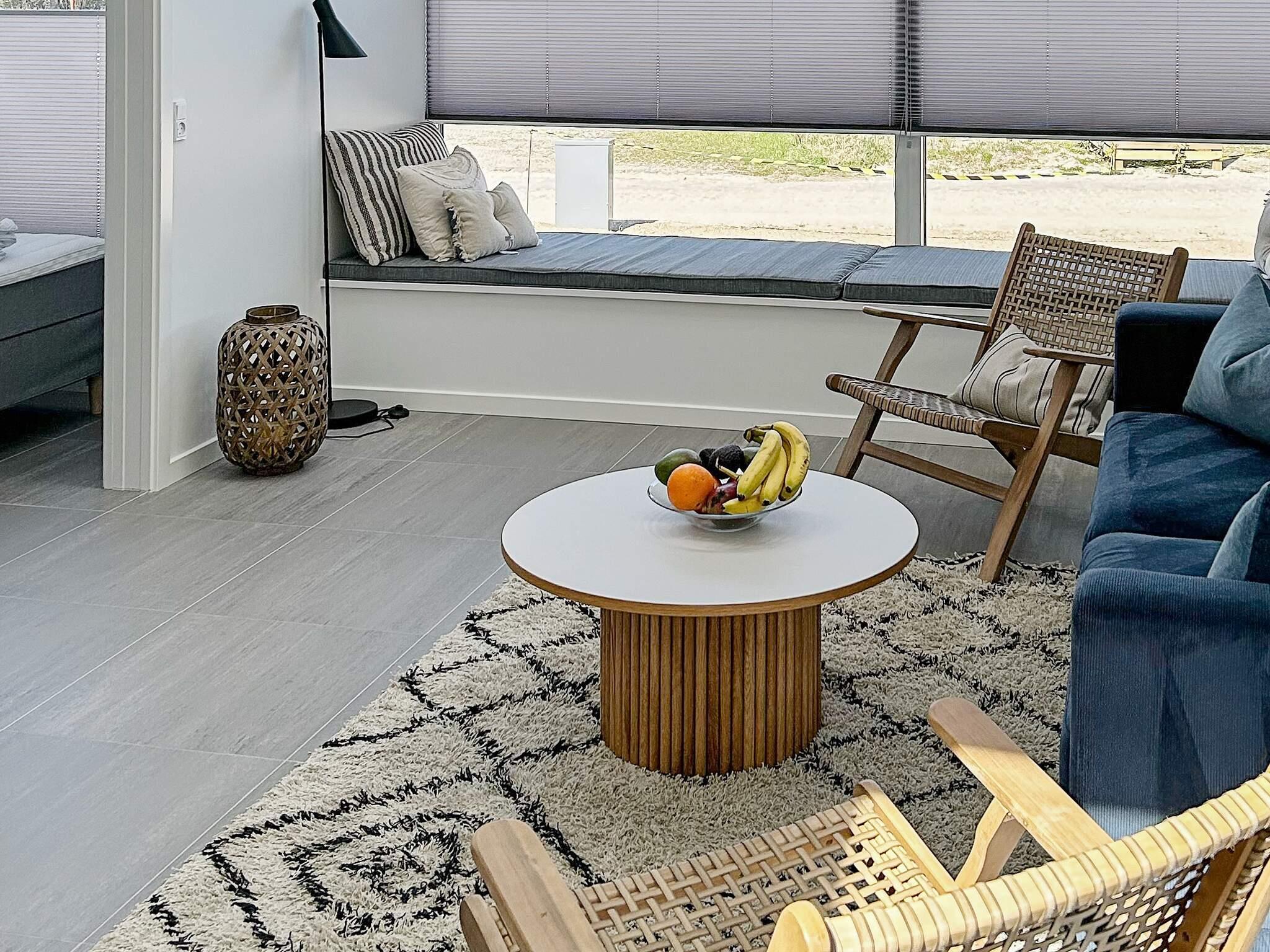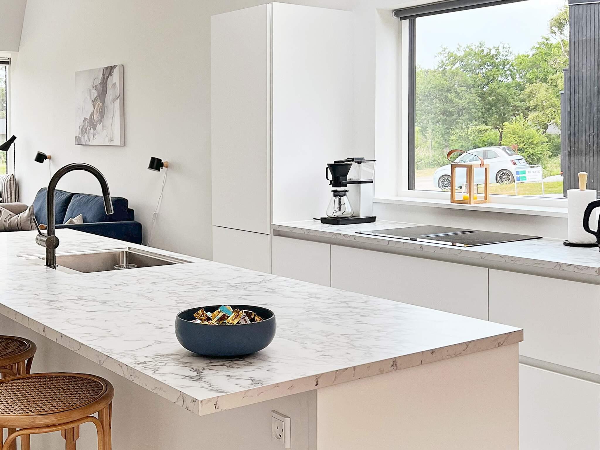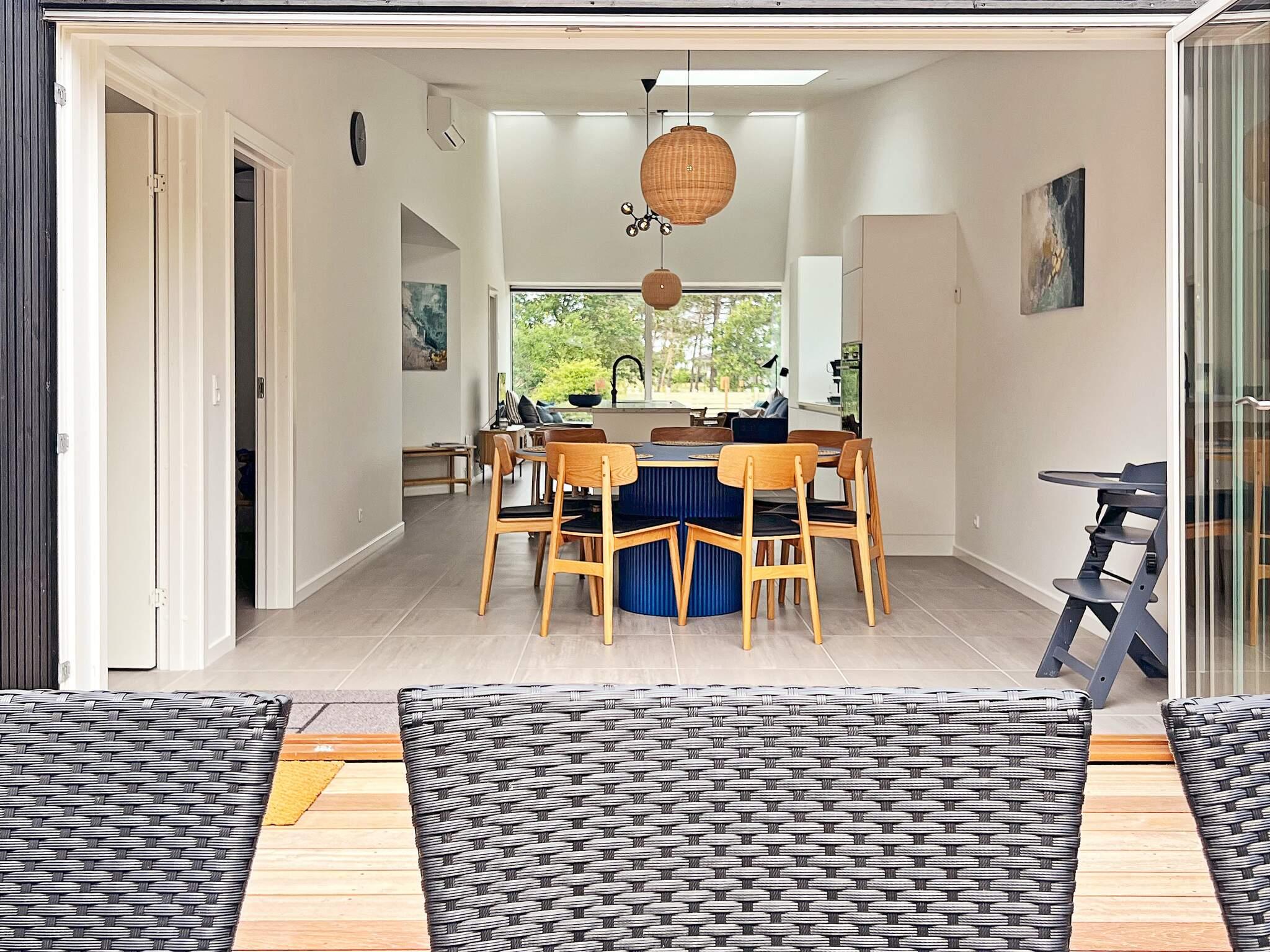 Huset har panoramavinduer, en lys karnap og en fantastisk udsigt, alt sammen kun omkring 150 meter fra kysten. Indenfor skaber et åbent køkken og opholdsstue med højt til loftet et lyst og indbydende rum for familielivet. Det moderne køkken indeholder kogeø, opvaskemaskine, induktionskomfur med integreret emhætte, ovn og køle-fryseskab. Tagvinduer kan åbnes for at slippe varme ud på varme sommerdage, hvilket holder interiøret frisk og behageligt.