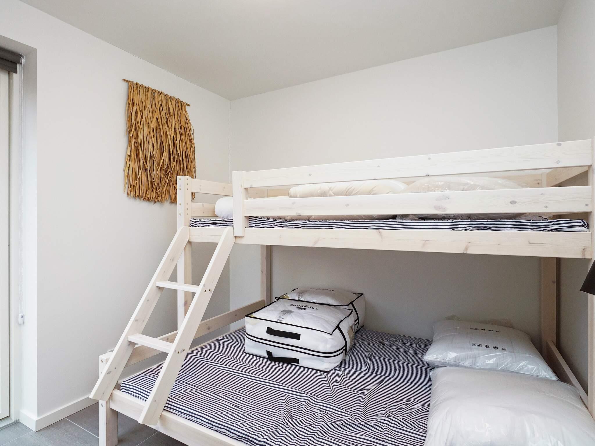 Alle rum, inklusive de to badeværelser, er monteret med gulvvarme leveret af en energirigtig varmepumpe. Huset har tre soveværelser: to med dobbeltsenge og et med en køjeseng med tre køjer, hvilket gør det ideelt for familier eller små grupper. Et praktisk bryggers med vaskemaskine tilføjer komfort til længere ophold.
