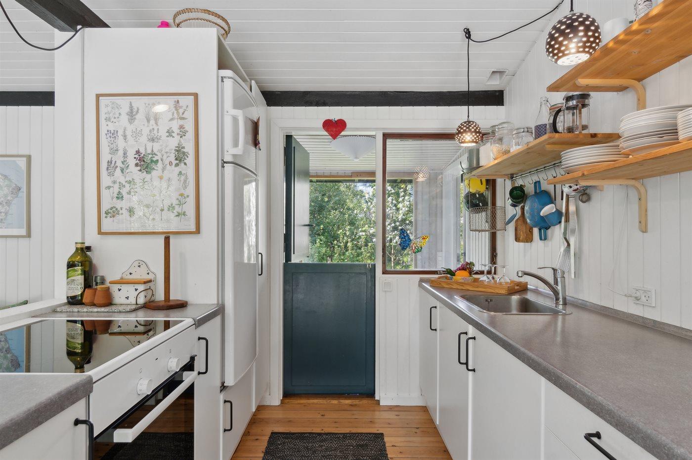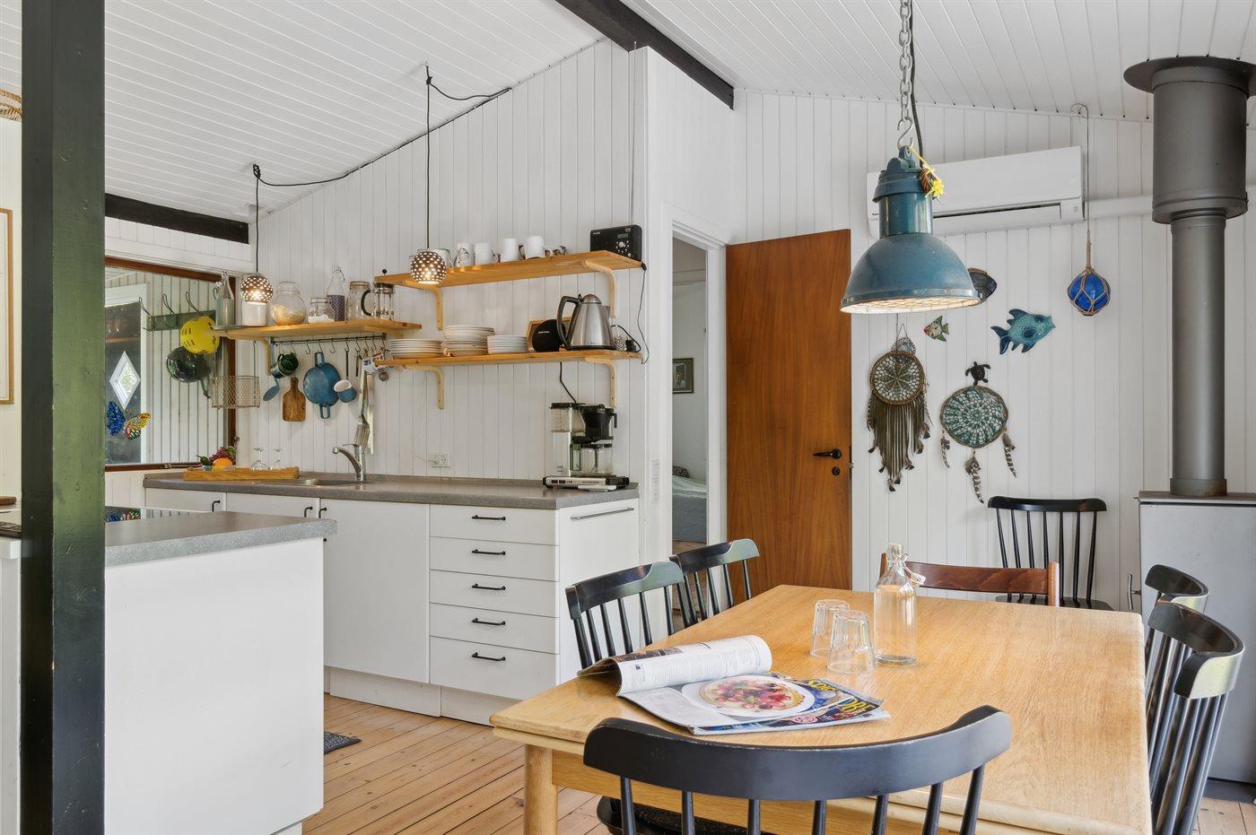 Køkkenet er udstyret med 1 køleskab. Der er 3 keramiske kogeplader, varmluftovn samt opvaskemaskine (bordmodel).