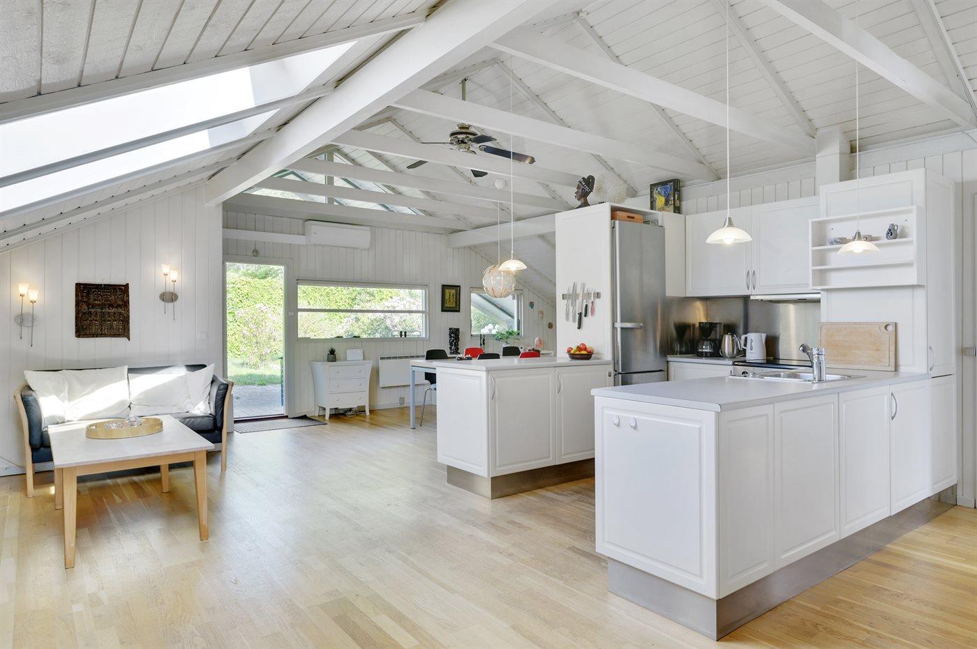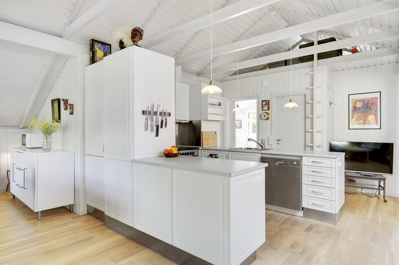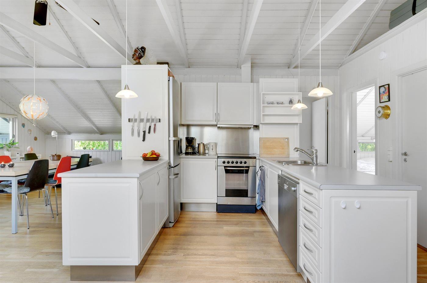 Køkkenet er udstyret med 1 køleskab. Der er 1 elkogeplader. Der er 4 keramiske kogeplader, varmluftovn, mikrobølgeovn samt opvaskemaskine.