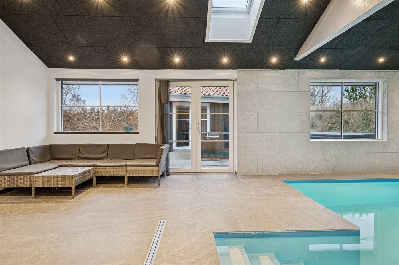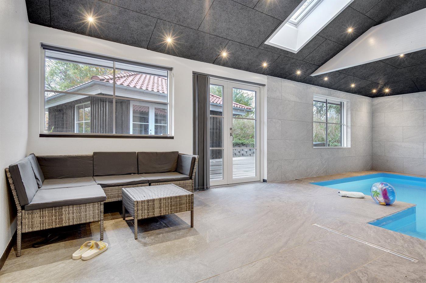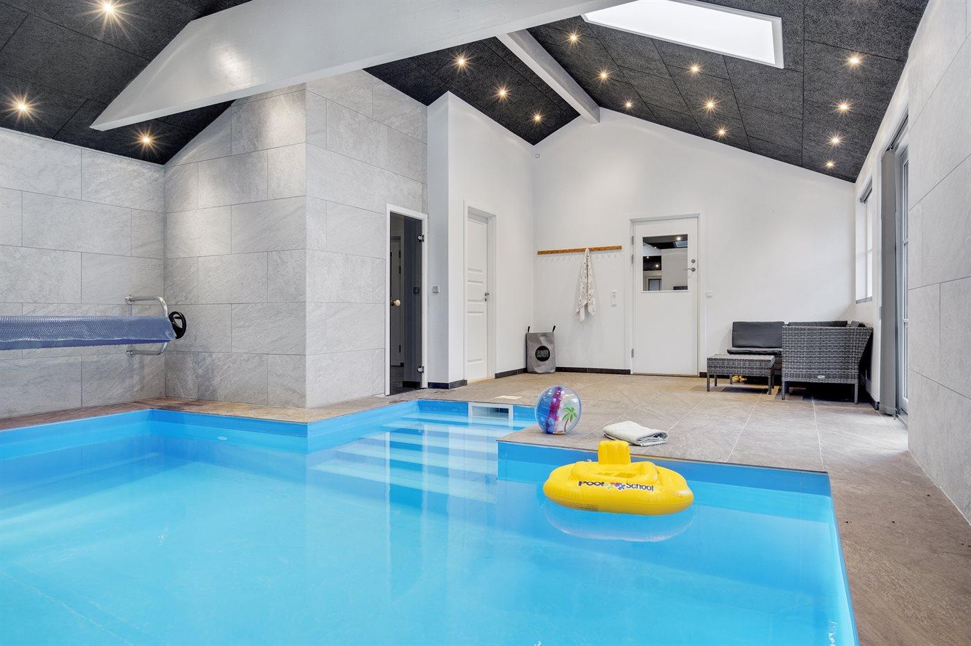 I den indendørs swimmingpool er der mulighed for leg og hyggeligt samvær. Swimmingpoolen måler op til 5 m i bredden, 6 m i længden og den er op til 1,5 m dyb. Vandet er mellem 24 og 28° C varmt. Der er gulvvarme i swimmingpoolområdet.