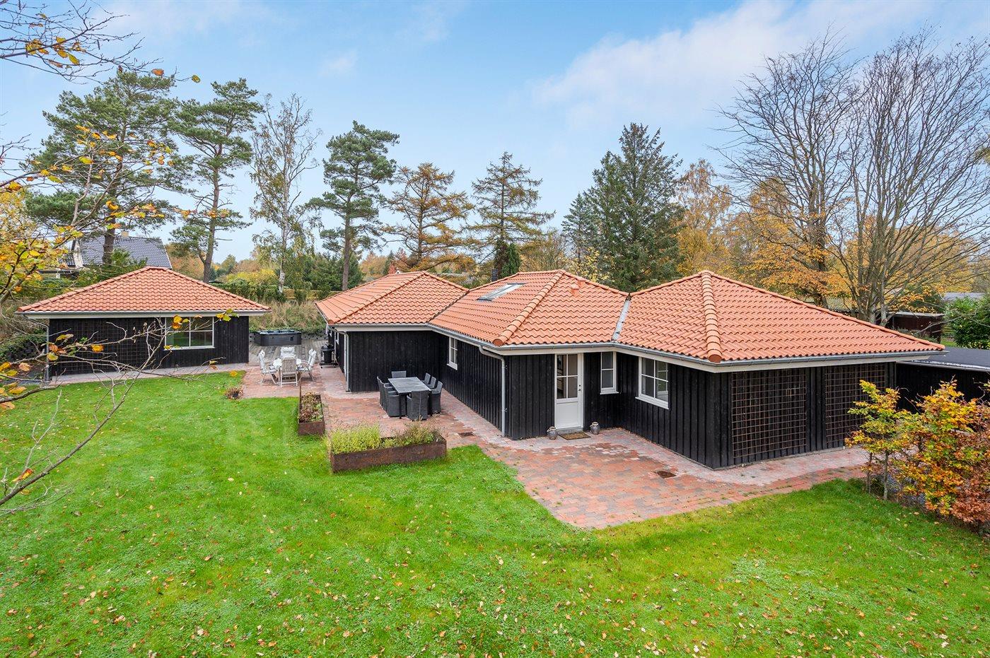 Luksuriøst sommerhus i Gilleleje med opvarmet pool, sauna og udendørs spa nær strand og byliv.