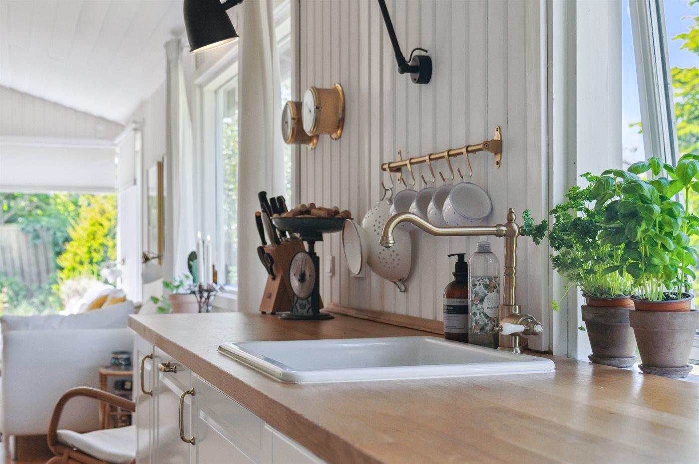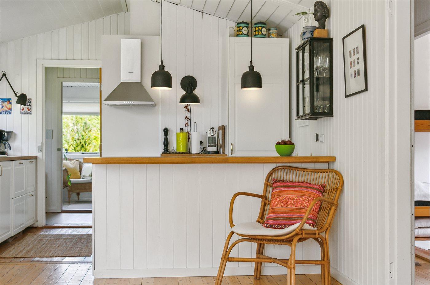 Køkkenet er udstyret med 1 køleskab. Der er 4 keramiske kogeplader, varmluftovn, mikrobølgeovn samt opvaskemaskine.