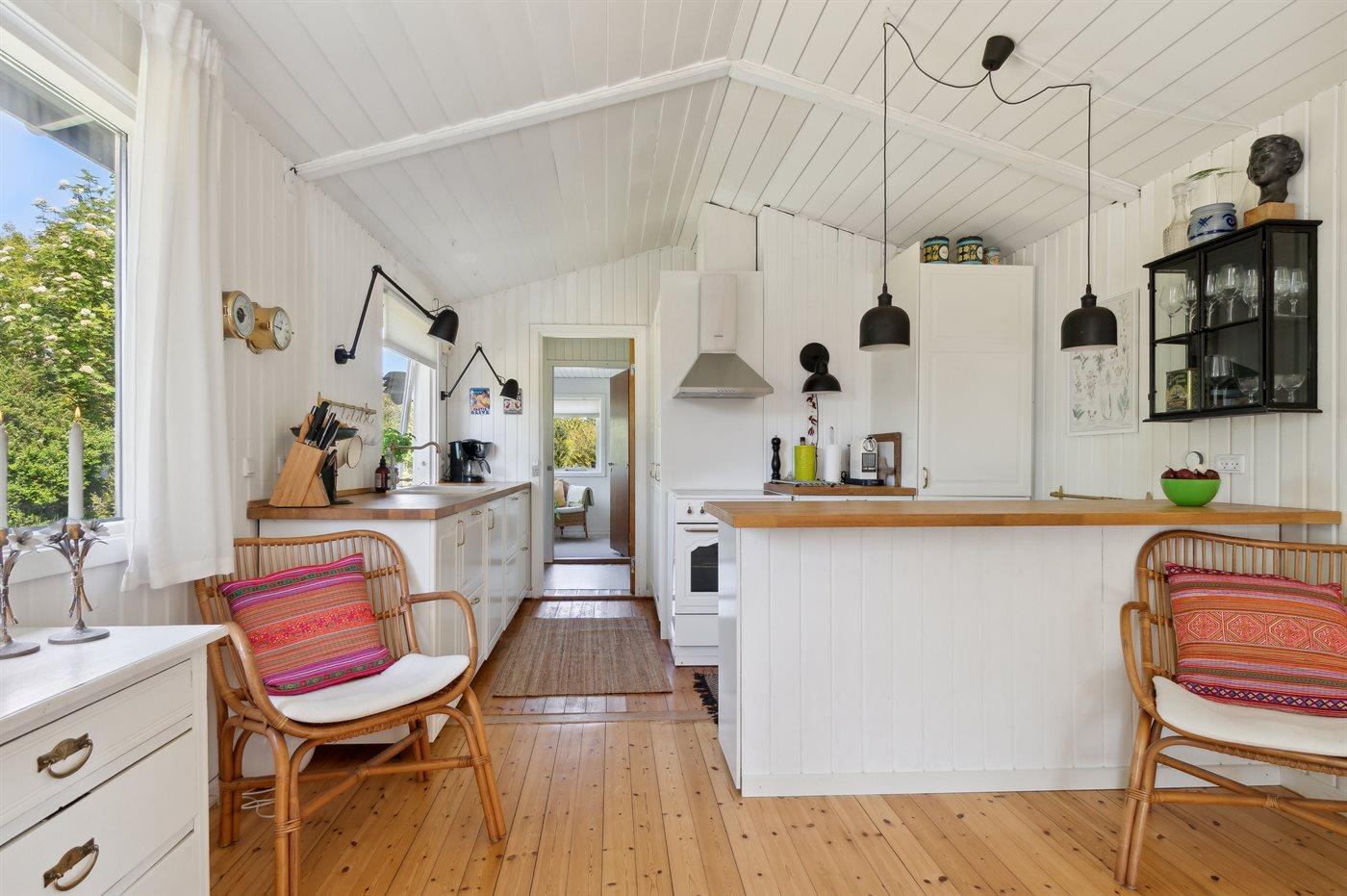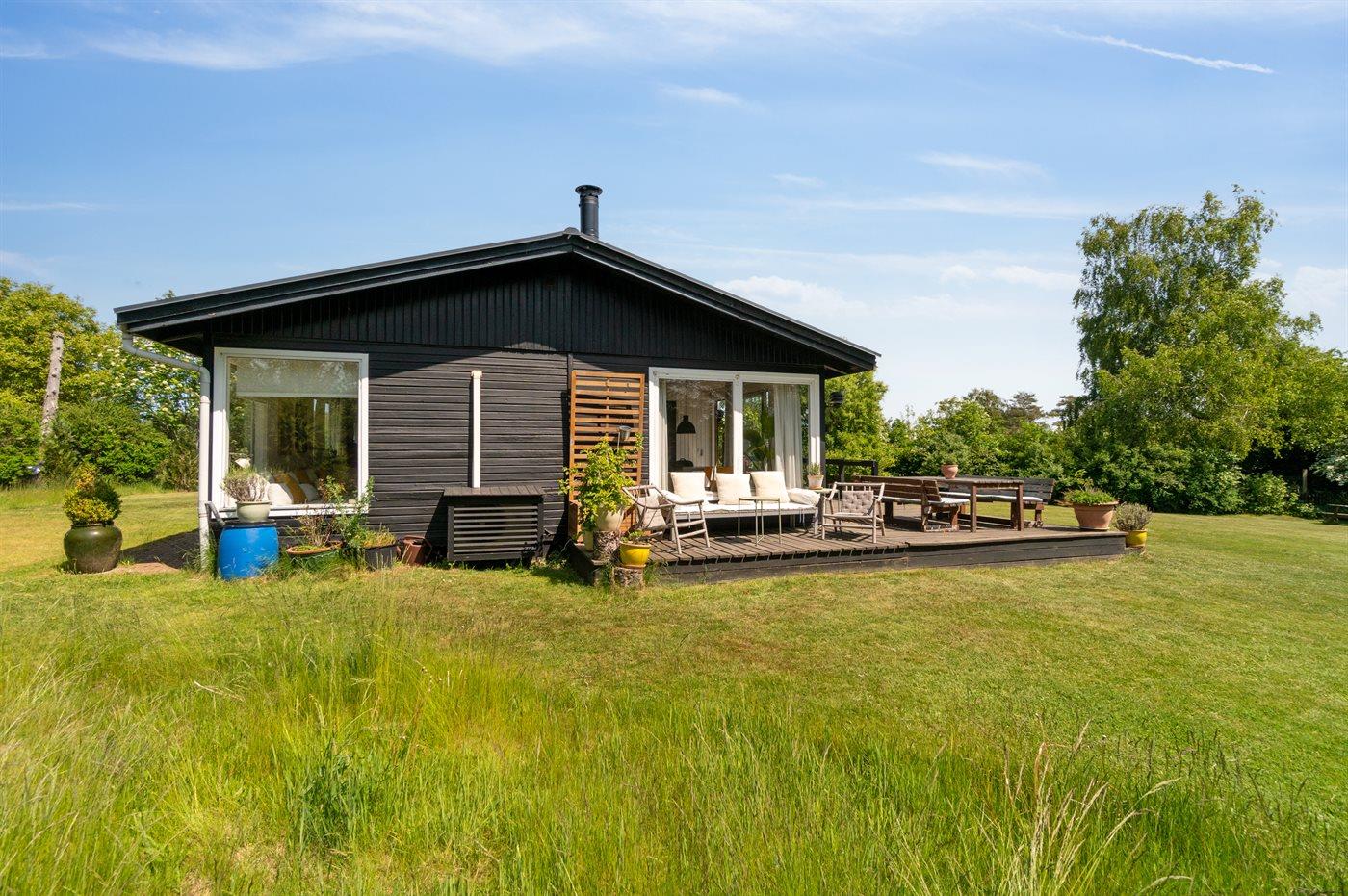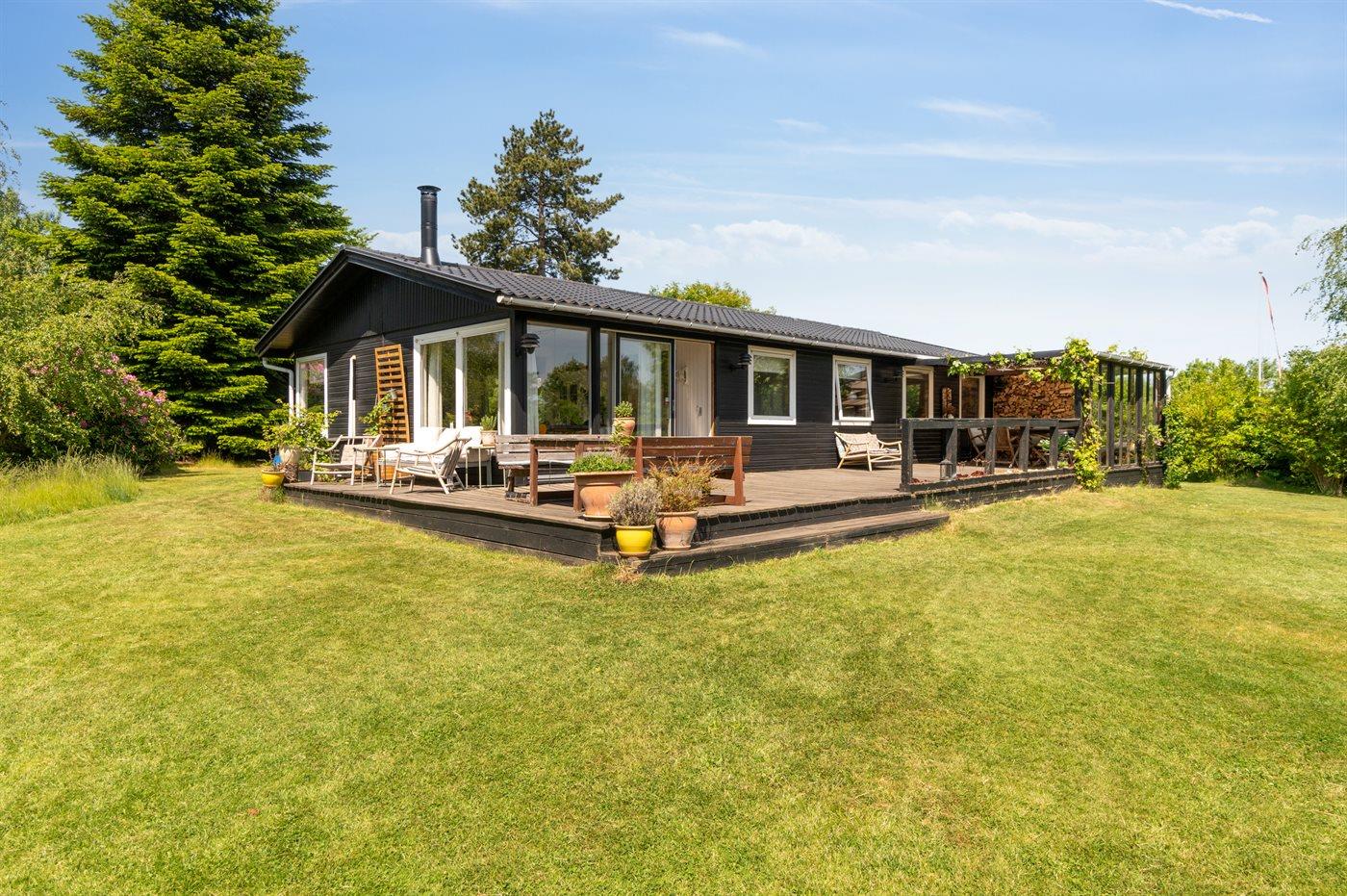 Dette rummelige sommerhus byder på et stort køkken i åben forbindelse med en hyggelig og lys stue og spiseplads. Her er rig mulighed for hygge og samvær. Fra spisestuen er der direkte udgang til haven og den store træterrasse, hvor en del er overdækket. Den store have er indhegnet med et 65 cm højt hegn og indbyder til leg og boldspil. Huset indeholder 3 soveværelser og 1 badeværelse med bruseniche. Der er desuden vaskemaskine og tørretumbler. Der er etableret fibernet.