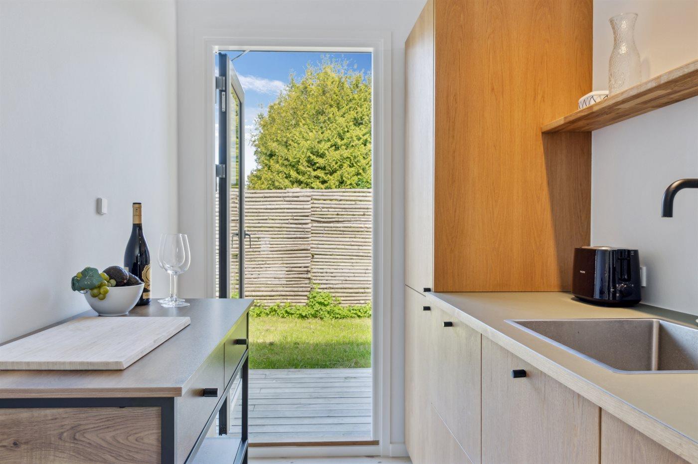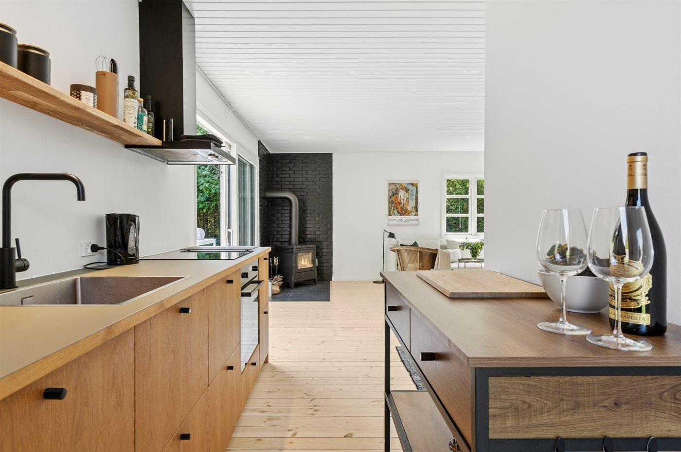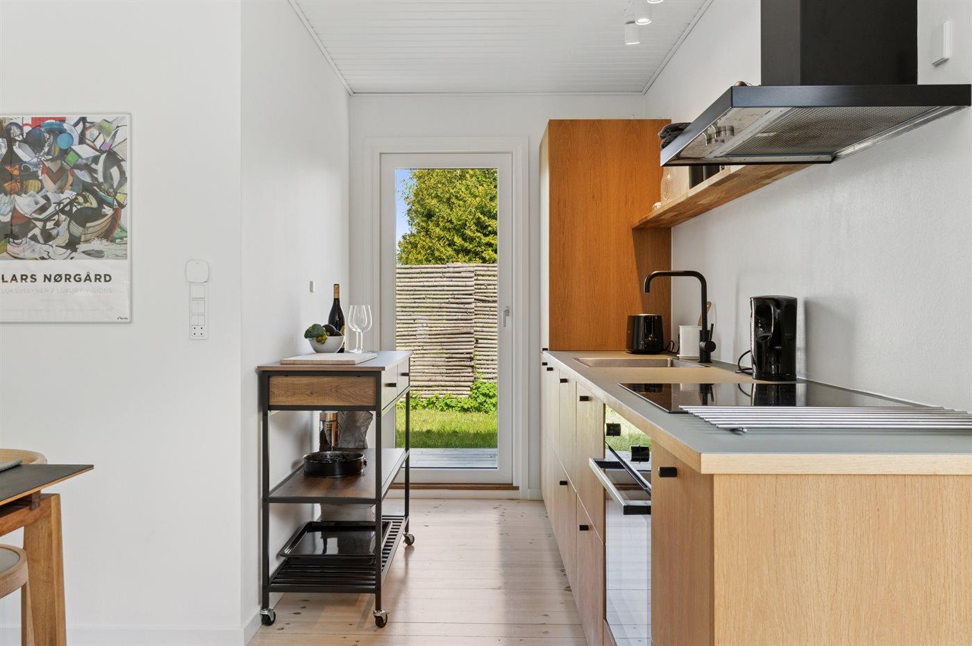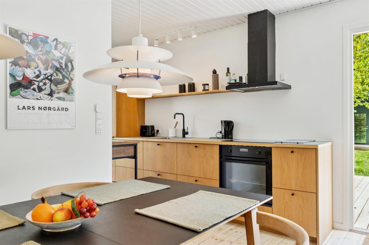 Køkkenet er udstyret med 1 køleskab. Der er 4 induktionskogeplader, varmluftovn samt opvaskemaskine.