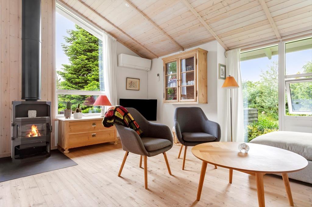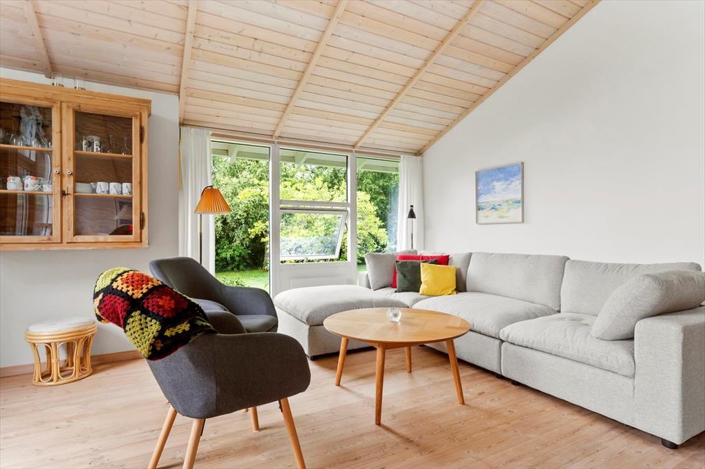 Træd ind i et lyst og indbydende sommerhus, hvor stemningen er afslappet og hyggelig. Opholdsstuen danner husets hjerte med sine komfortable møbler og store vinduer, der lader dagslyset strømme ind. Her kan du nyde en rolig stund med en bog, et spil eller en god film.