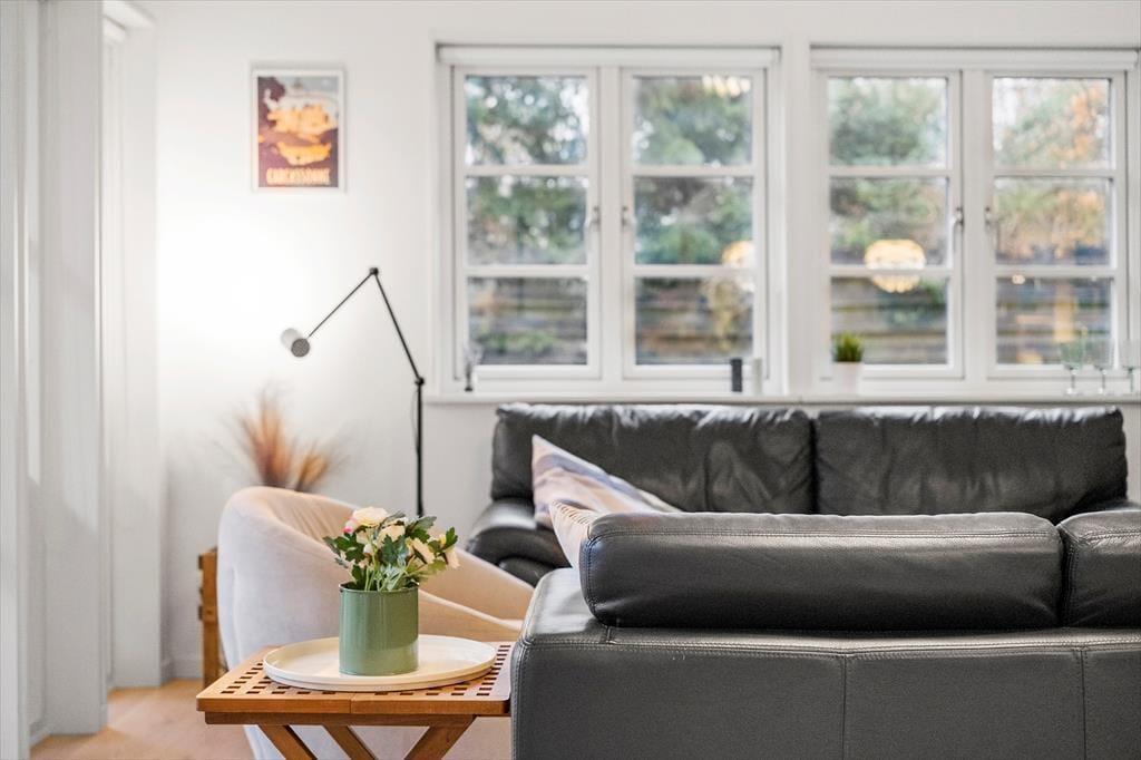 Stuen er indrettet med komfortable møbler, perfekt til afslapning foran fjernsynet eller med en god bog i hånden.