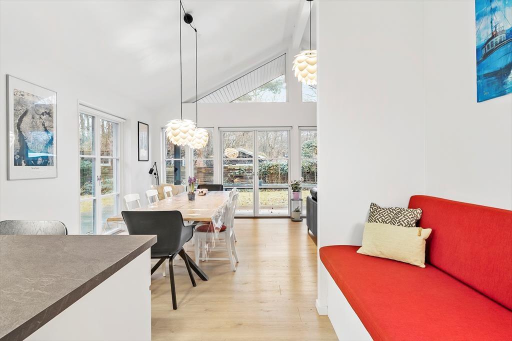Så snart du træder ind i sommerhuset, mærker du den rummelige og indbydende stemning. De store vinduer lader dagslyset strømme ind, og den åbne planløsning skaber en harmonisk forbindelse mellem køkken, spiseområde og stue.